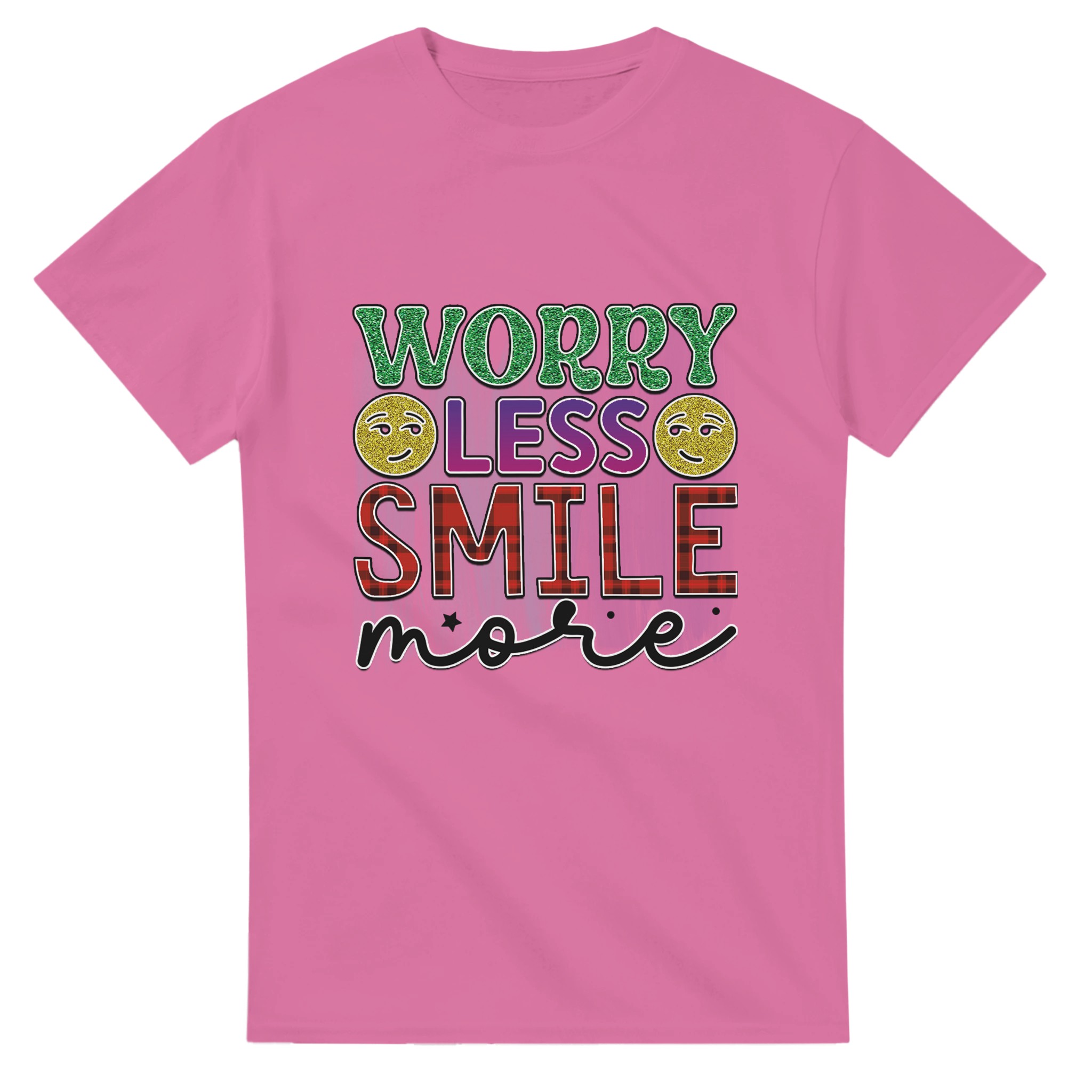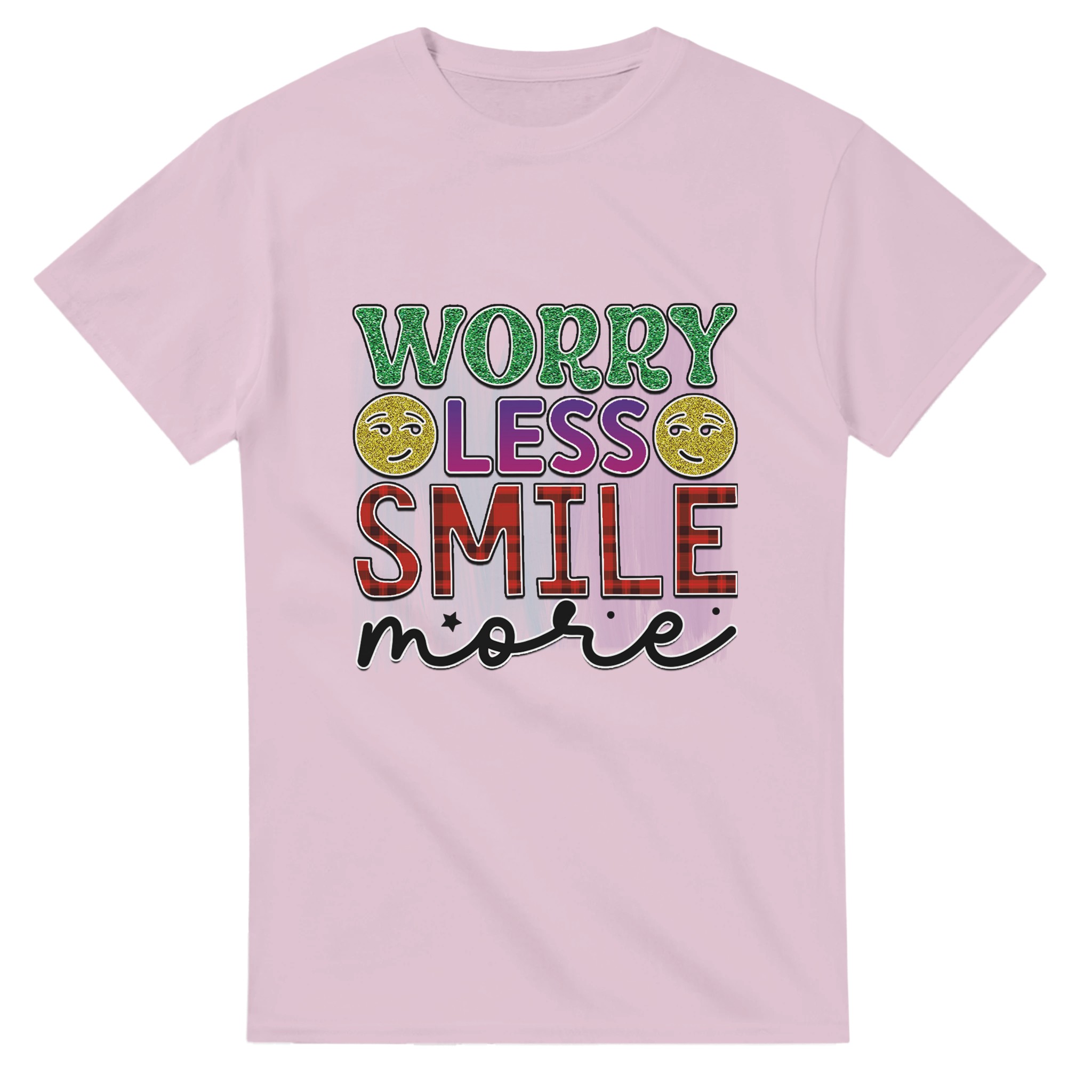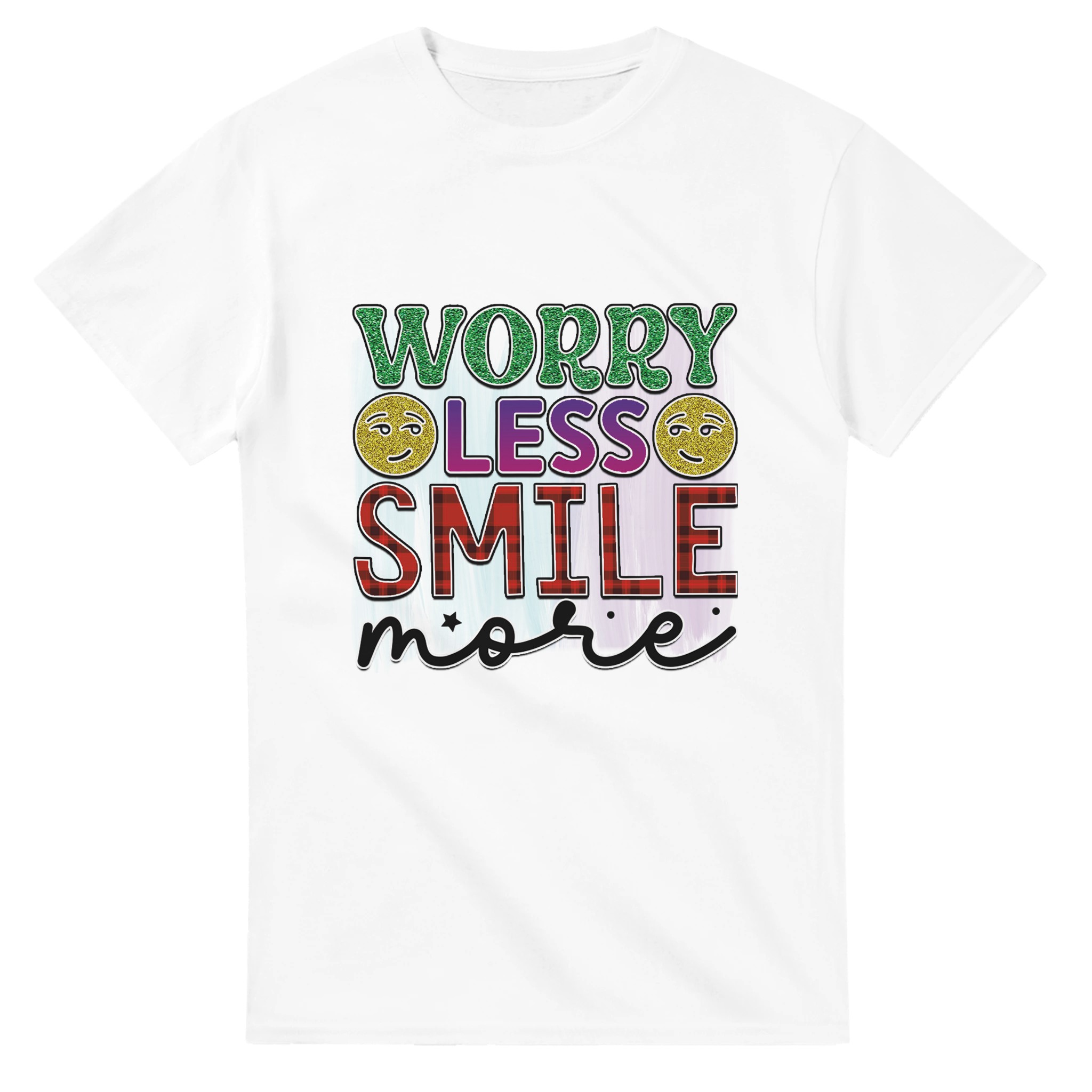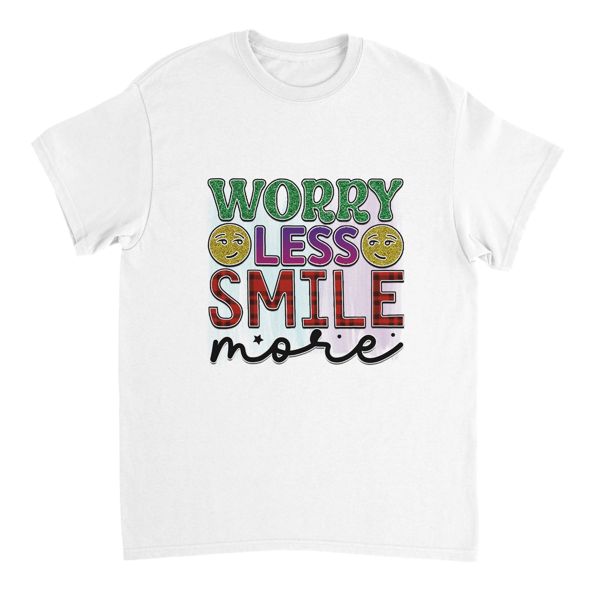 Sprid glädje och positivitet med vår ”Worry Less Smile More” T-shirt! Denna bekväma och tidlösa klassiker är designad för att inspirera, med glittriga detaljer och en palett som lyfter fram budskapet. Tillverkad för att vara både snygg och hållbar, är det den perfekta t-shirten för att lysa upp din egen eller andras dag.