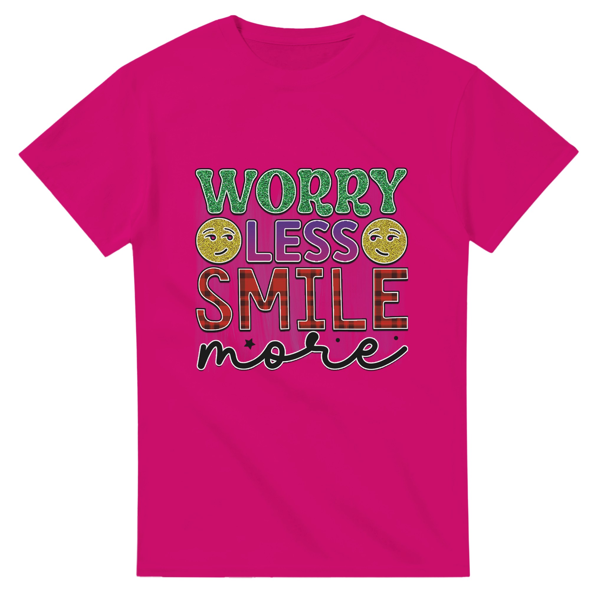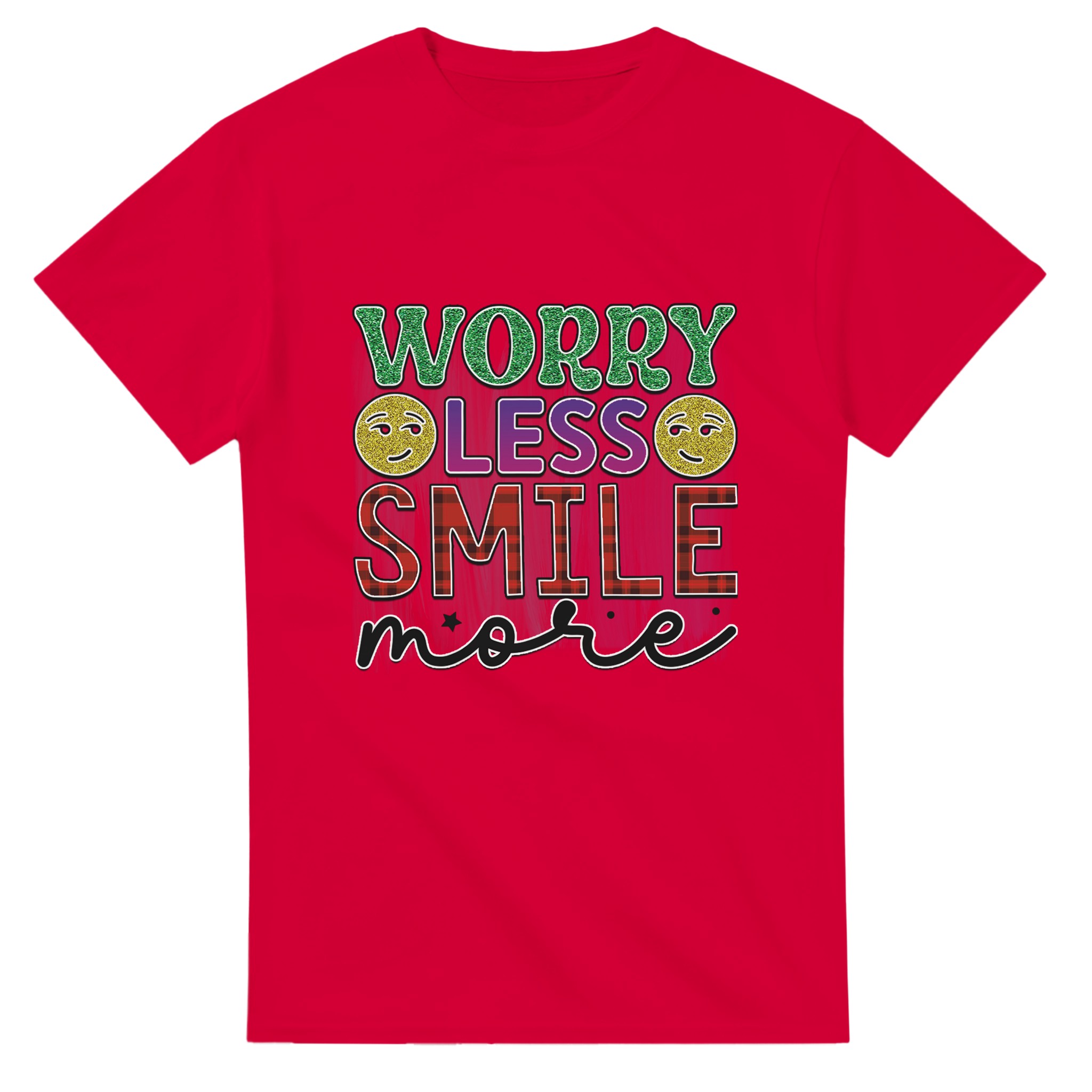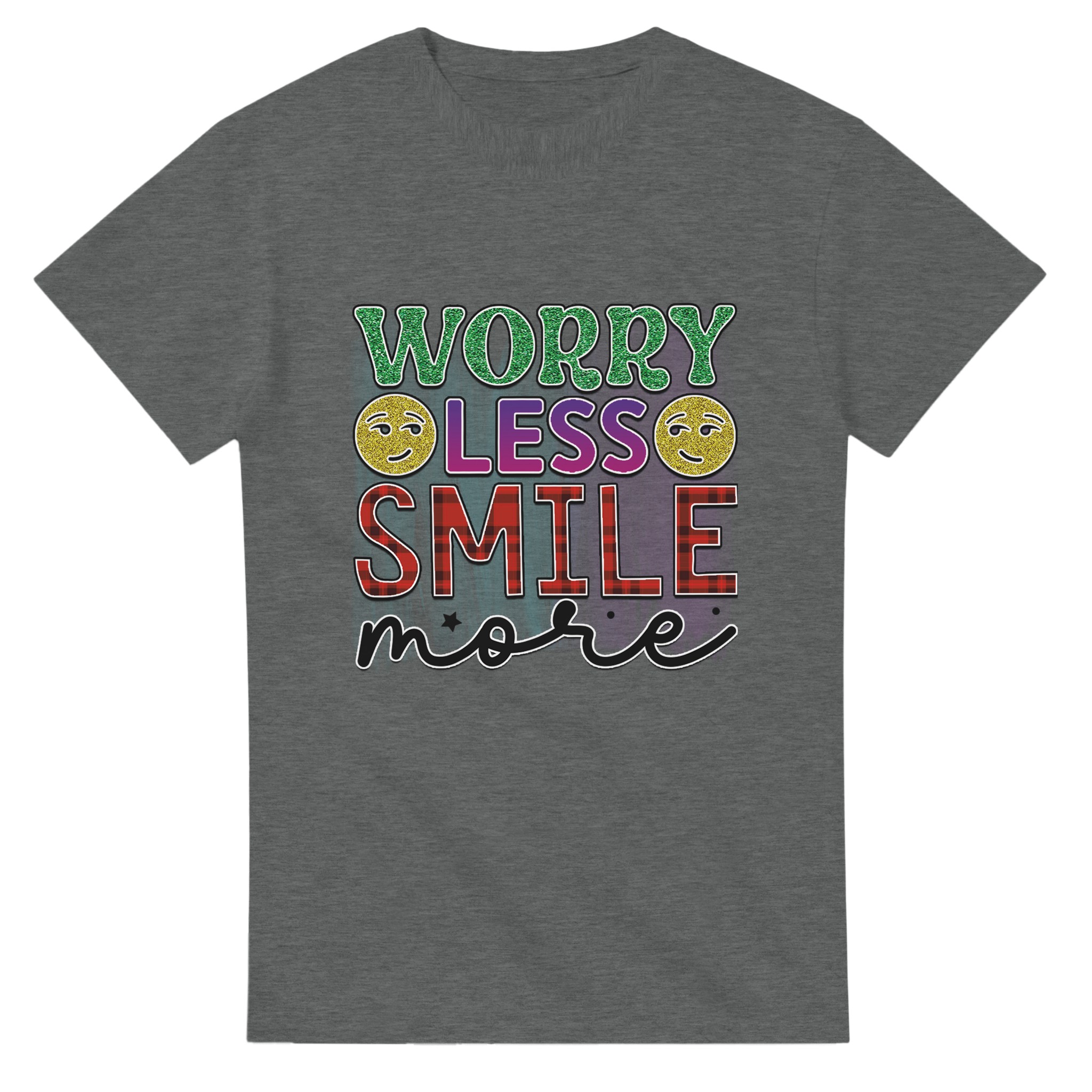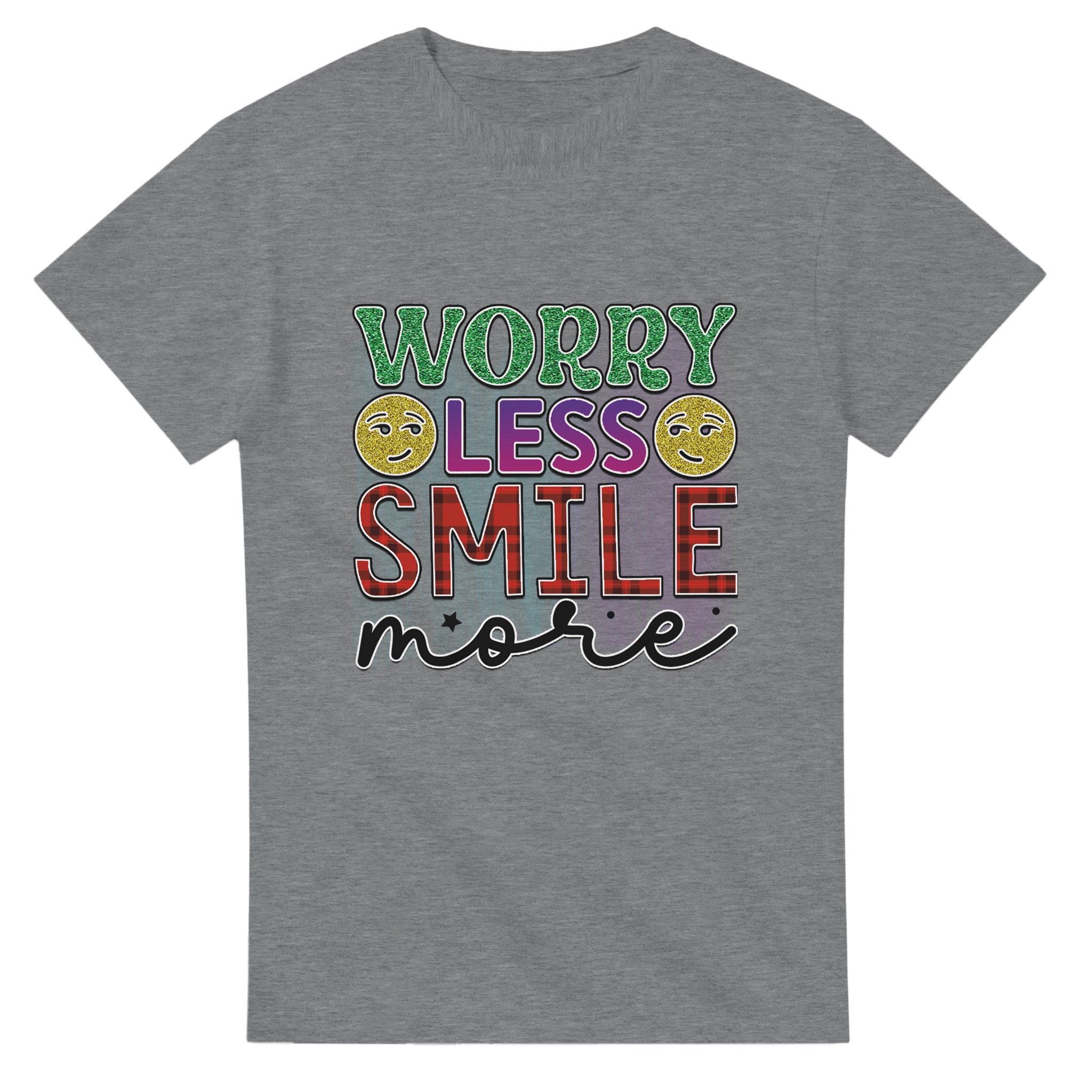Sprid glädje och positivitet med vår ”Worry Less Smile More” T-shirt! Denna bekväma och tidlösa klassiker är designad för att inspirera, med glittriga detaljer och en palett som lyfter fram budskapet. Tillverkad för att vara både snygg och hållbar, är det den perfekta t-shirten för att lysa upp din egen eller andras dag.