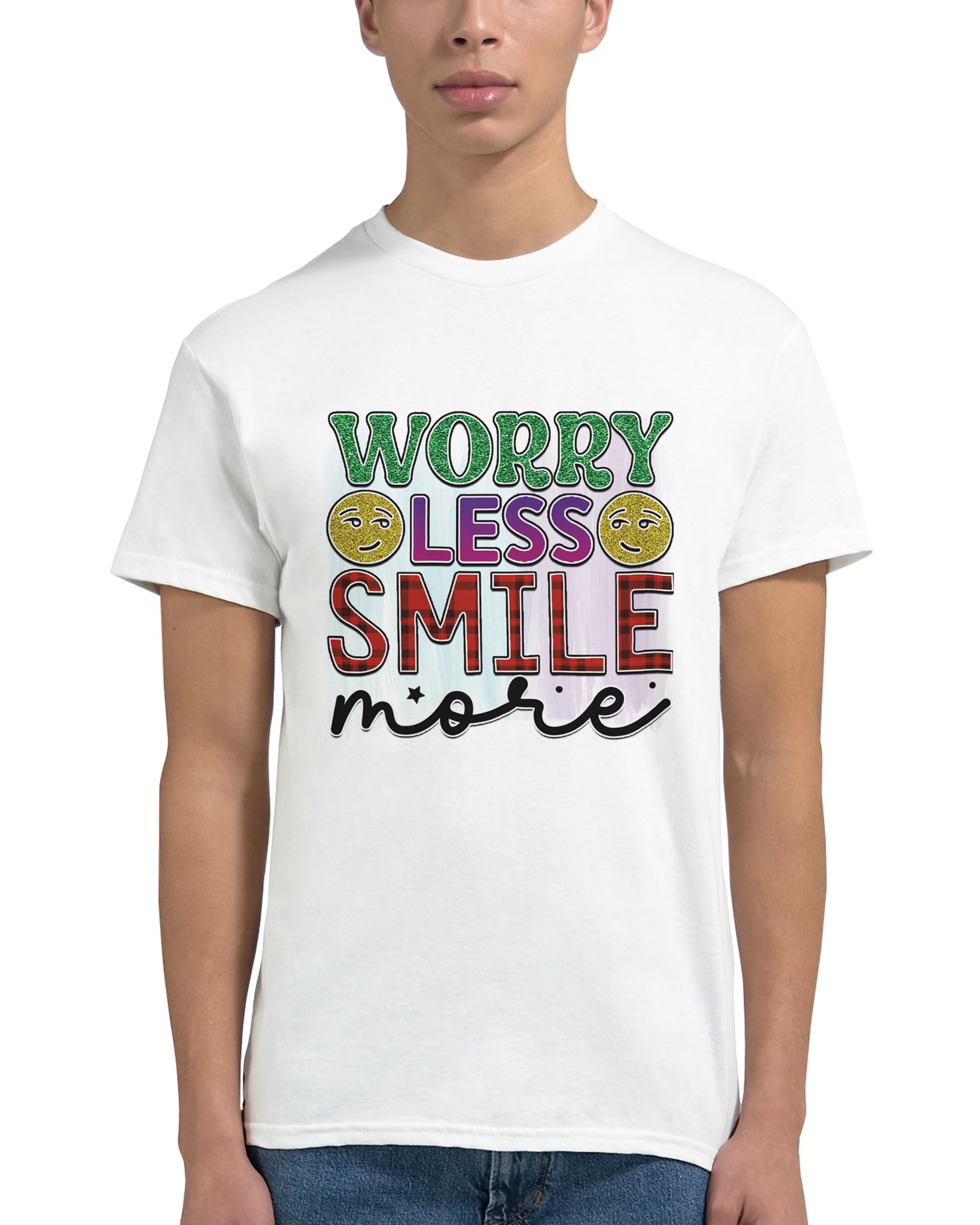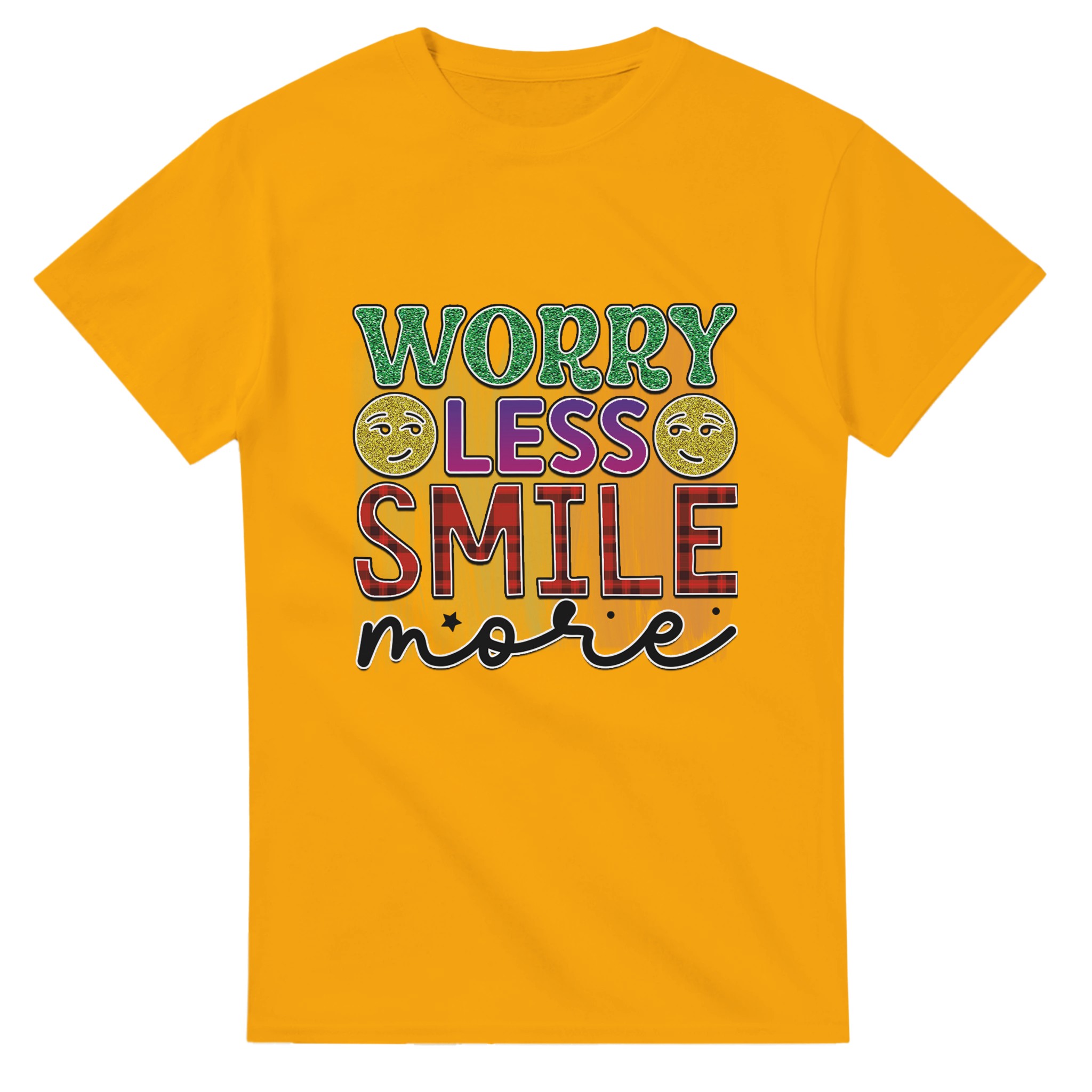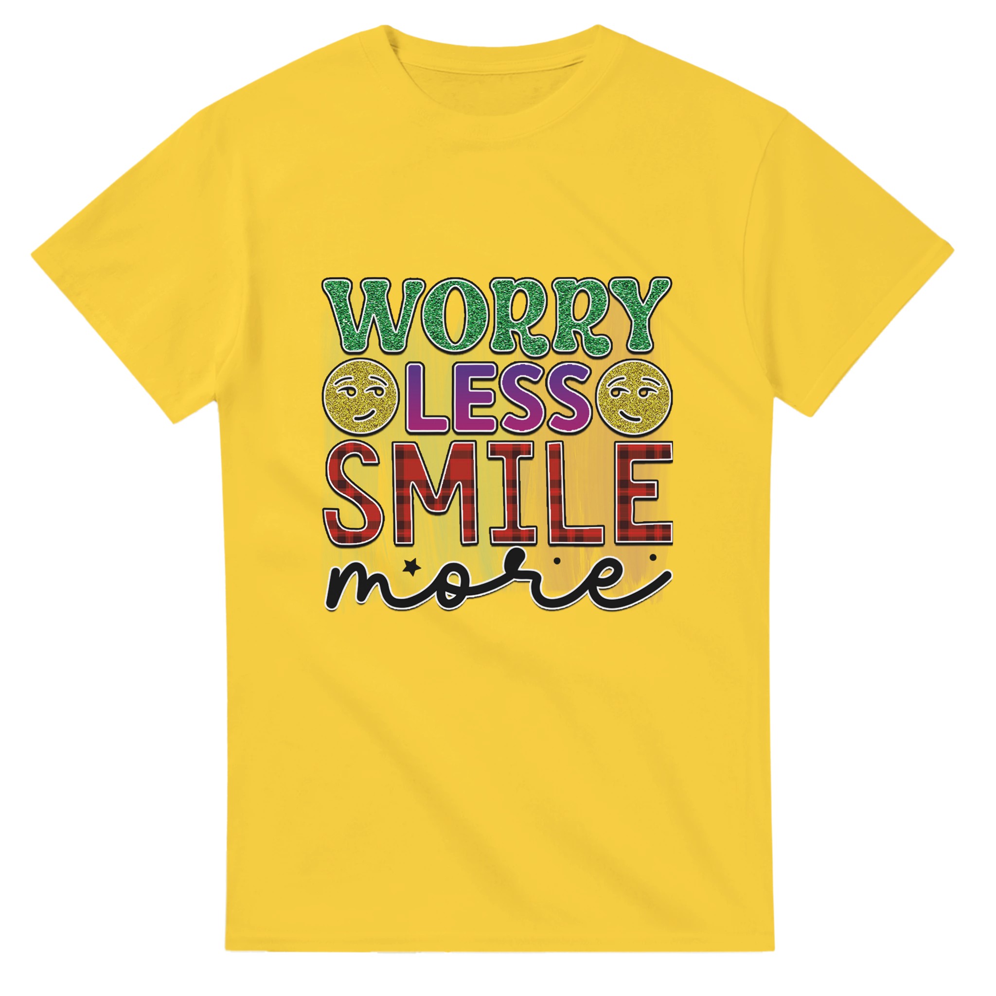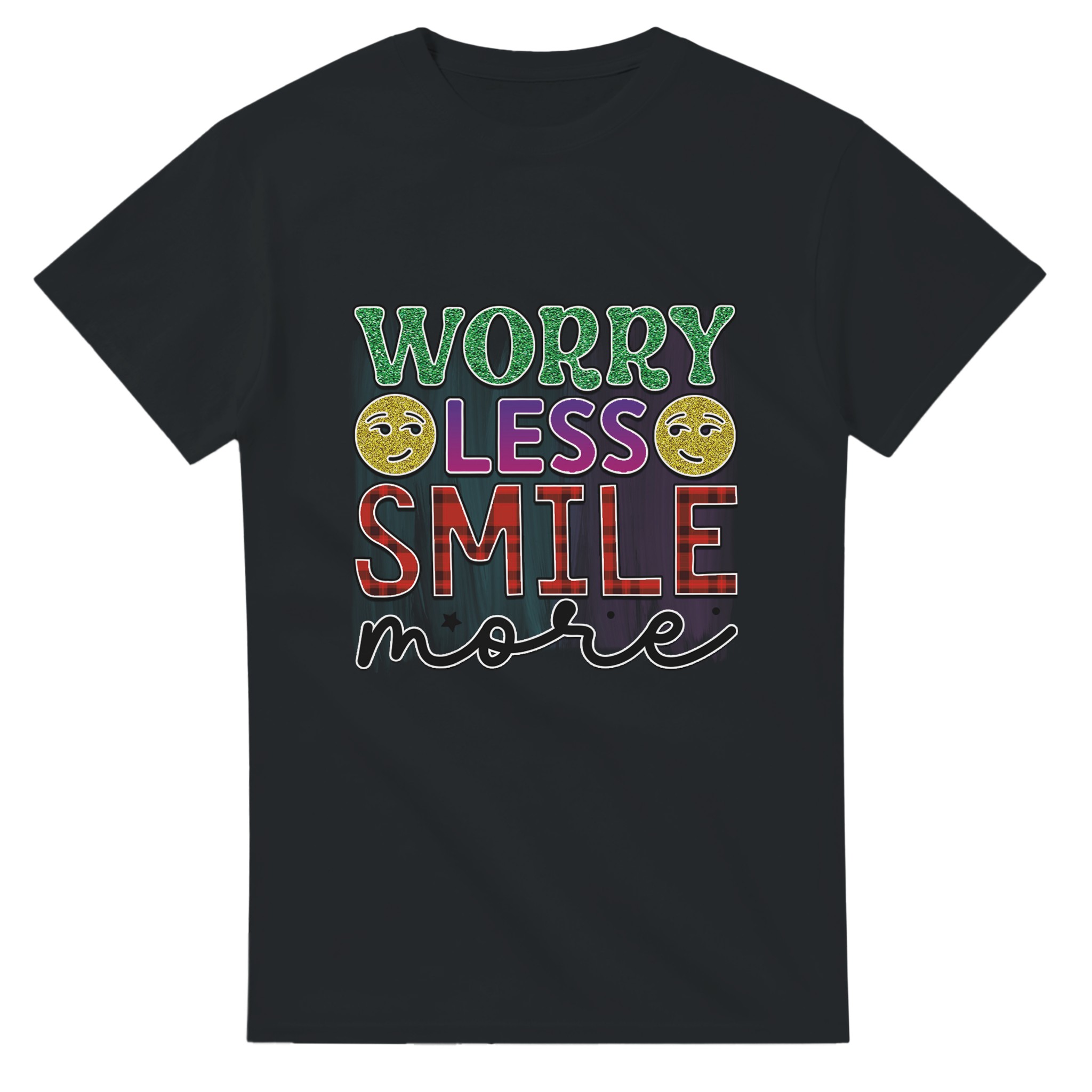 Sprid glädje och positivitet med vår ”Worry Less Smile More” T-shirt! Denna bekväma och tidlösa klassiker är designad för att inspirera, med glittriga detaljer och en palett som lyfter fram budskapet. Tillverkad för att vara både snygg och hållbar, är det den perfekta t-shirten för att lysa upp din egen eller andras dag.