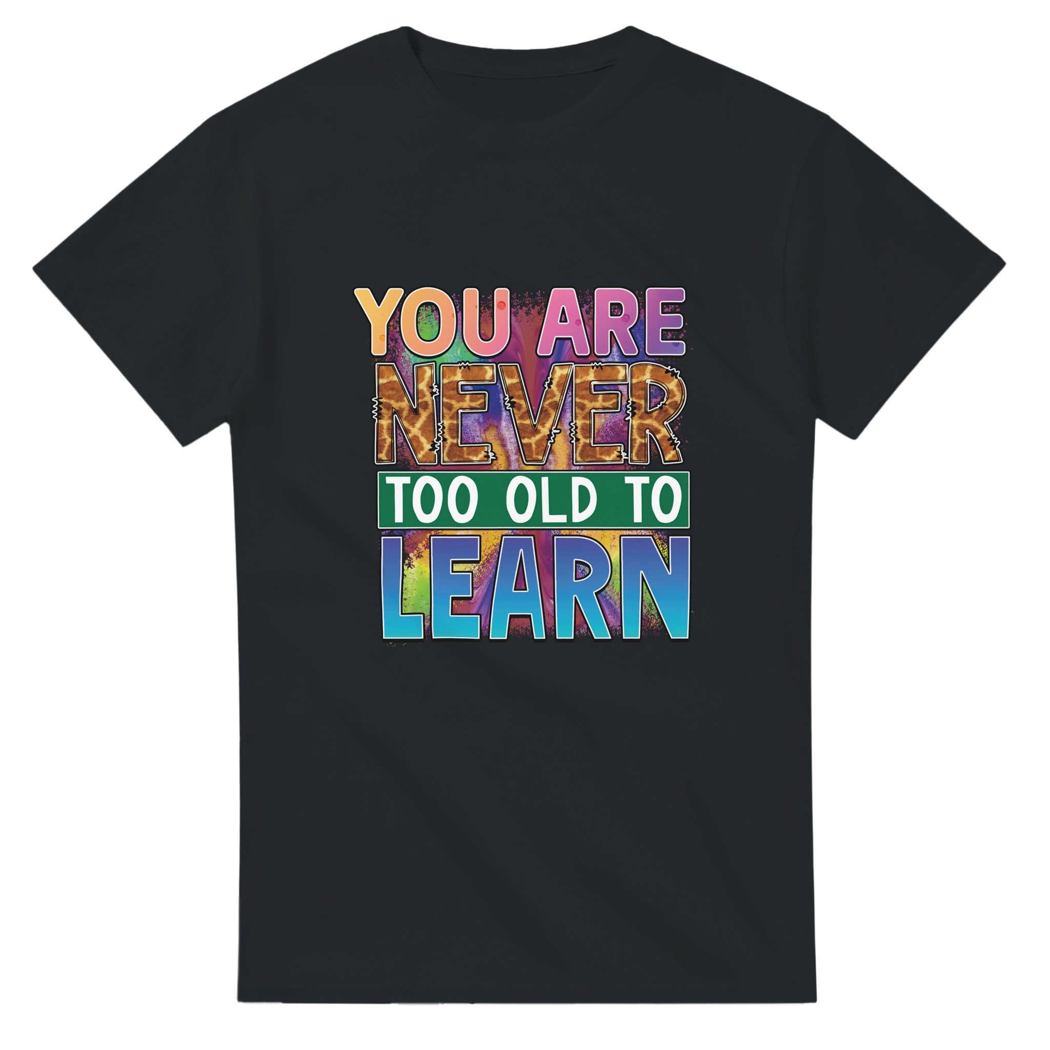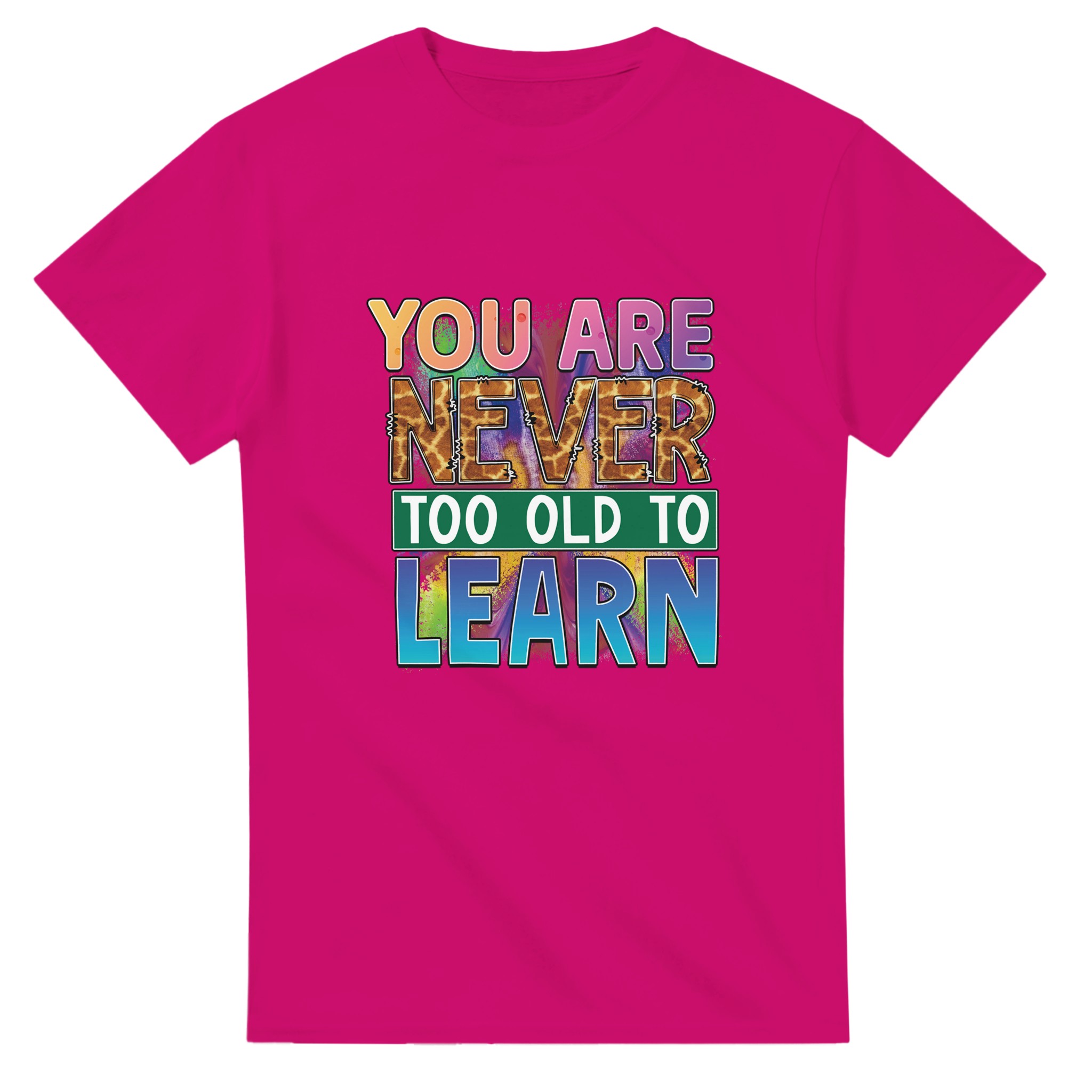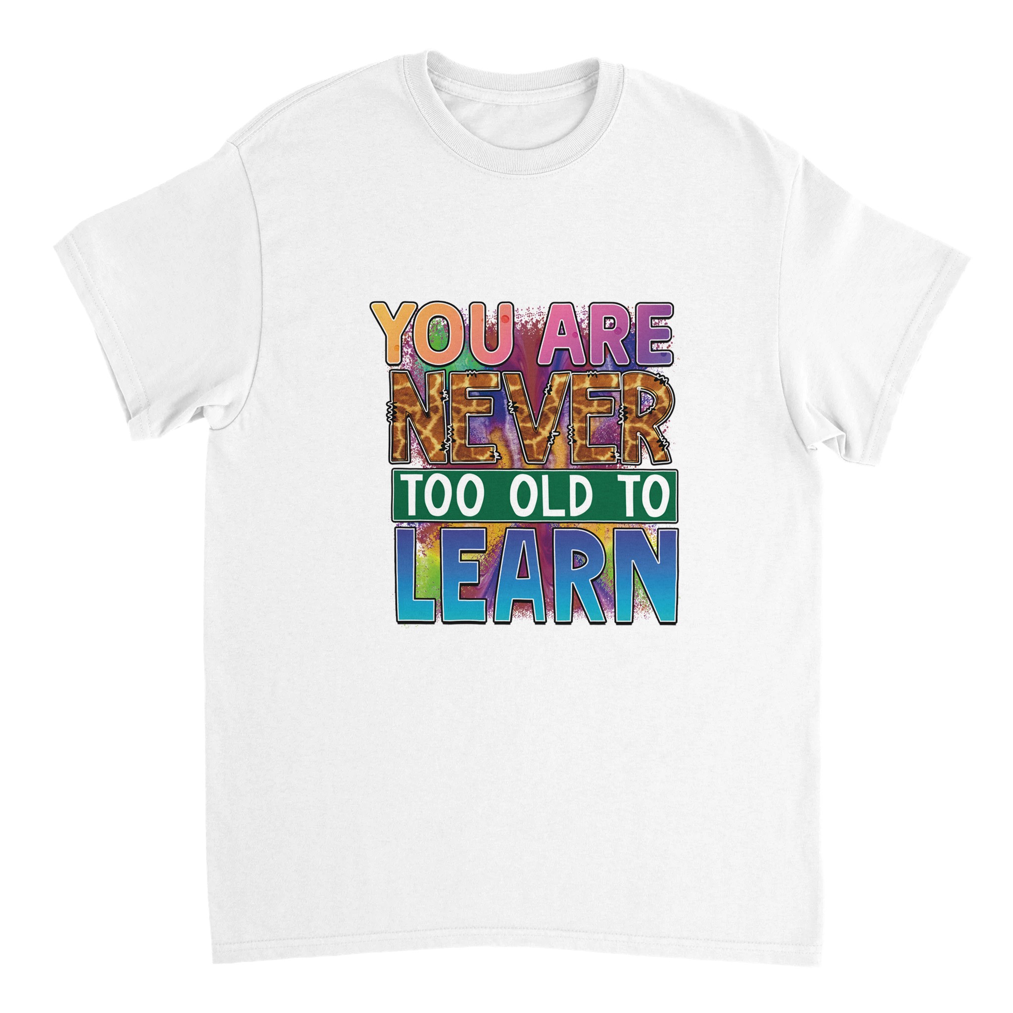 Upptäck vår Klassiska Bomulls-T-shirt, en tidlös och slitstark klassiker som kombinerar stil och funktionalitet. Denna t-shirt bär ett kraftfullt budskap med ”YOU ARE NEVER TOO OLD TO LEARN” i en lekfull, färgsprakande design, komplett med ett unikt giraffmönster på texten ”NEVER”. Denna design är en perfekt påminnelse om livslångt lärande, framställd med en energisk blandning av rosa, lila, blå och orange toner som verkligen sticker ut. Tillverkad av 100% bomull, ger denna t-shirt en bekväm passform, perfekt för både vardagsbruk och som en inspirerande present.