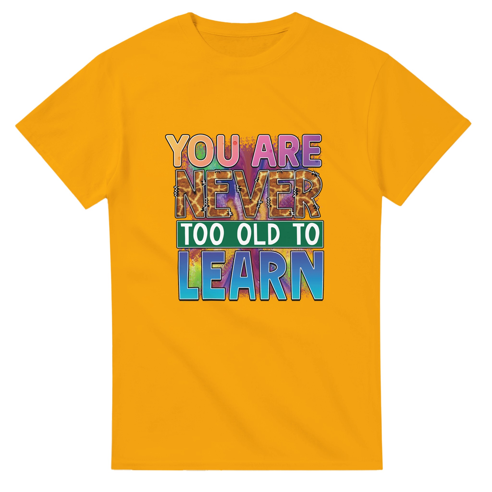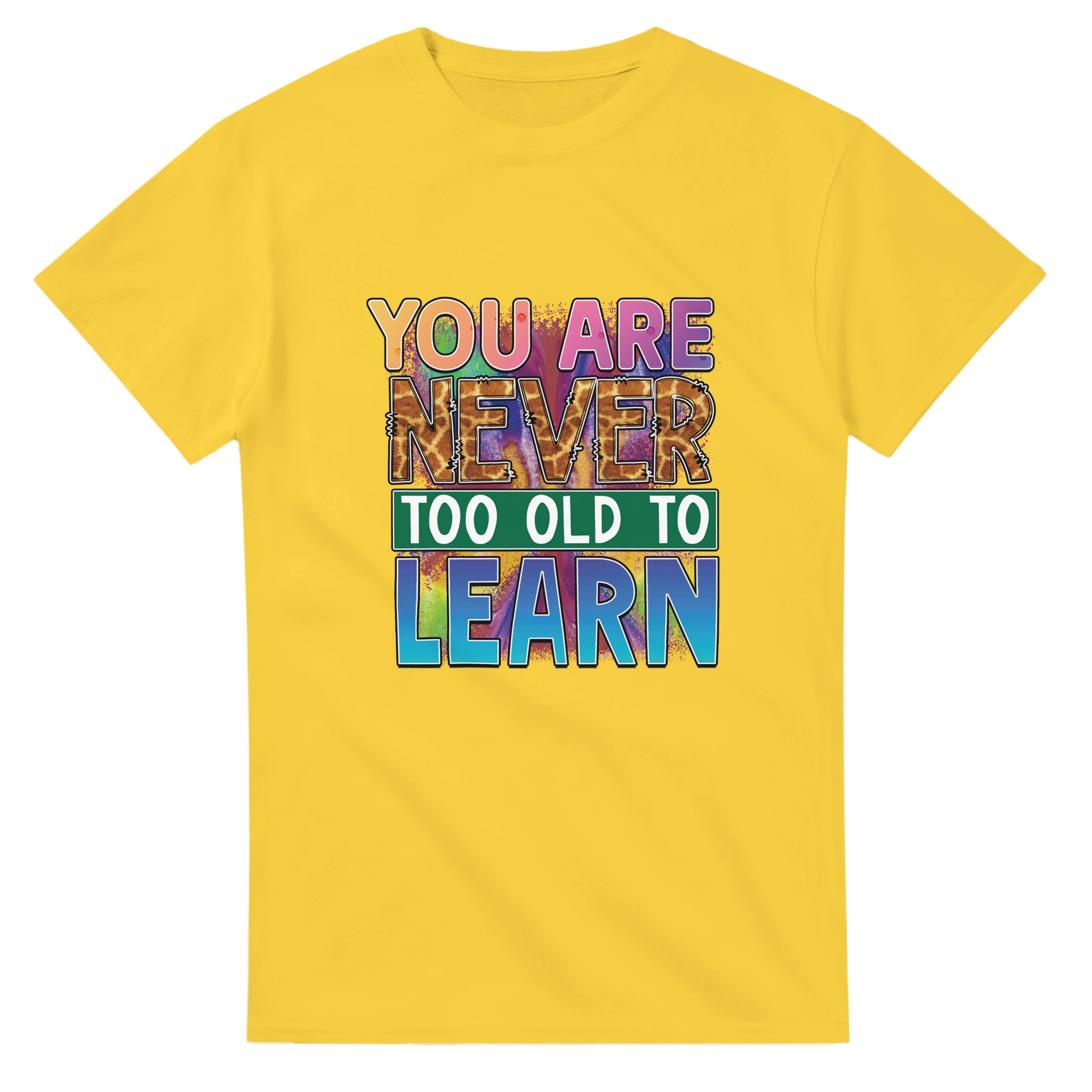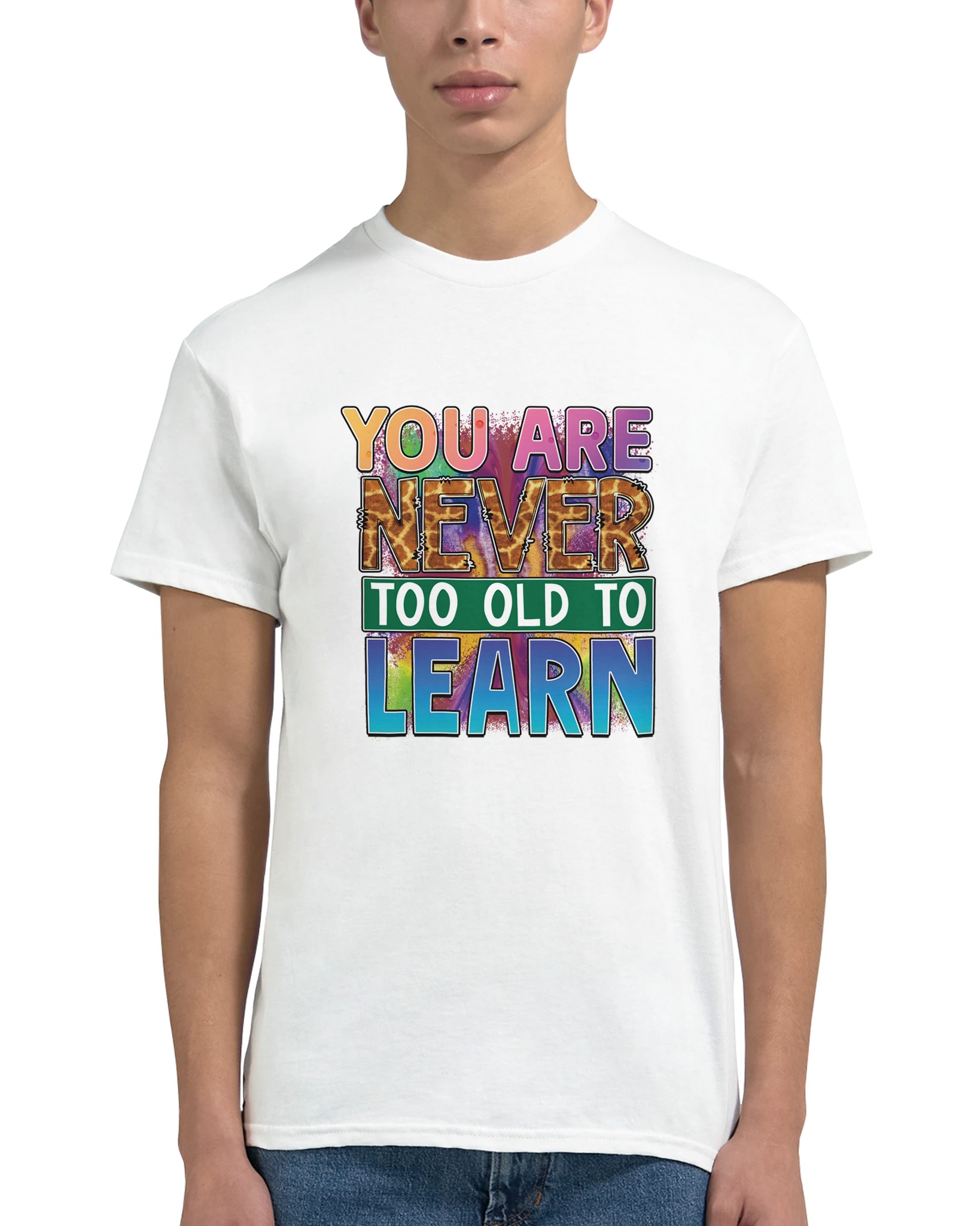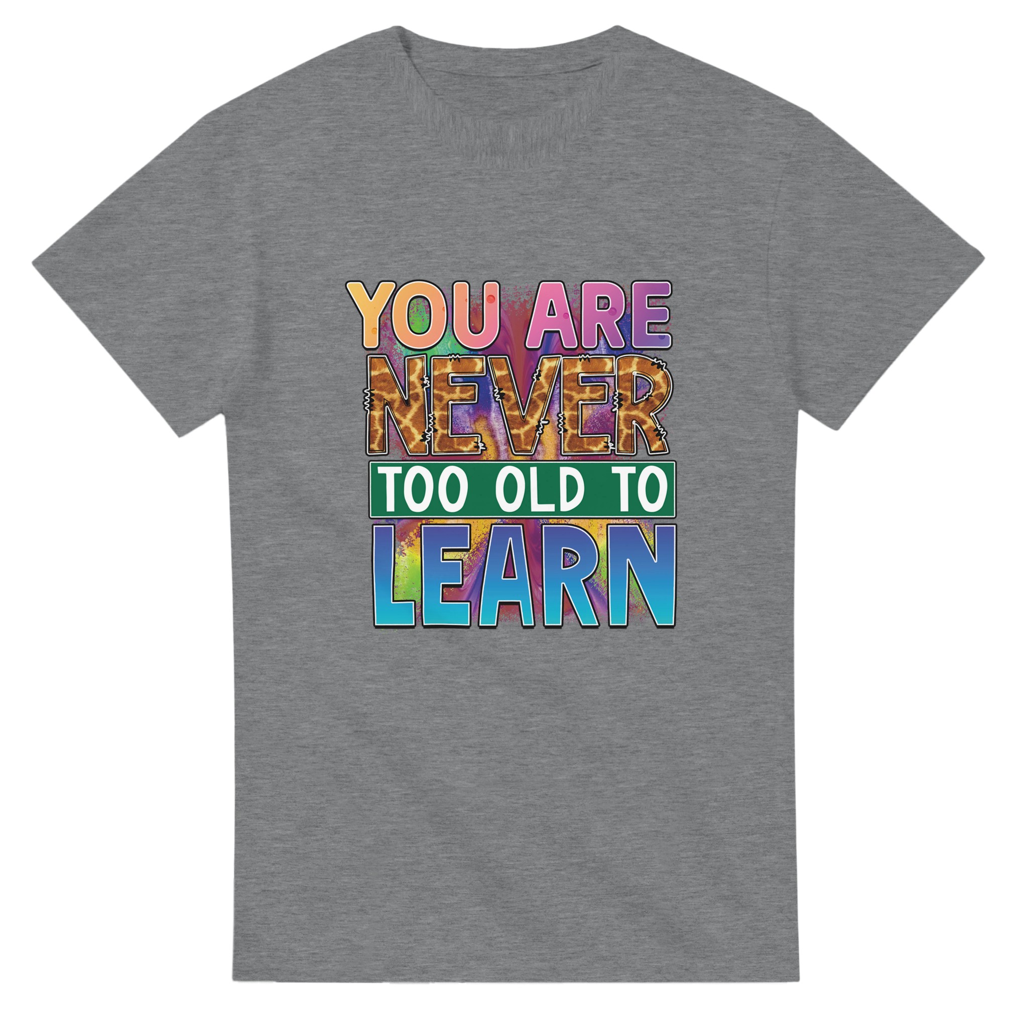Upptäck vår Klassiska Bomulls-T-shirt, en tidlös och slitstark klassiker som kombinerar stil och funktionalitet. Denna t-shirt bär ett kraftfullt budskap med ”YOU ARE NEVER TOO OLD TO LEARN” i en lekfull, färgsprakande design, komplett med ett unikt giraffmönster på texten ”NEVER”. Denna design är en perfekt påminnelse om livslångt lärande, framställd med en energisk blandning av rosa, lila, blå och orange toner som verkligen sticker ut. Tillverkad av 100% bomull, ger denna t-shirt en bekväm passform, perfekt för både vardagsbruk och som en inspirerande present.