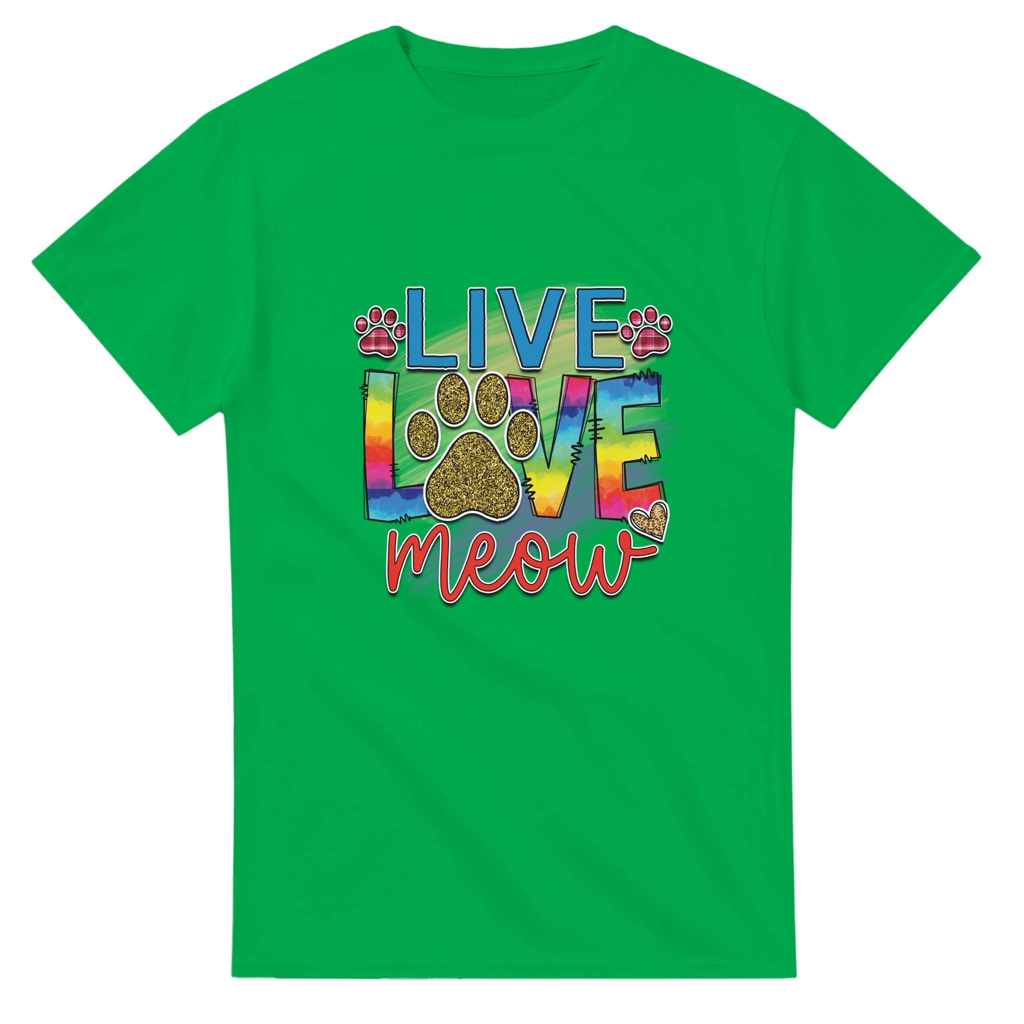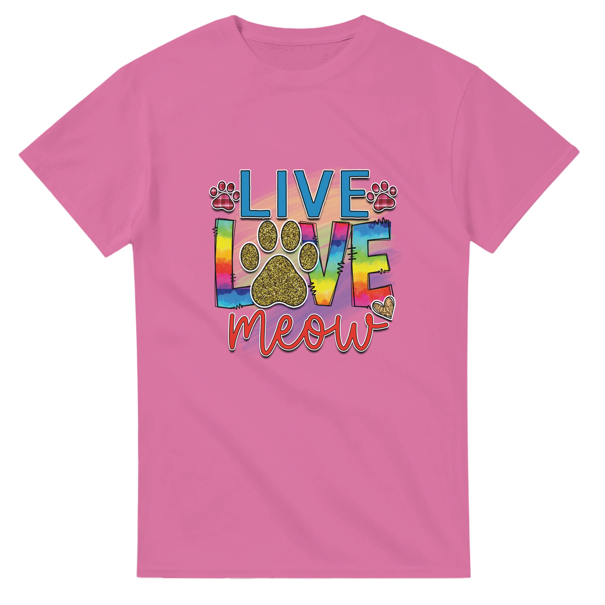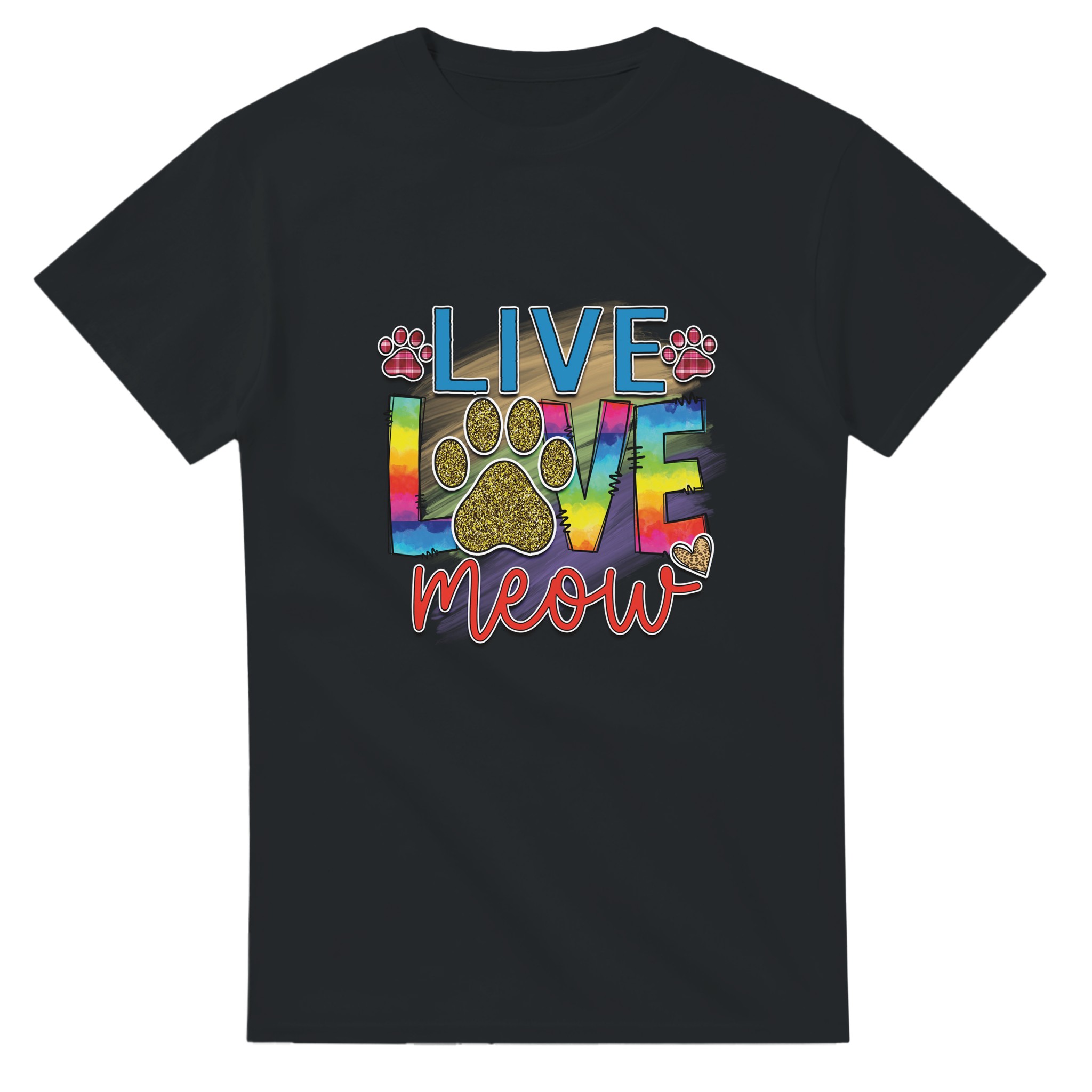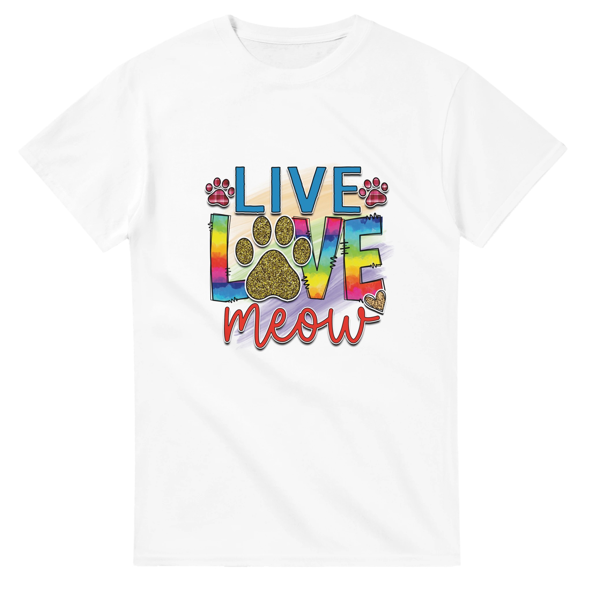Live Love Meow T-shirt – Färgstark Kattdesign med Glitter & Rutiga Detaljer, Unisex för Kattälskare