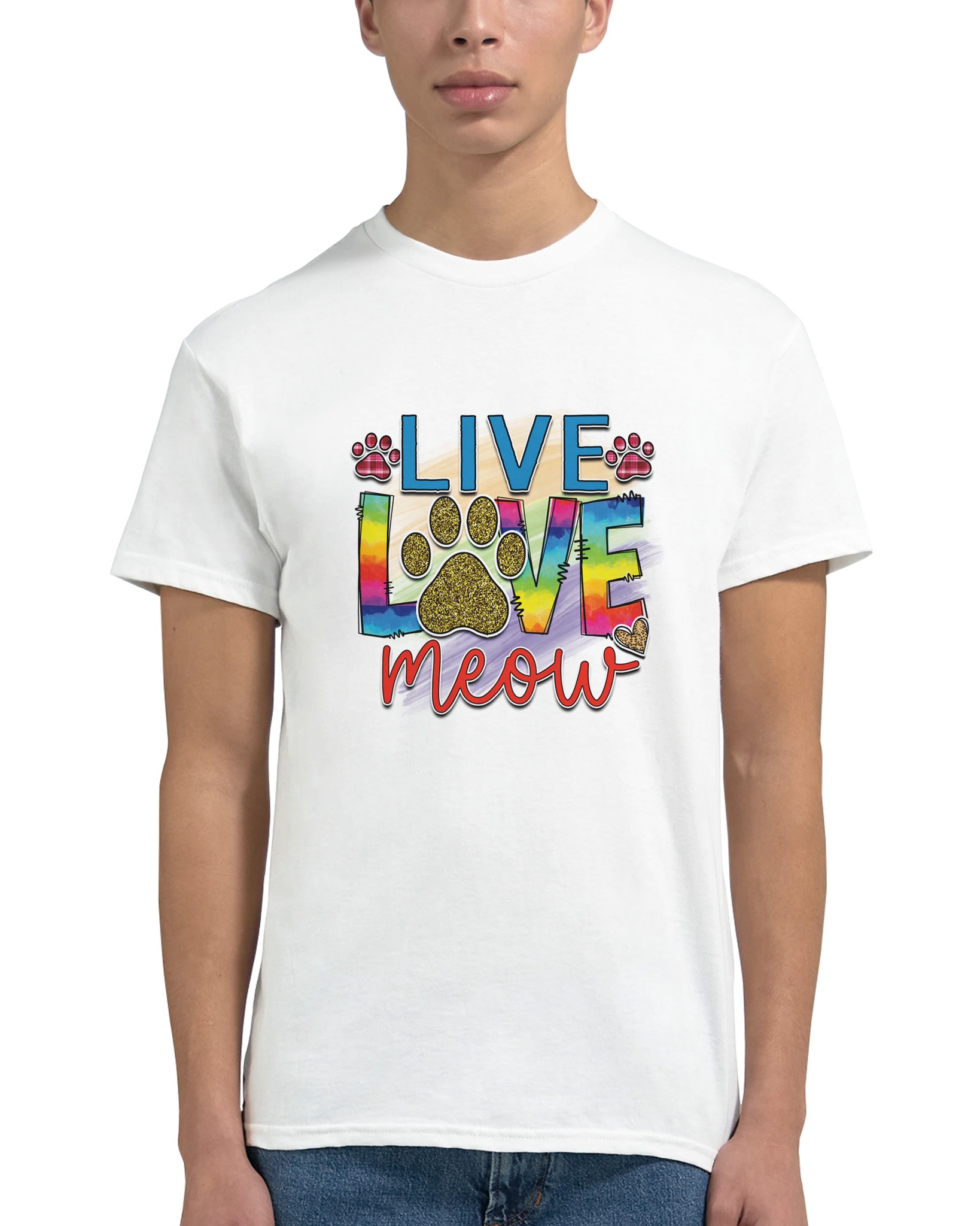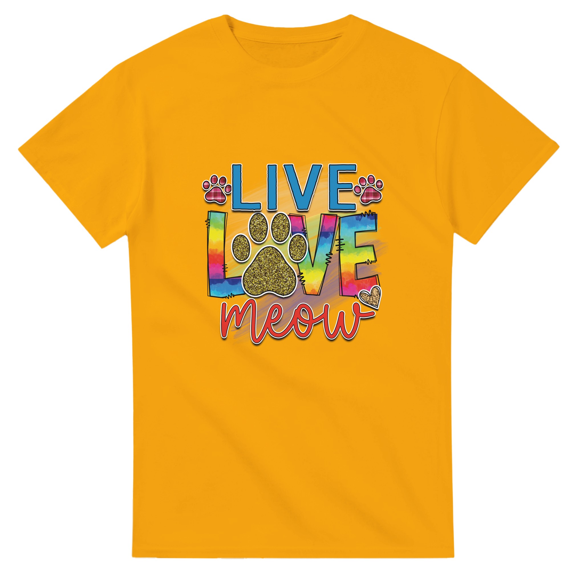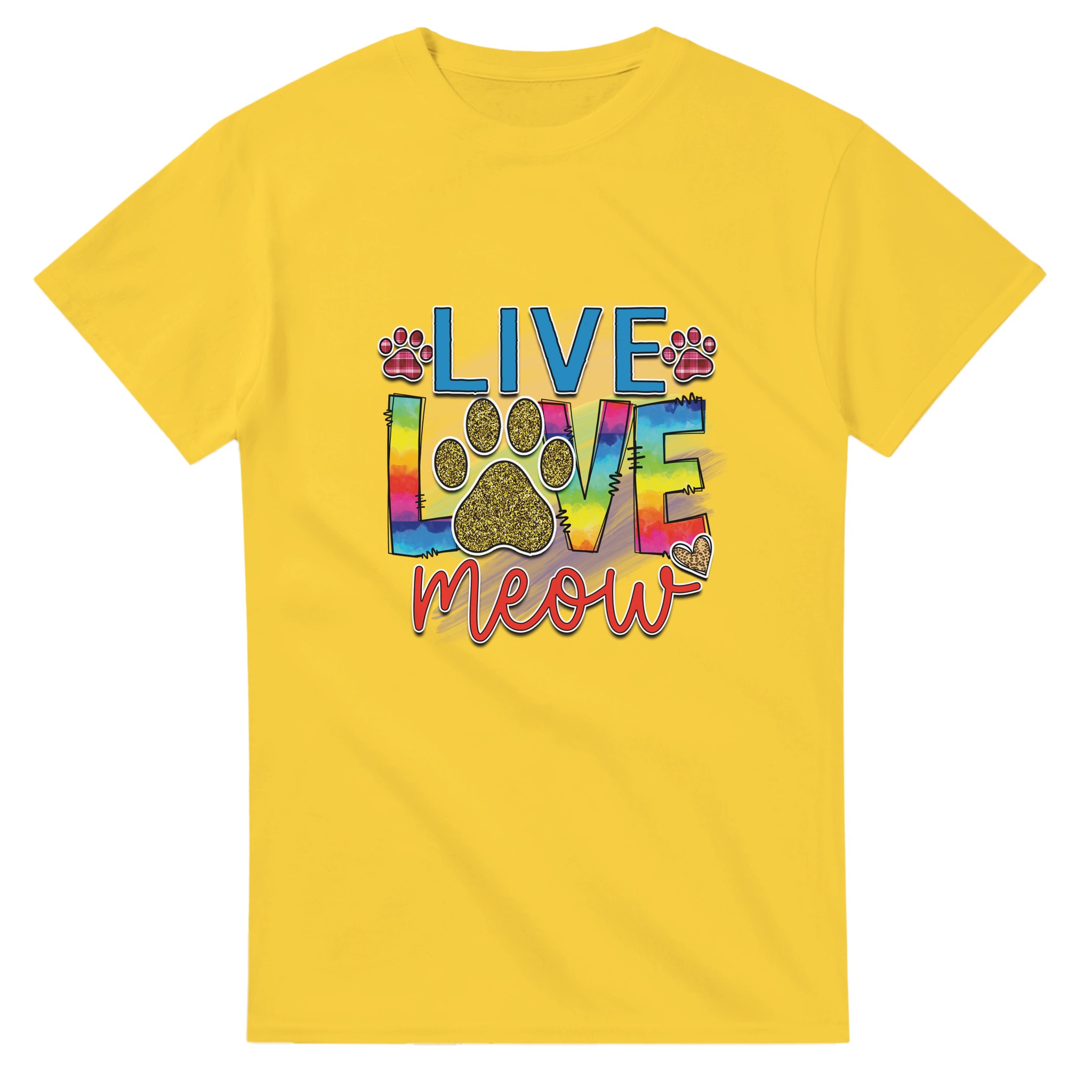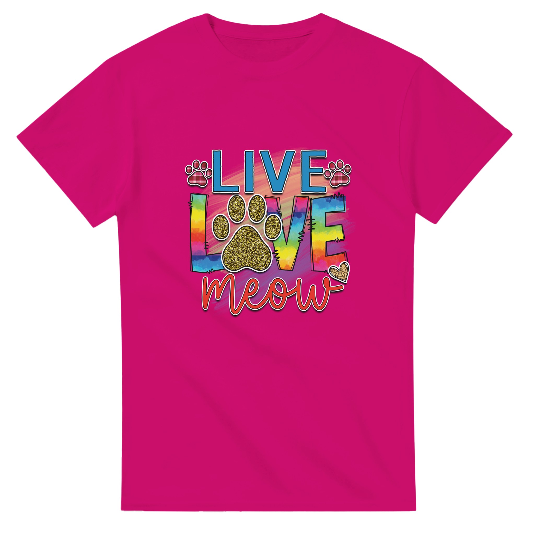 Live Love Meow T-shirt – Färgstark Kattdesign med Glitter & Rutiga Detaljer, Unisex för Kattälskare