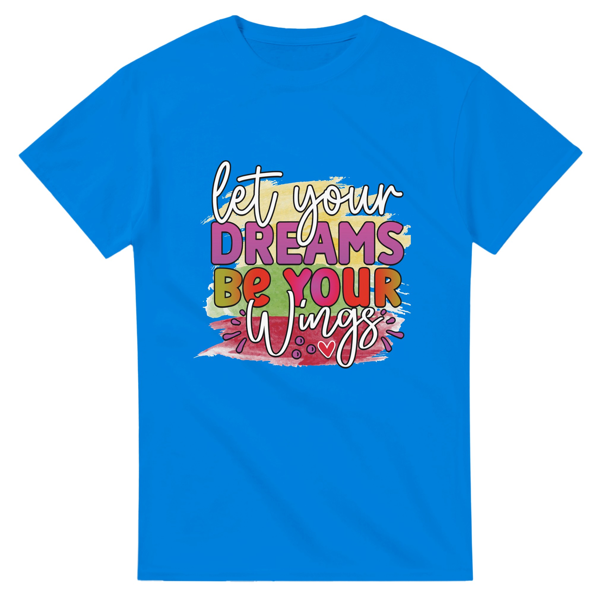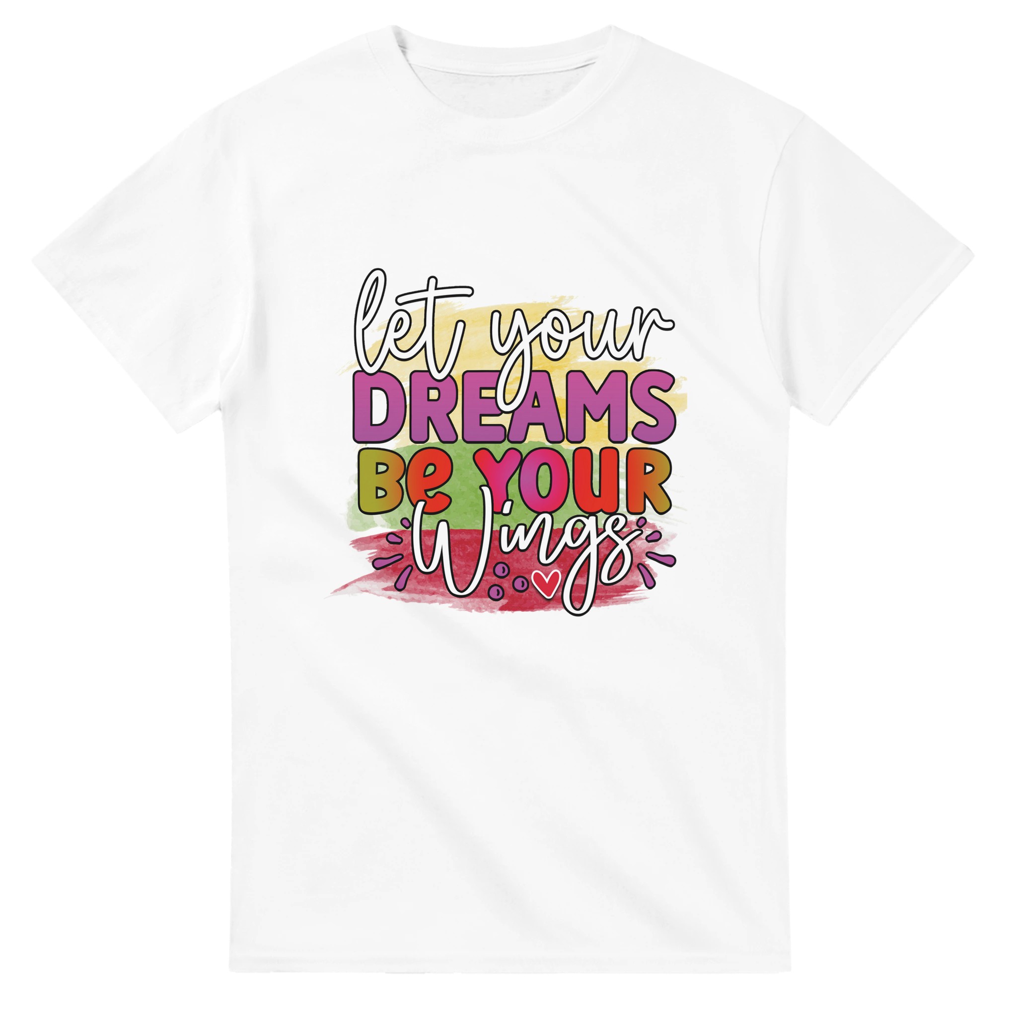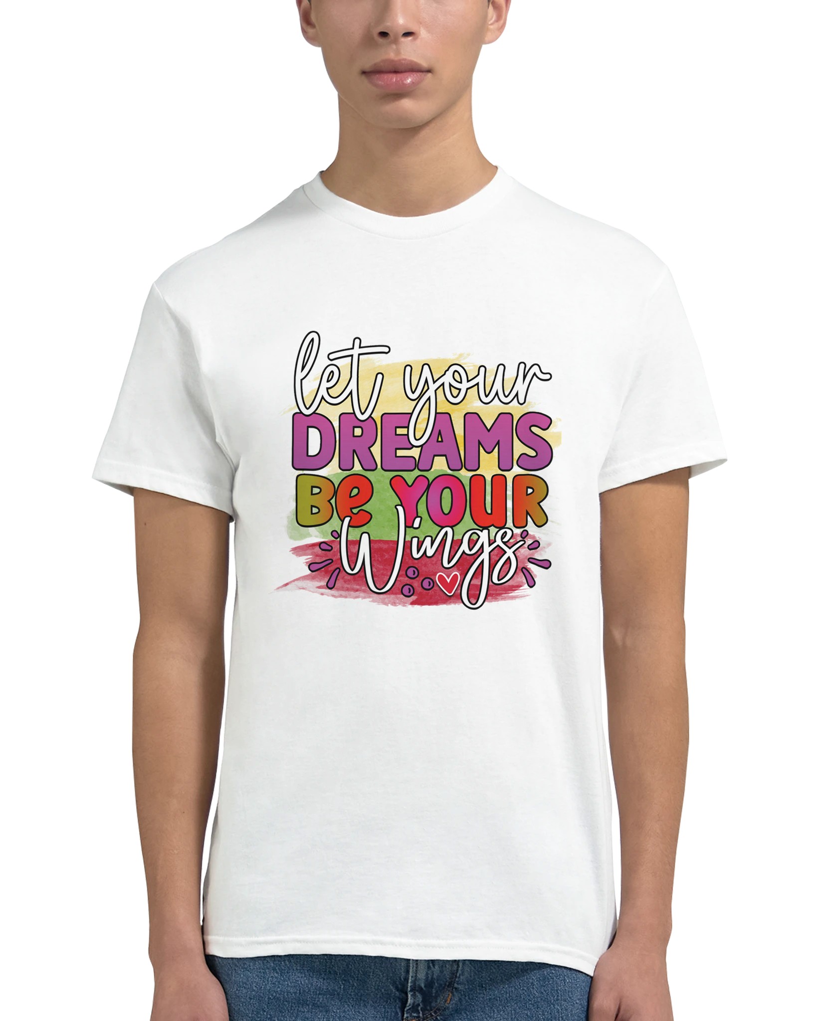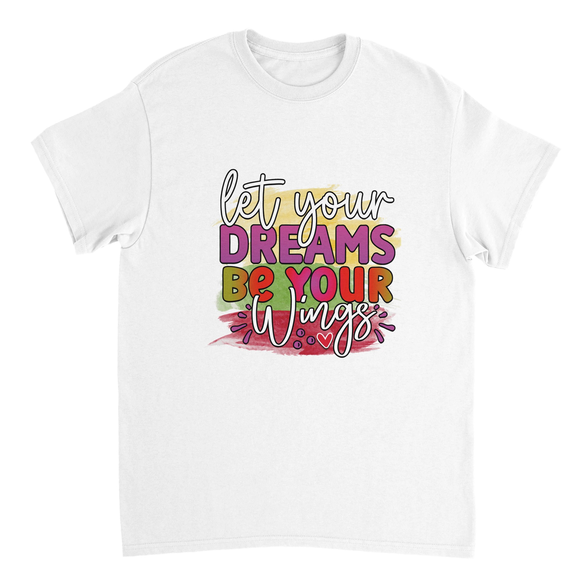 Låt din inre inspiration flöda med vår ‘Låt Dina Drömmar Vara Dina Vingar’ T-shirt. Denna design, fylld med upplyftande budskap och en palett av glada färger, är mer än bara ett plagg – det är en påminnelse om att sträva efter dina mål varje dag. Perfekt för den som vill bära sitt hjärta på ärmen och sprida positivitet, oavsett om du är på jobbet, gymmet eller ute med vänner. Tillverkad av 100% bomull, erbjuder denna t-shirt både en bekväm passform och en varaktig kvalitet som matchar ditt ständiga driv.