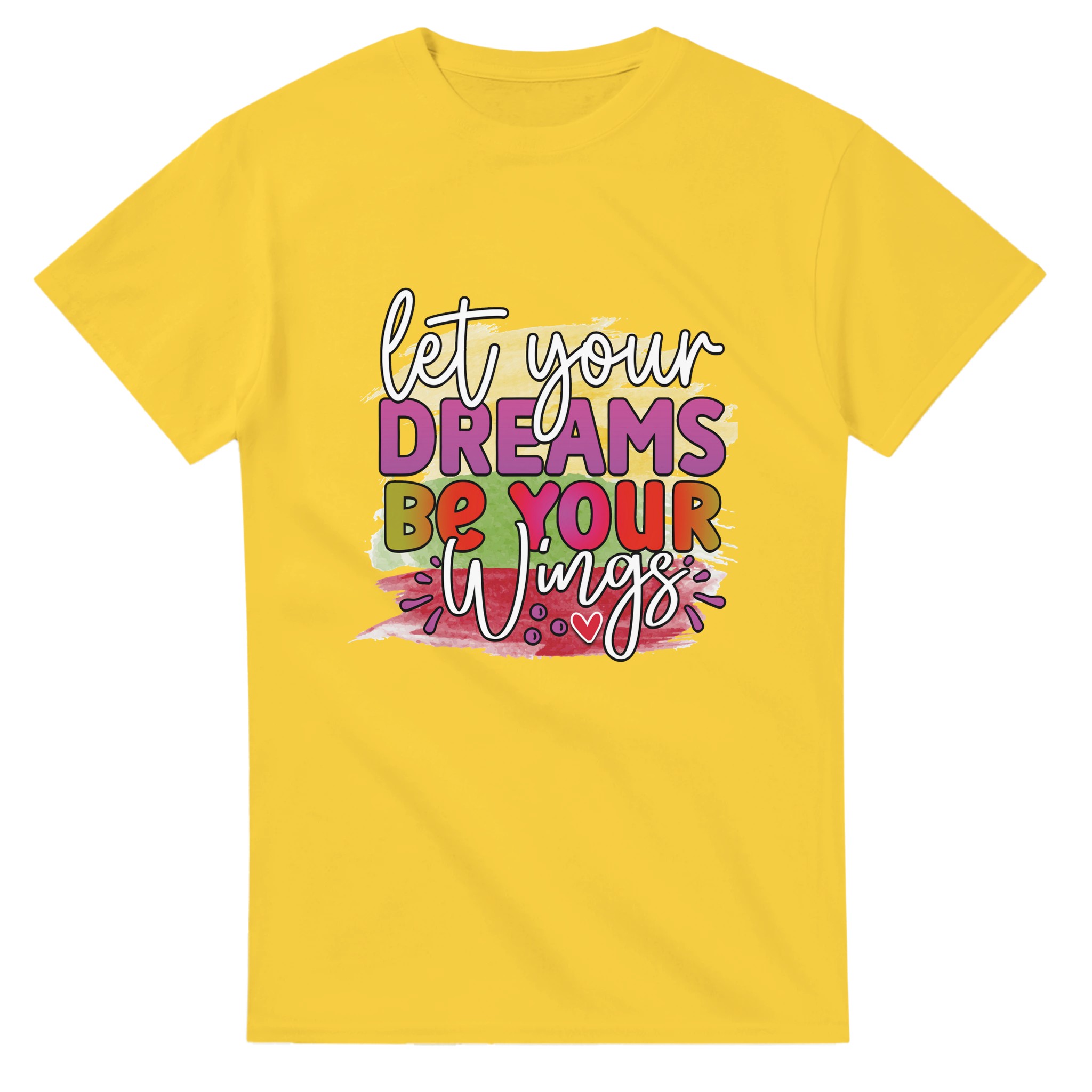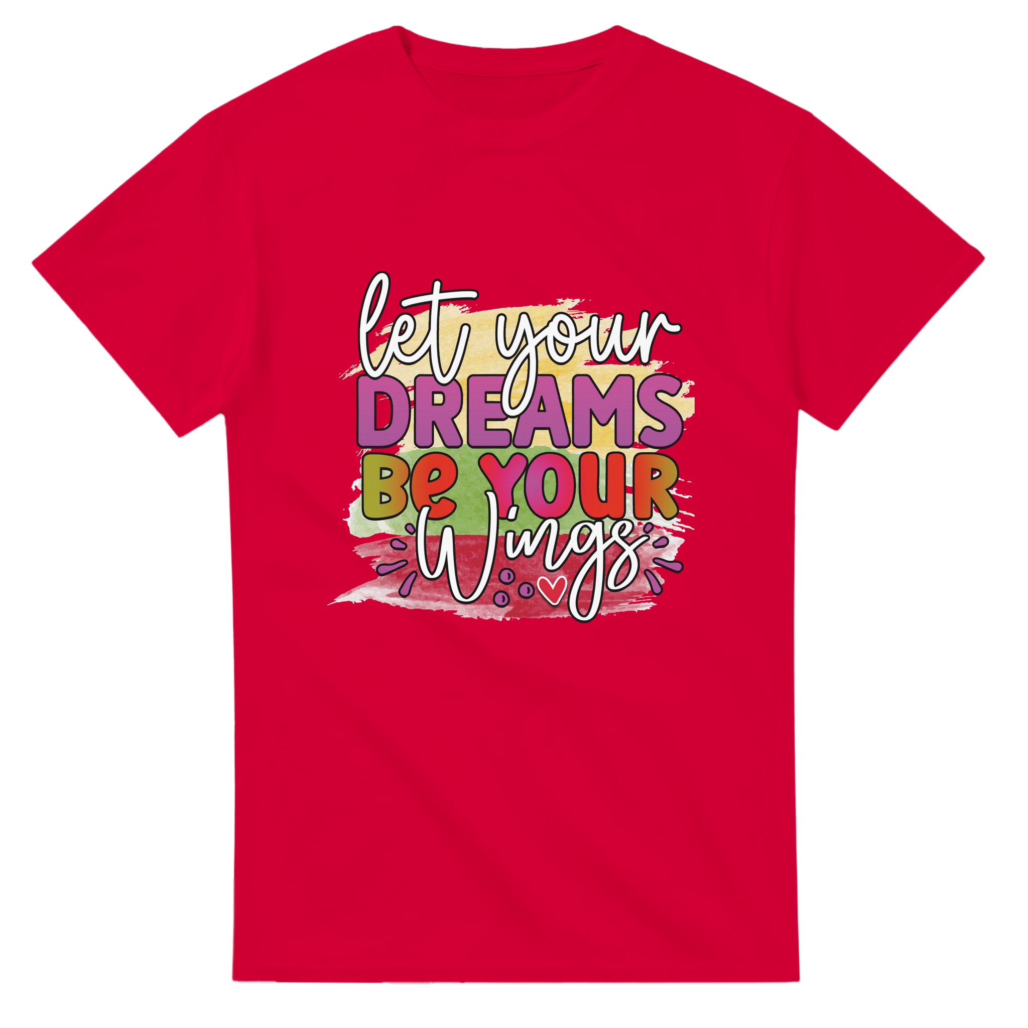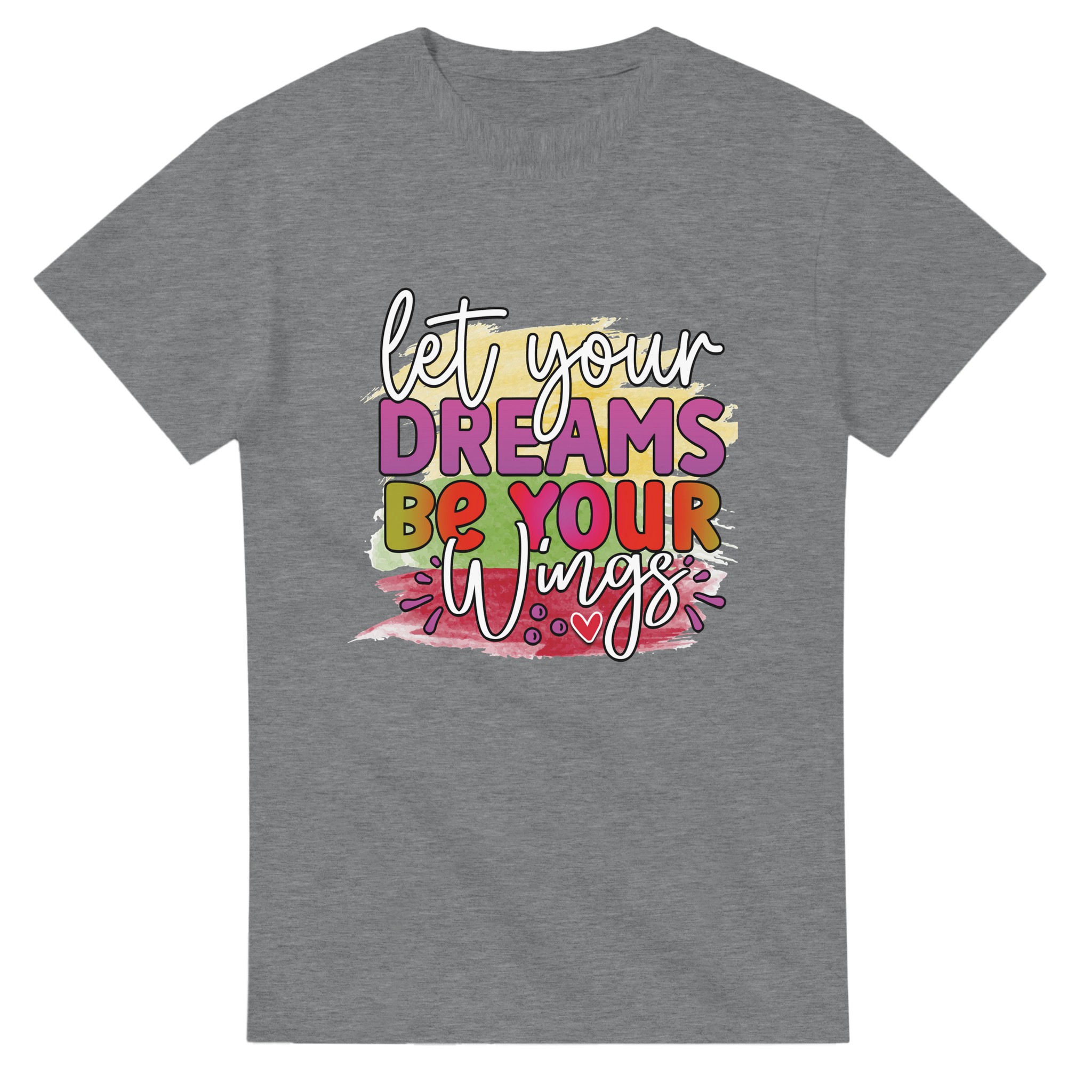 Låt din inre inspiration flöda med vår ‘Låt Dina Drömmar Vara Dina Vingar’ T-shirt. Denna design, fylld med upplyftande budskap och en palett av glada färger, är mer än bara ett plagg – det är en påminnelse om att sträva efter dina mål varje dag. Perfekt för den som vill bära sitt hjärta på ärmen och sprida positivitet, oavsett om du är på jobbet, gymmet eller ute med vänner. Tillverkad av 100% bomull, erbjuder denna t-shirt både en bekväm passform och en varaktig kvalitet som matchar ditt ständiga driv.