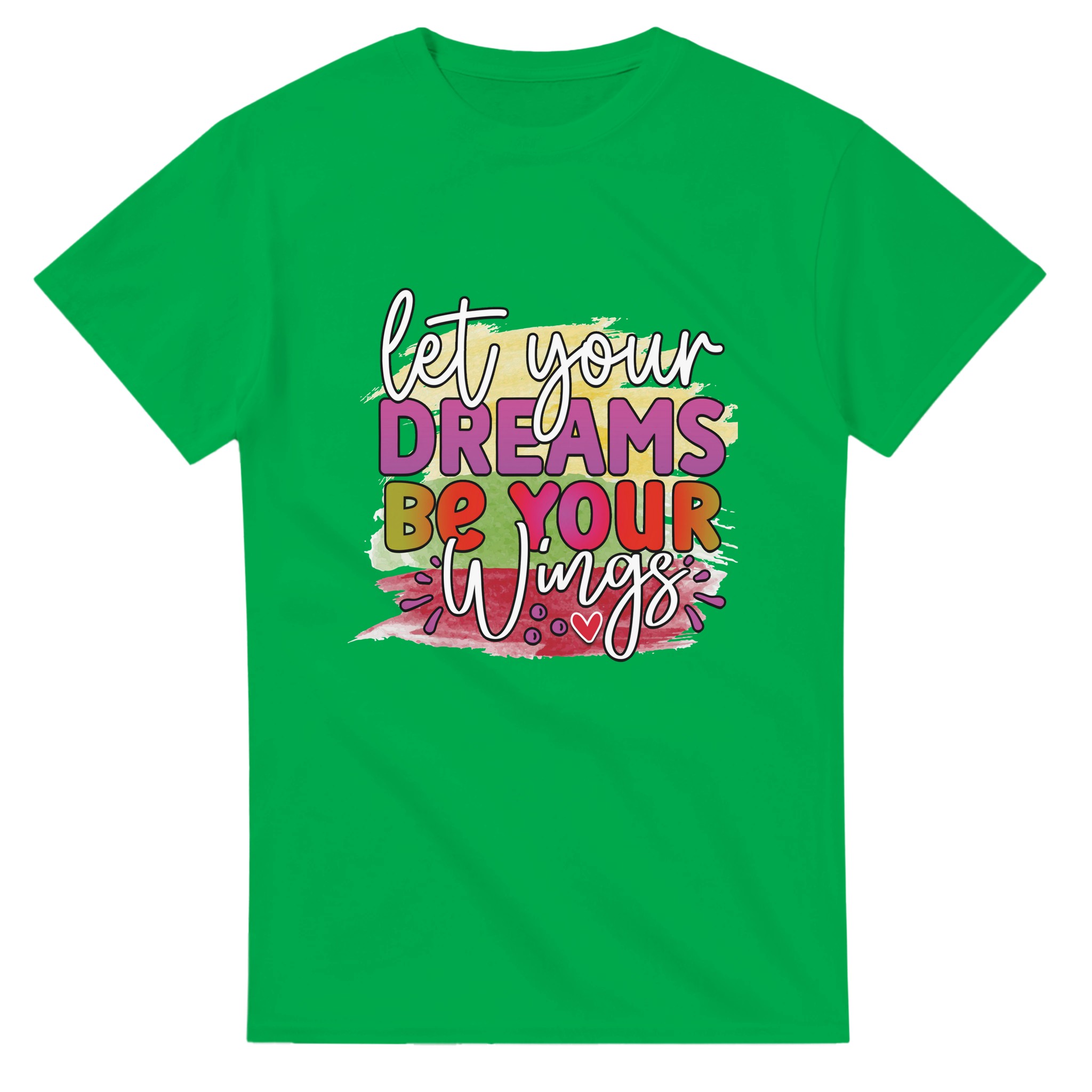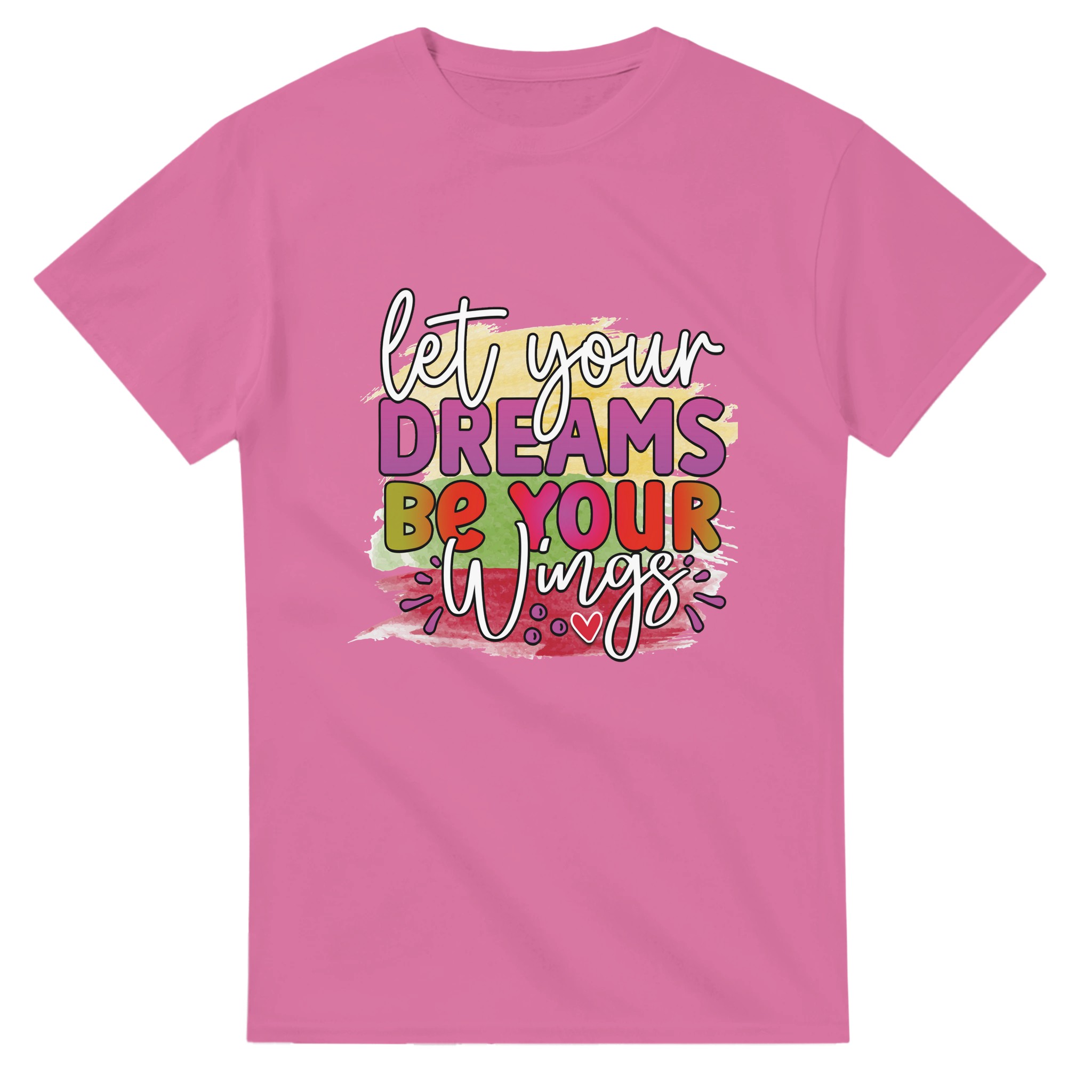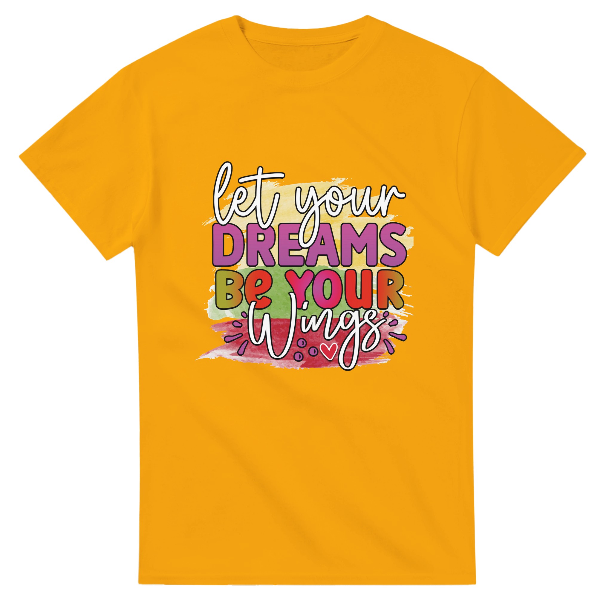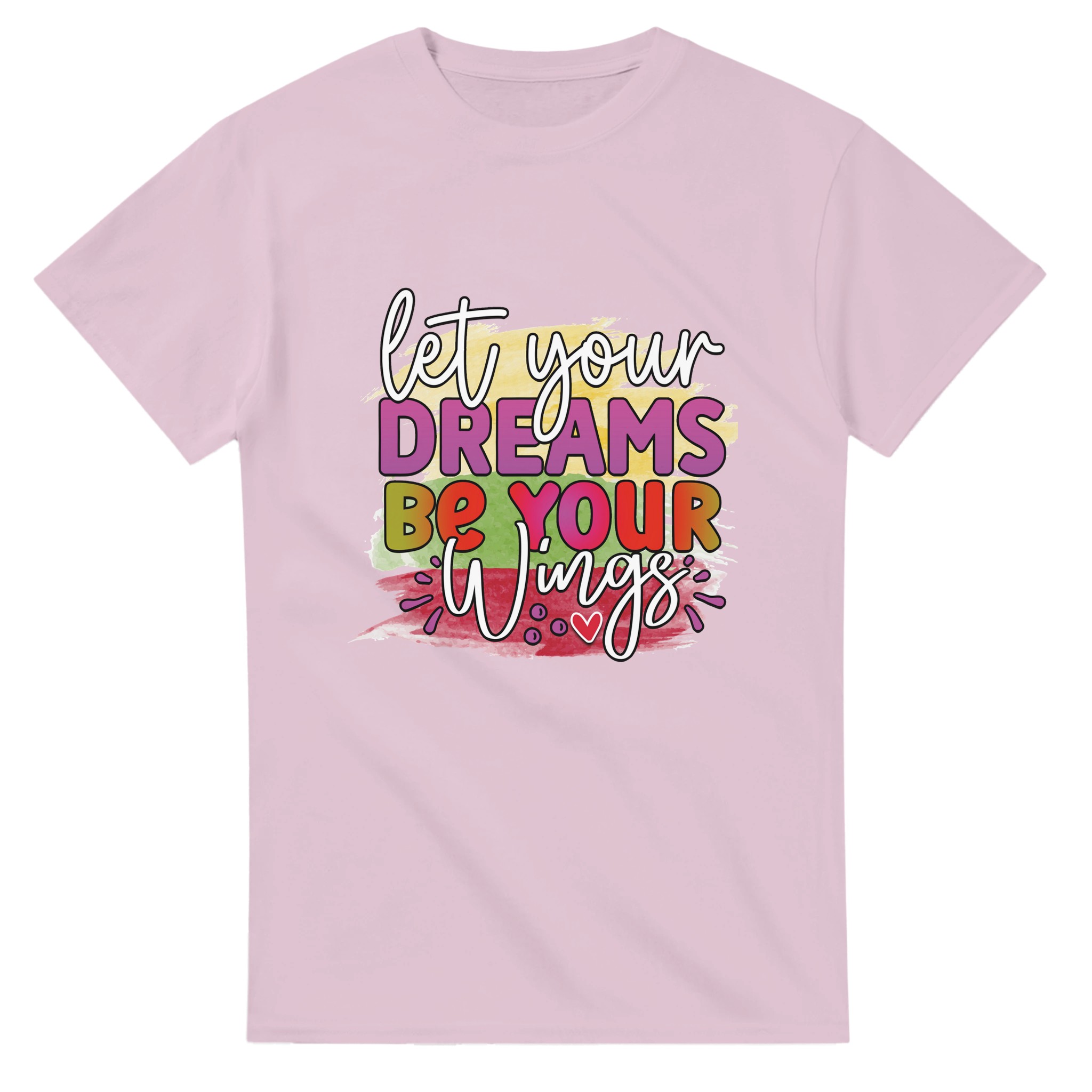 Låt din inre inspiration flöda med vår ‘Låt Dina Drömmar Vara Dina Vingar’ T-shirt. Denna design, fylld med upplyftande budskap och en palett av glada färger, är mer än bara ett plagg – det är en påminnelse om att sträva efter dina mål varje dag. Perfekt för den som vill bära sitt hjärta på ärmen och sprida positivitet, oavsett om du är på jobbet, gymmet eller ute med vänner. Tillverkad av 100% bomull, erbjuder denna t-shirt både en bekväm passform och en varaktig kvalitet som matchar ditt ständiga driv.