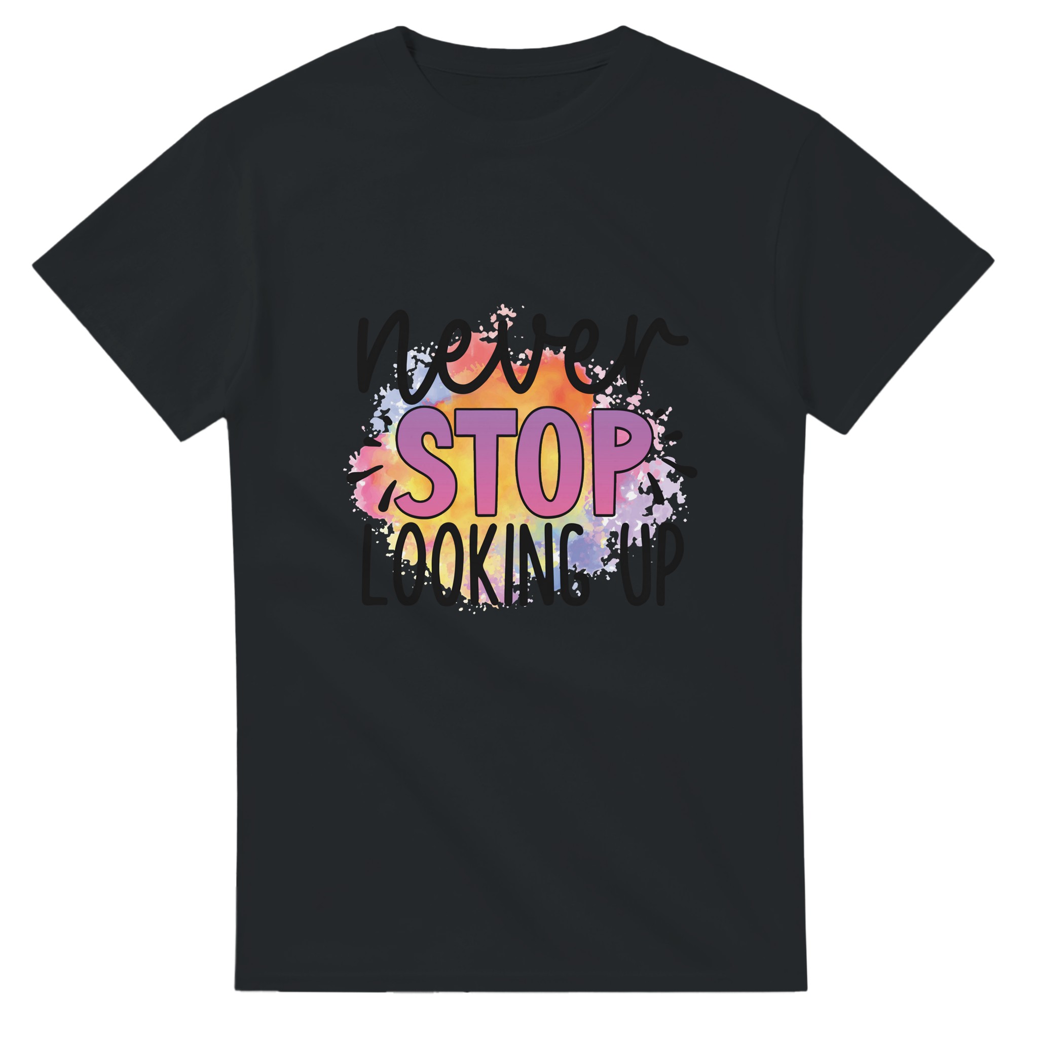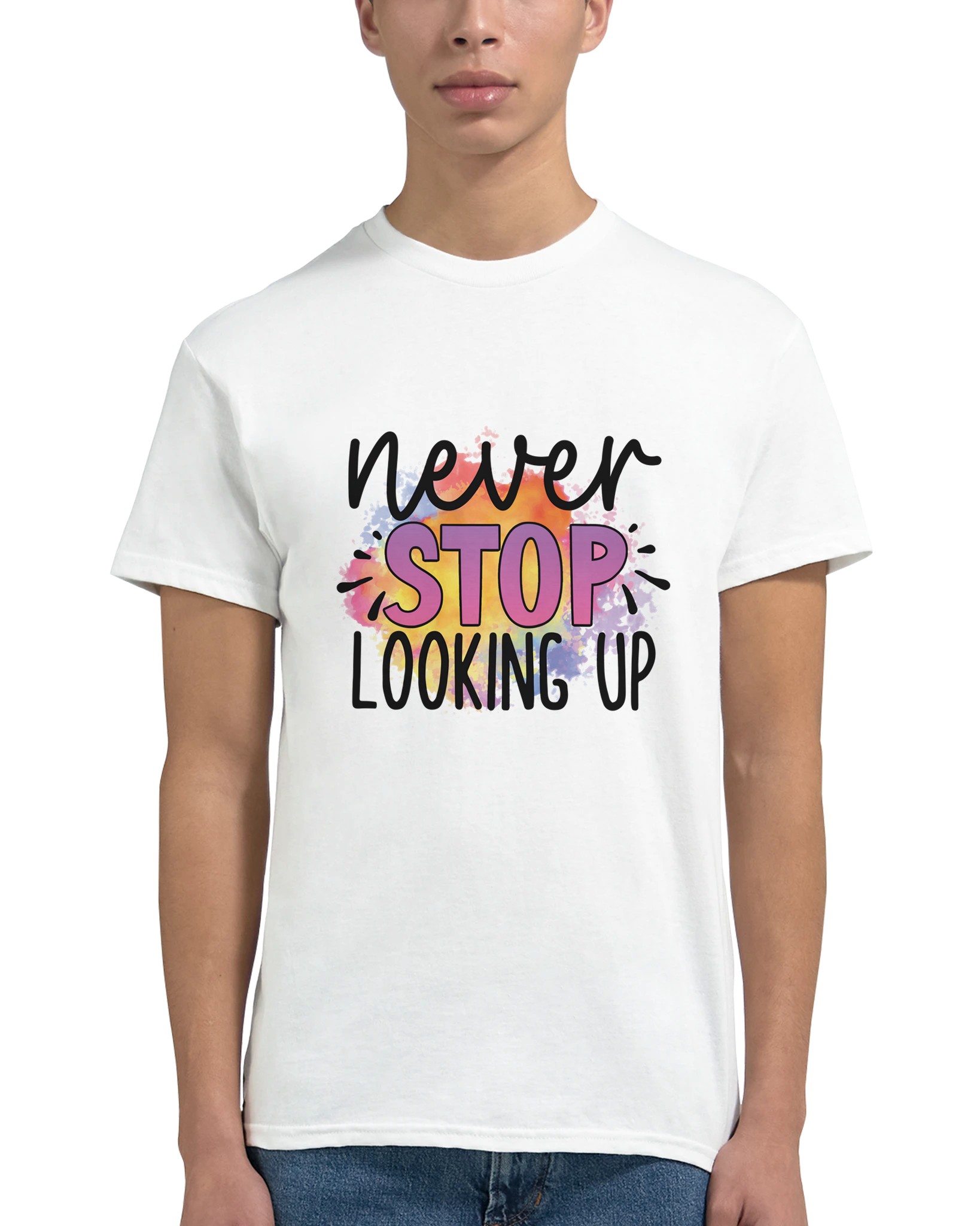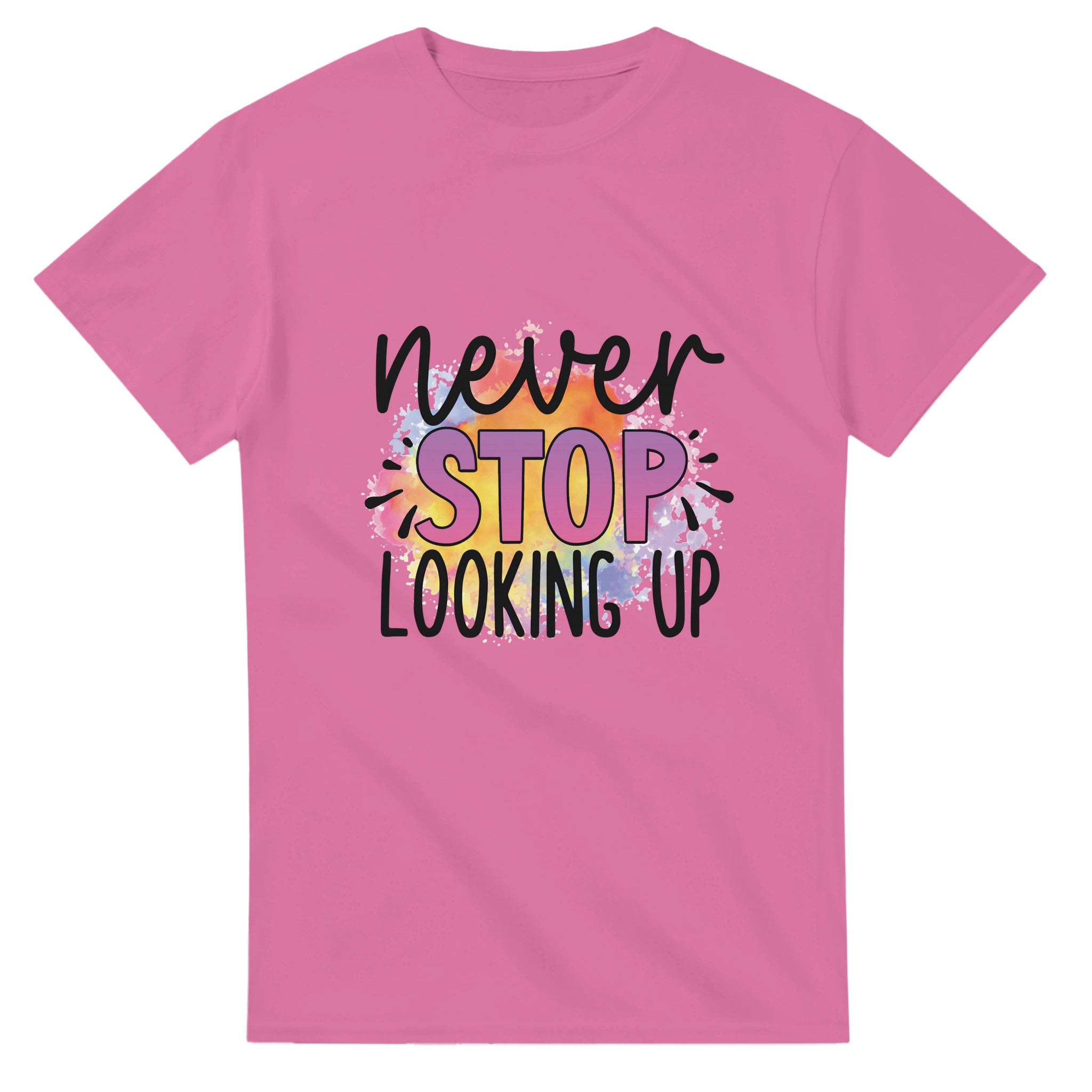 Sluta leta – du har hittat din nya favorittröja! Denna t-shirt är mer än bara ett plagg; den är ett uttryck med sin livfulla akvarelldesign och djärva budskap. Varje tröja har en unik och färgsprakande palett som smälter samman regnbågens nyanser till en dynamisk bakgrund för ditt personliga statement. Perfekt för den som vill addera en pop av färg och personlighet till sin vardagsstil, eller för att sticka ut på event.