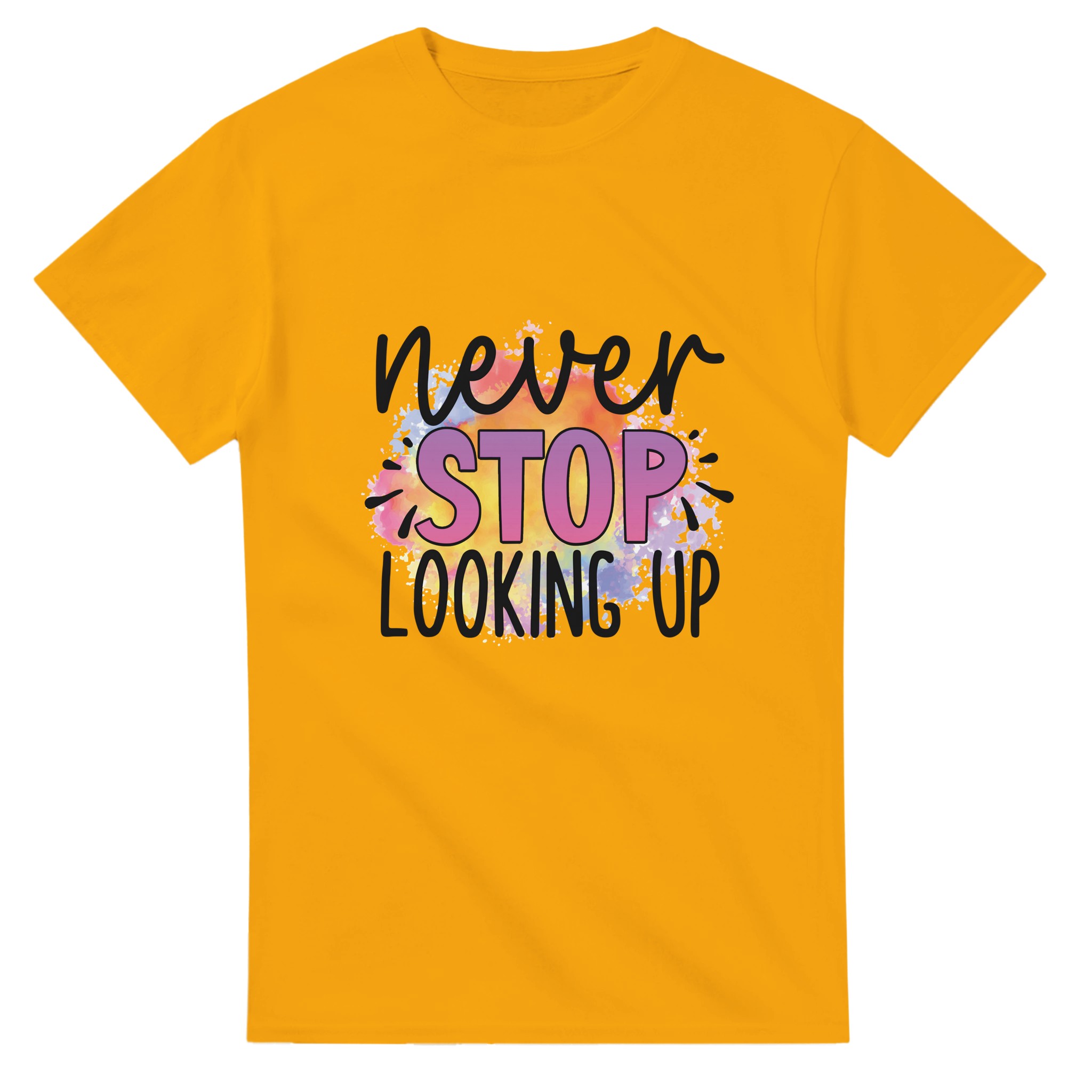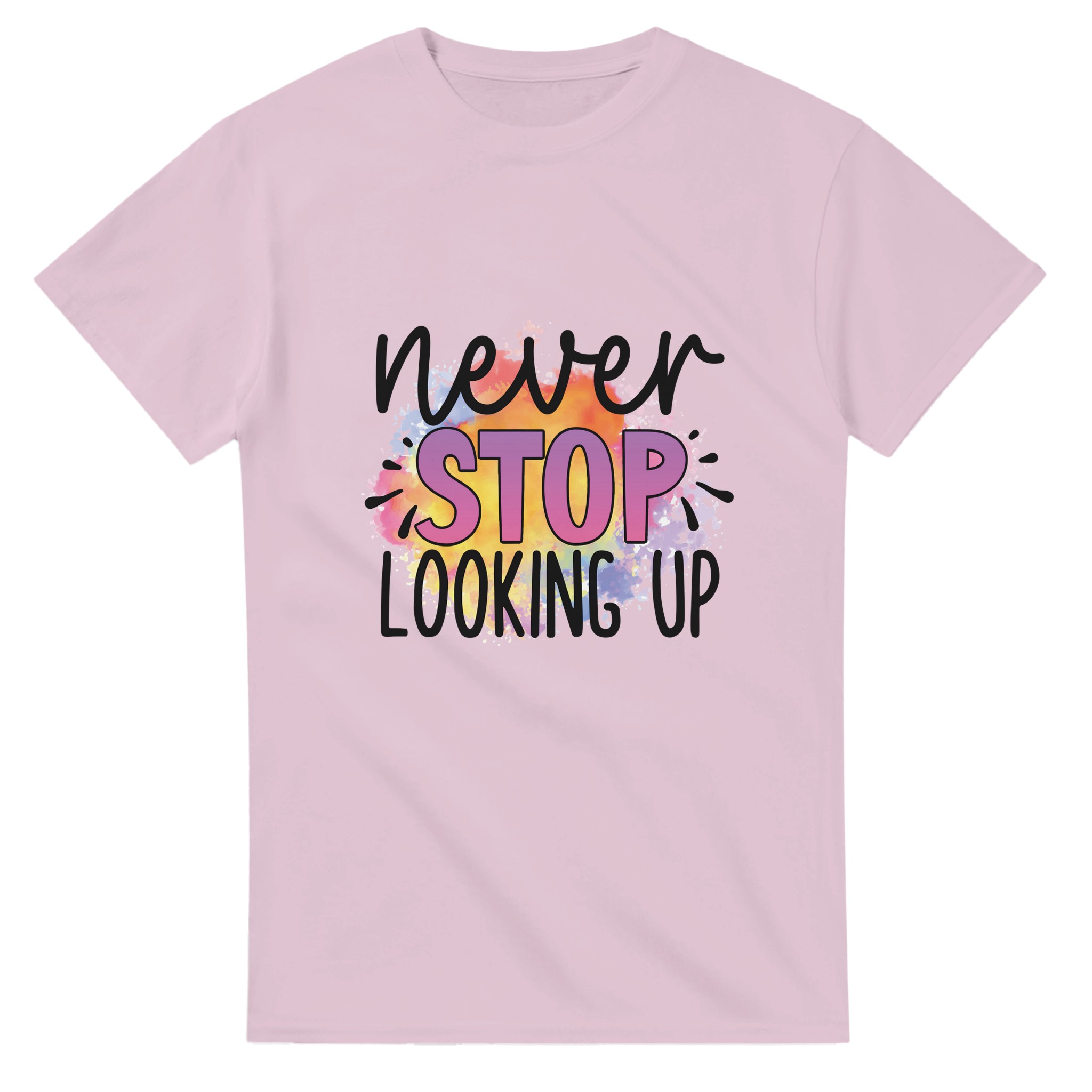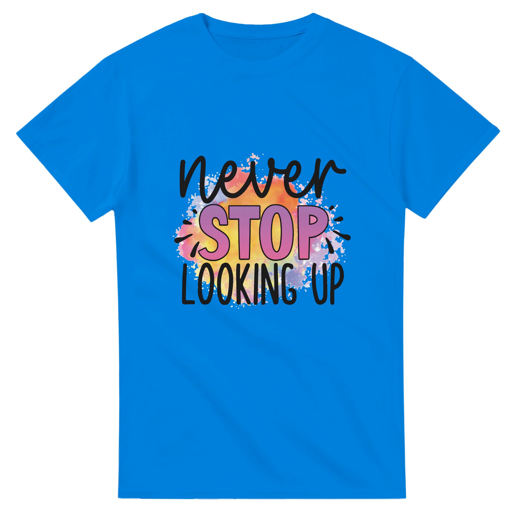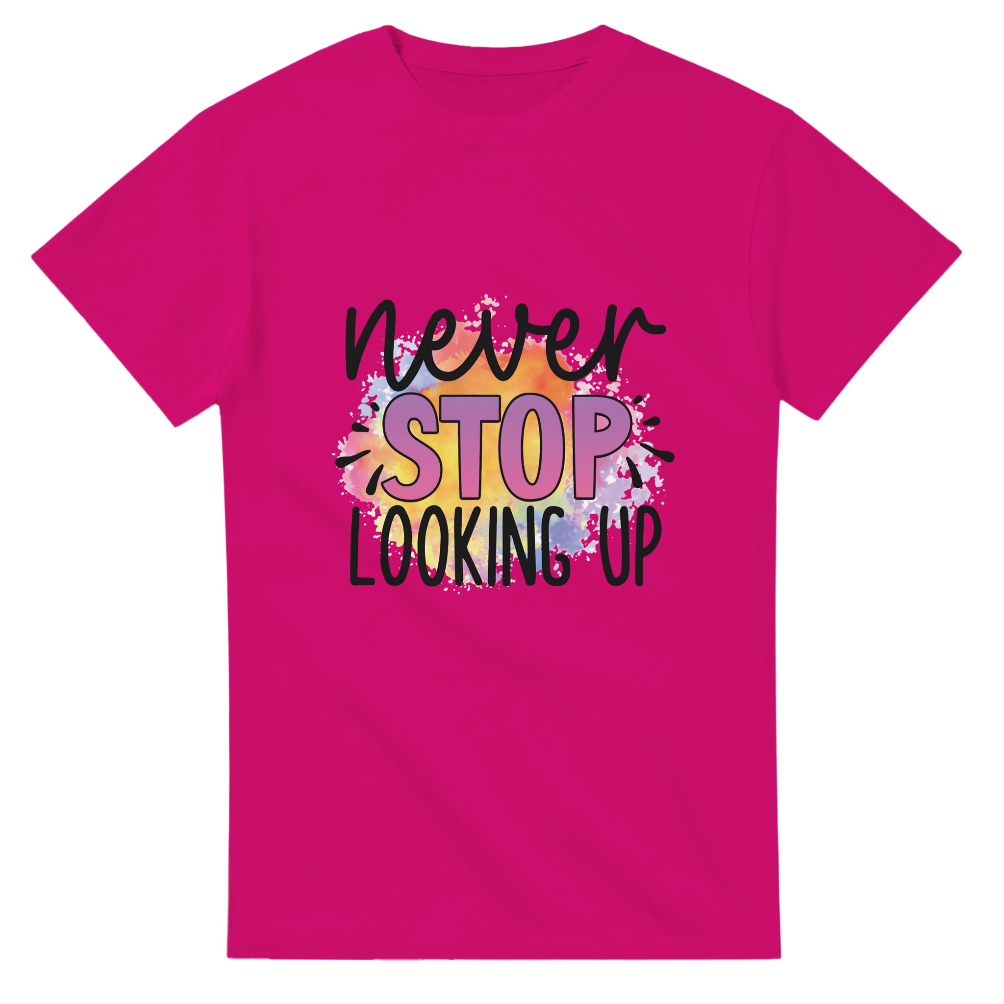 Sluta leta – du har hittat din nya favorittröja! Denna t-shirt är mer än bara ett plagg; den är ett uttryck med sin livfulla akvarelldesign och djärva budskap. Varje tröja har en unik och färgsprakande palett som smälter samman regnbågens nyanser till en dynamisk bakgrund för ditt personliga statement. Perfekt för den som vill addera en pop av färg och personlighet till sin vardagsstil, eller för att sticka ut på event.