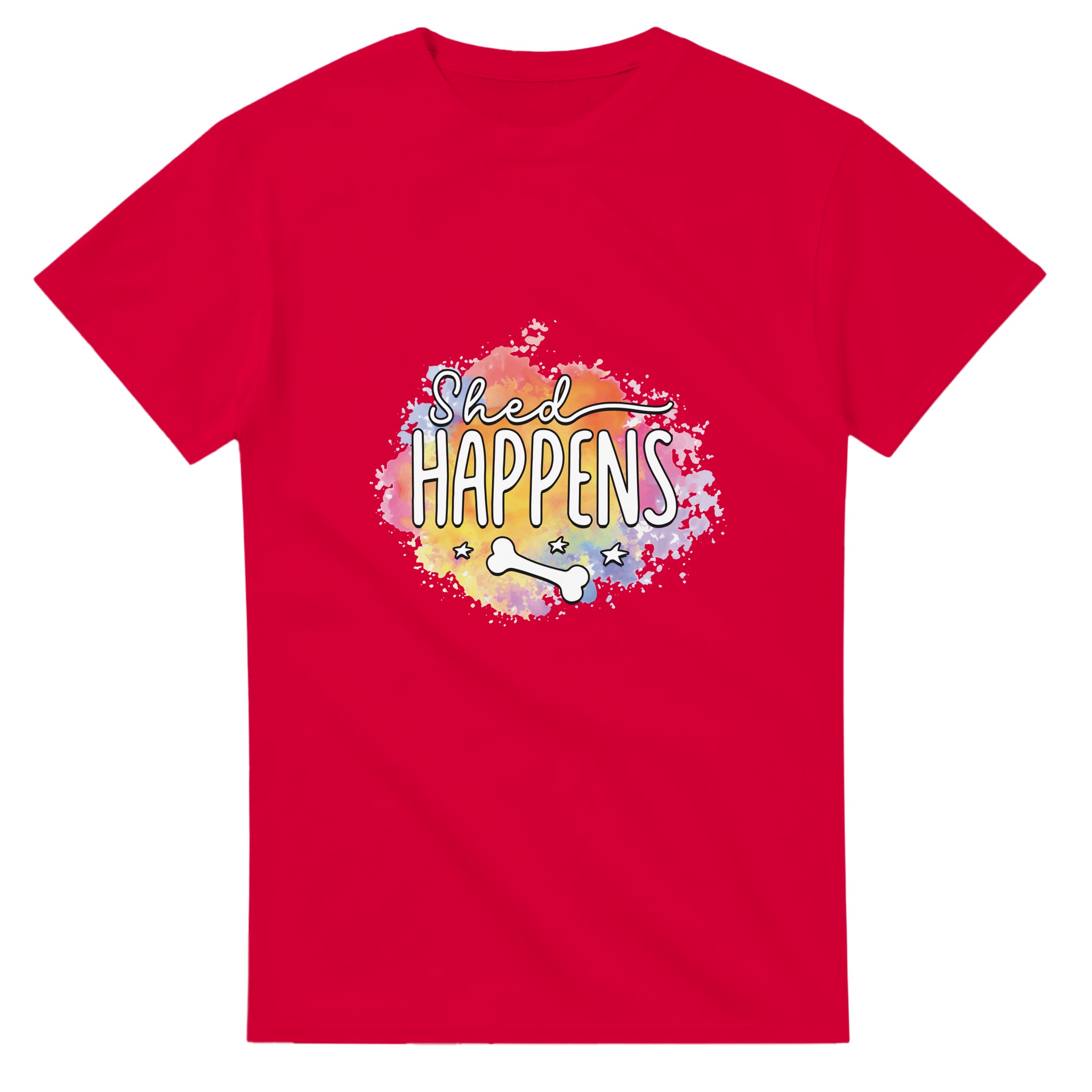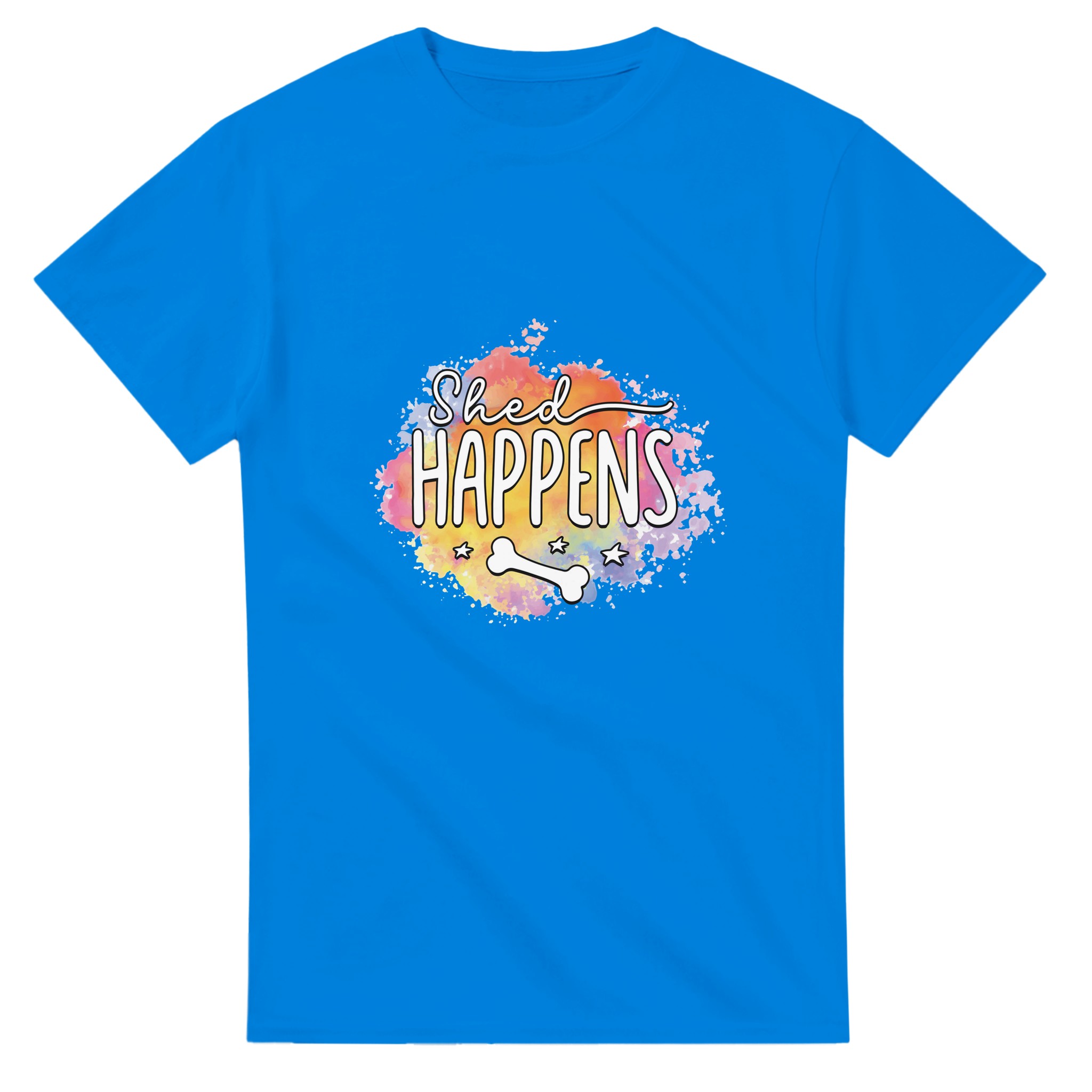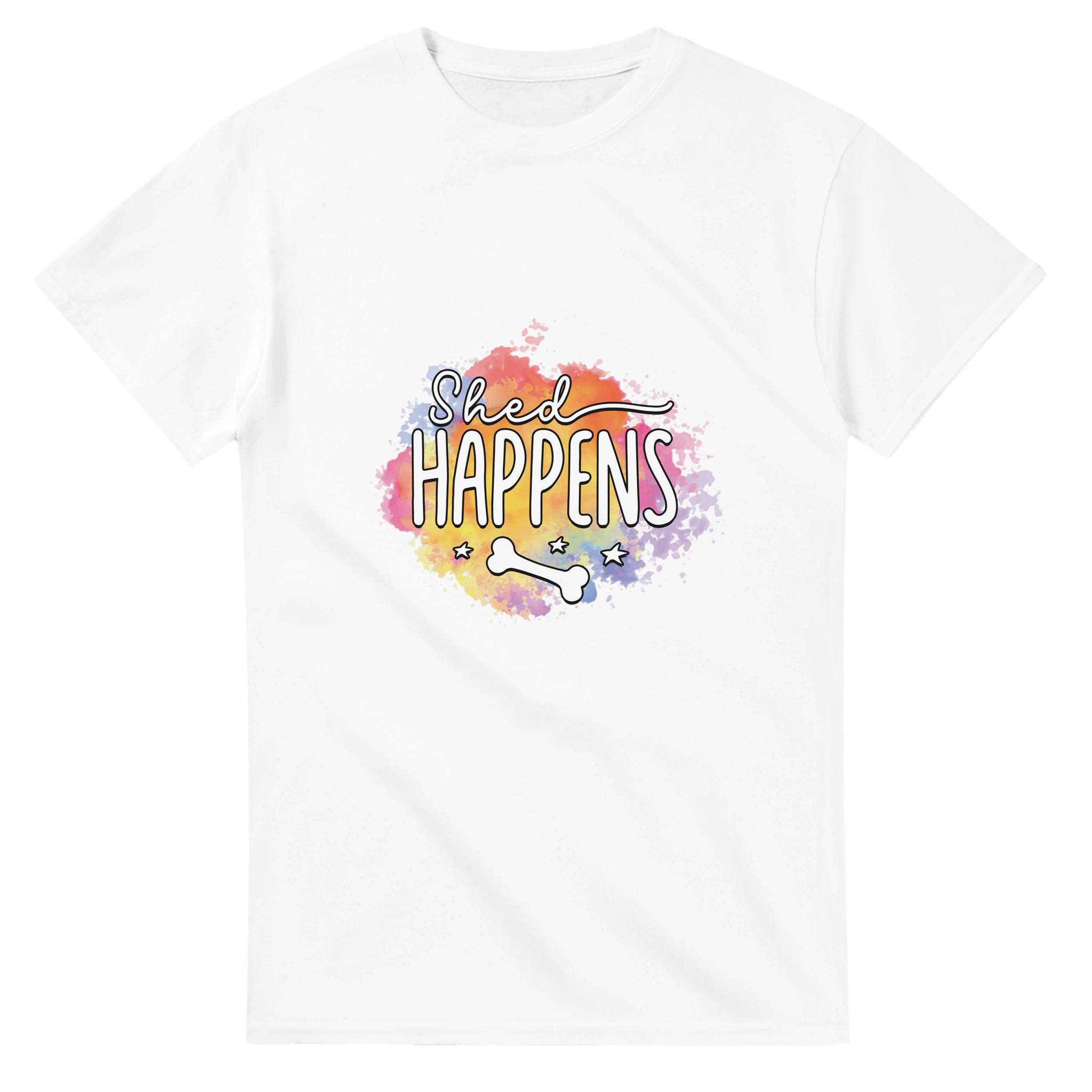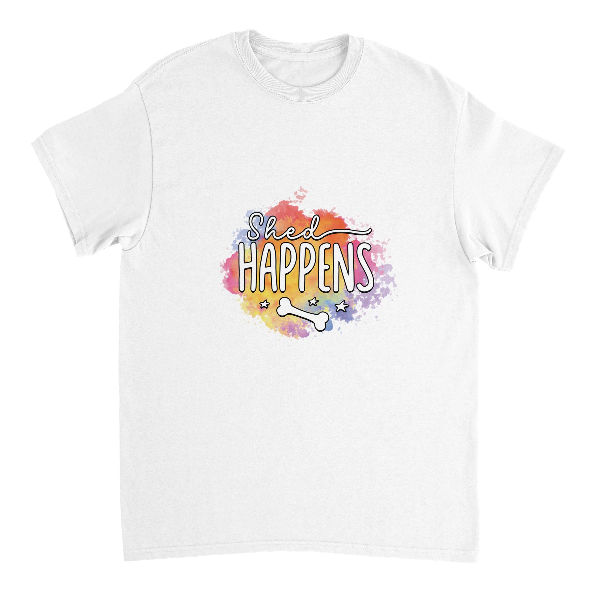 Humoristisk “Shed Happens” T-shirt – Lekfull Design med Akvarellbakgrund, Unisex och Tålig för Hundälskare
