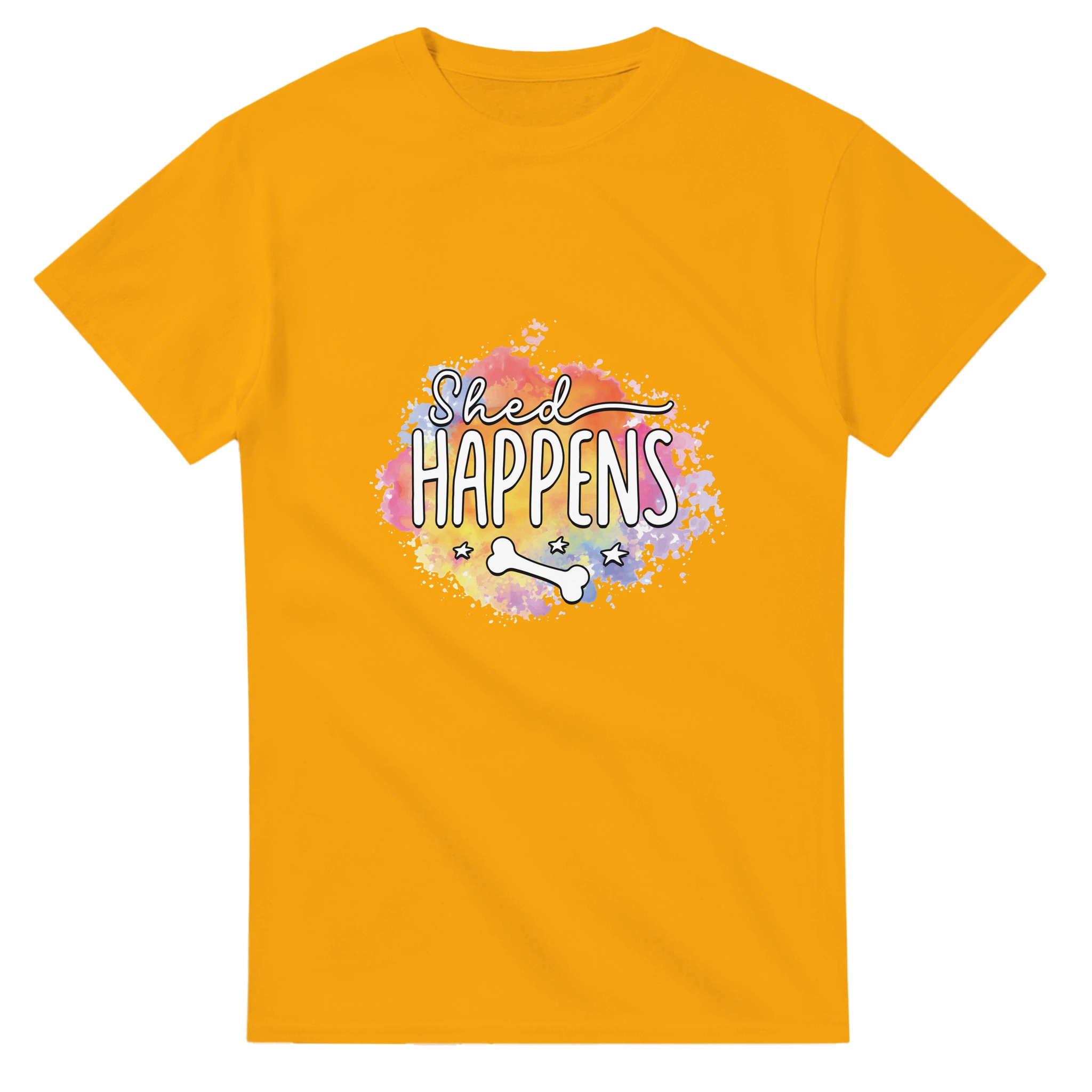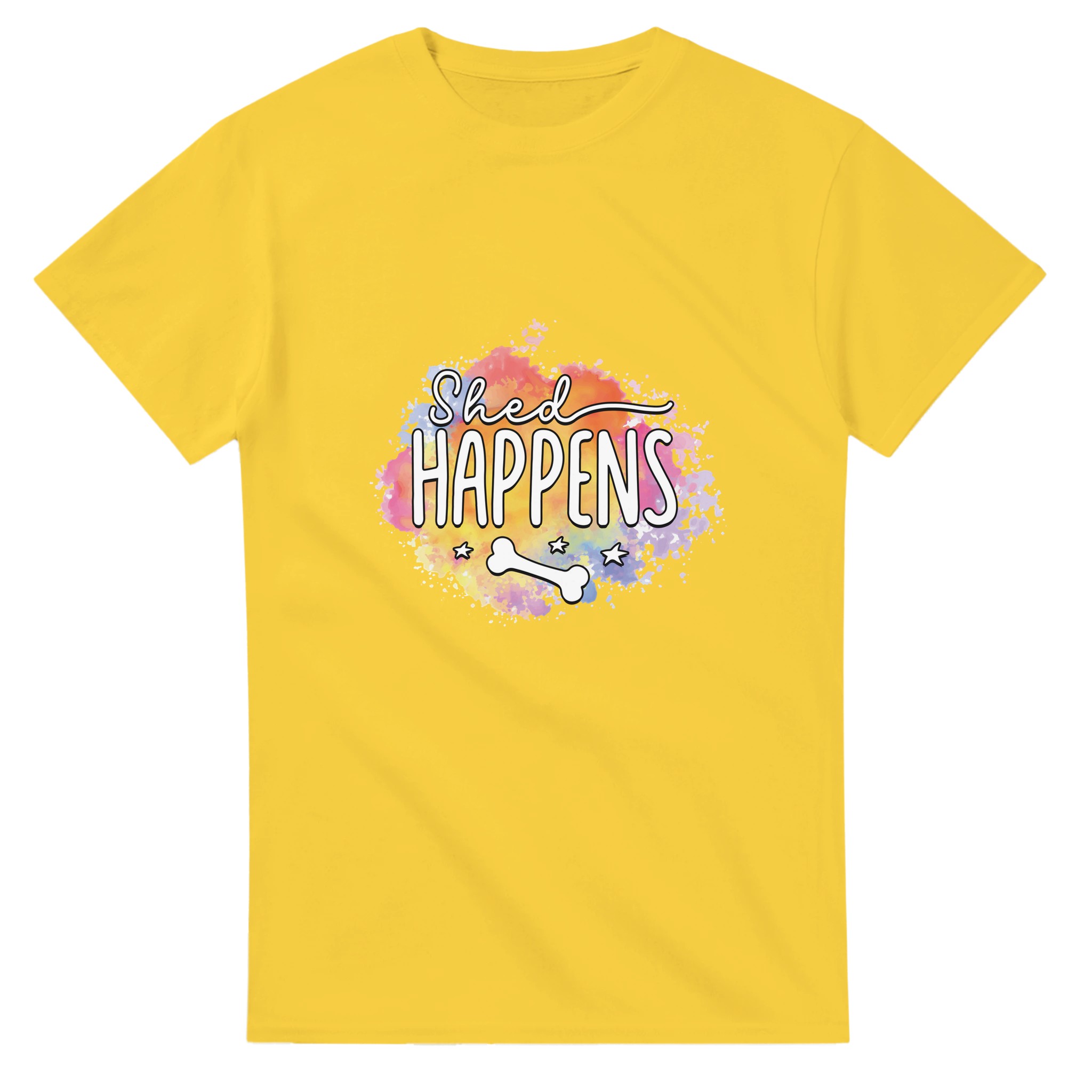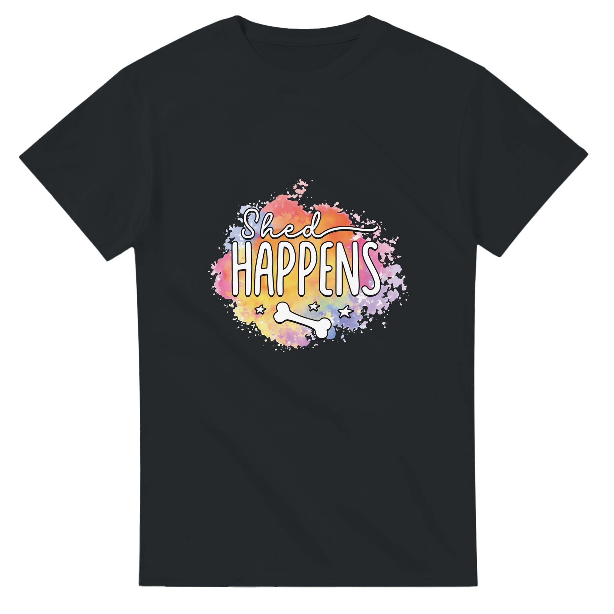 Humoristisk “Shed Happens” T-shirt – Lekfull Design med Akvarellbakgrund, Unisex och Tålig för Hundälskare