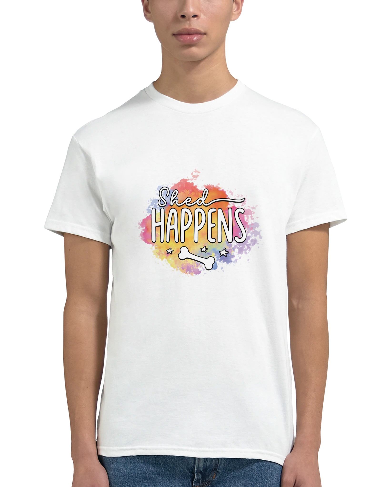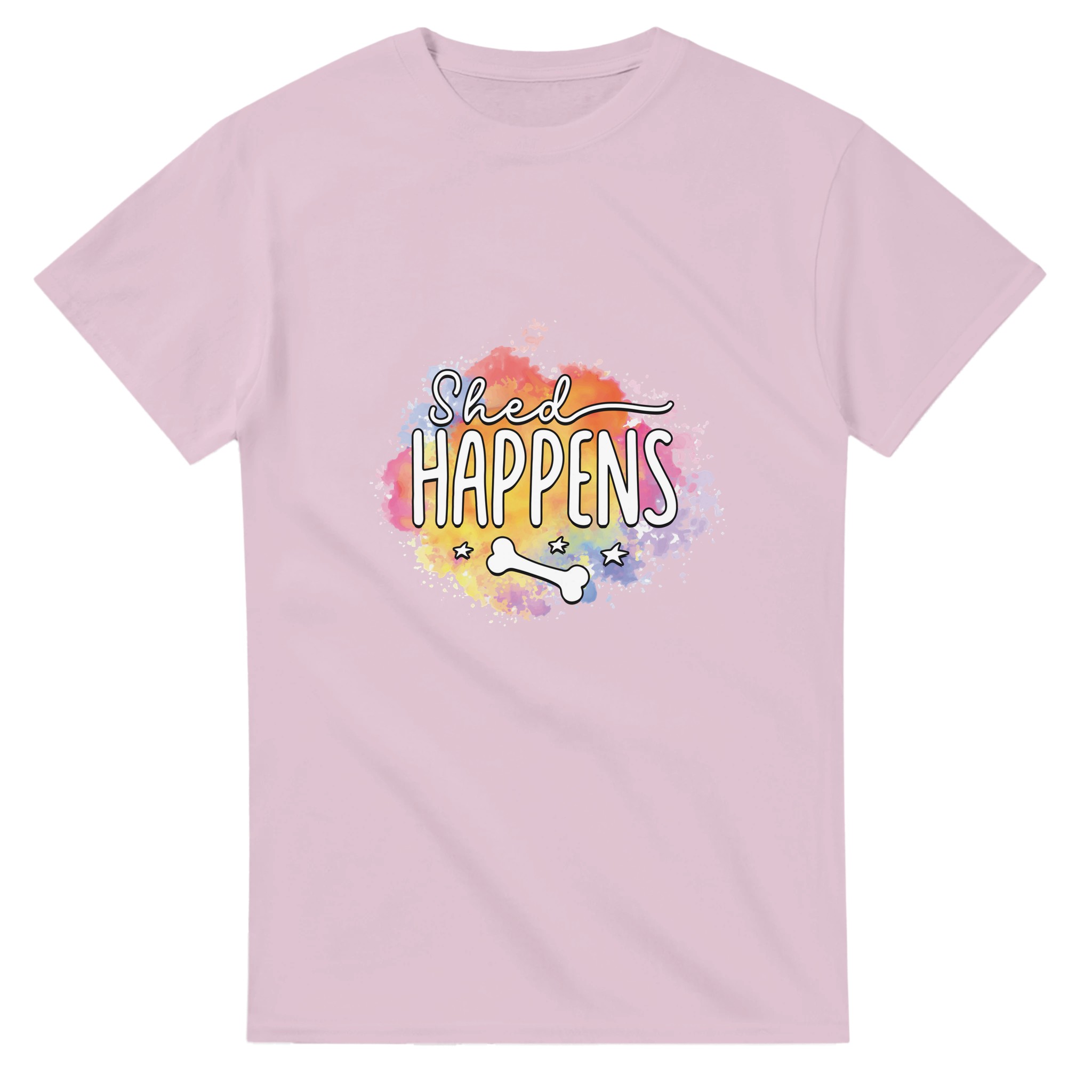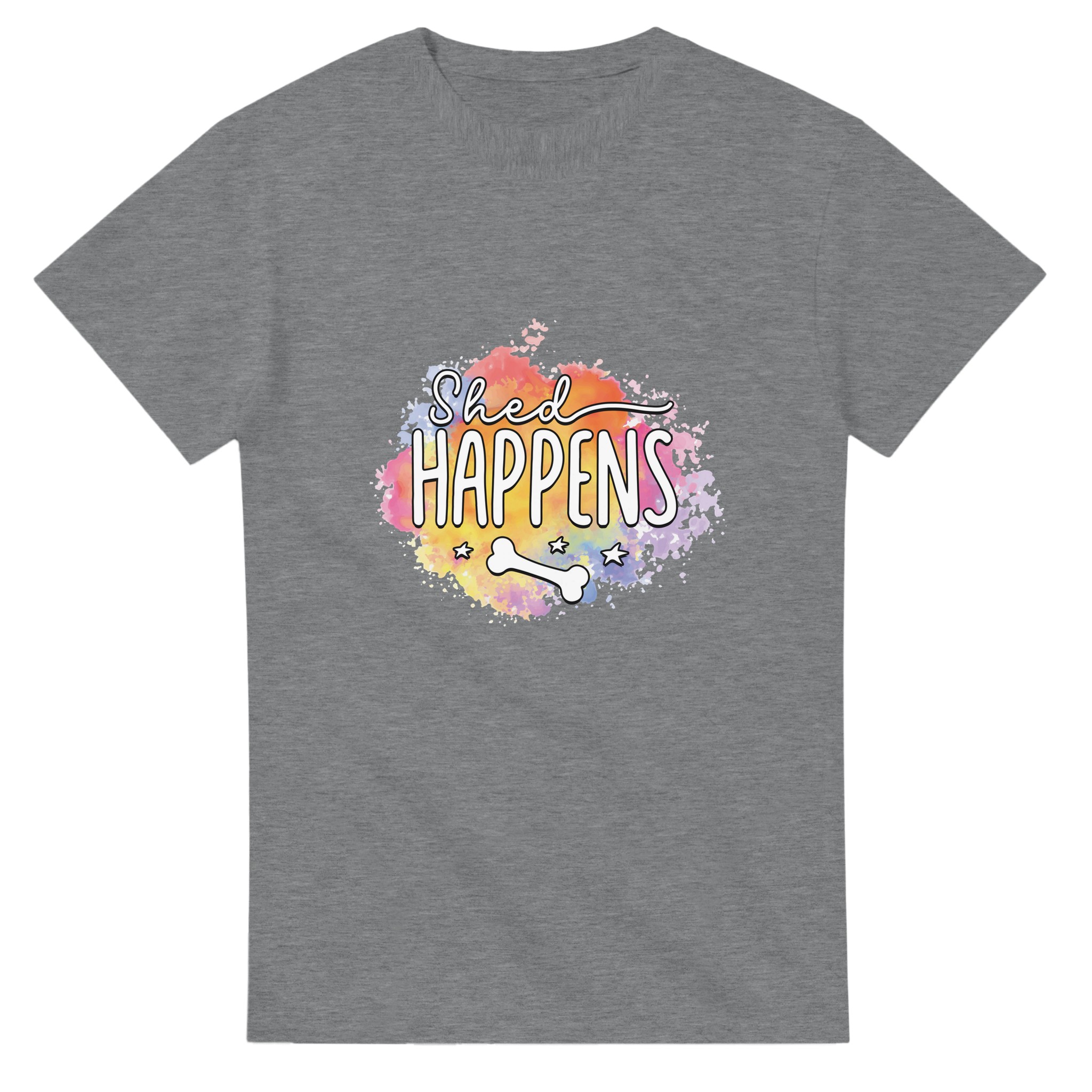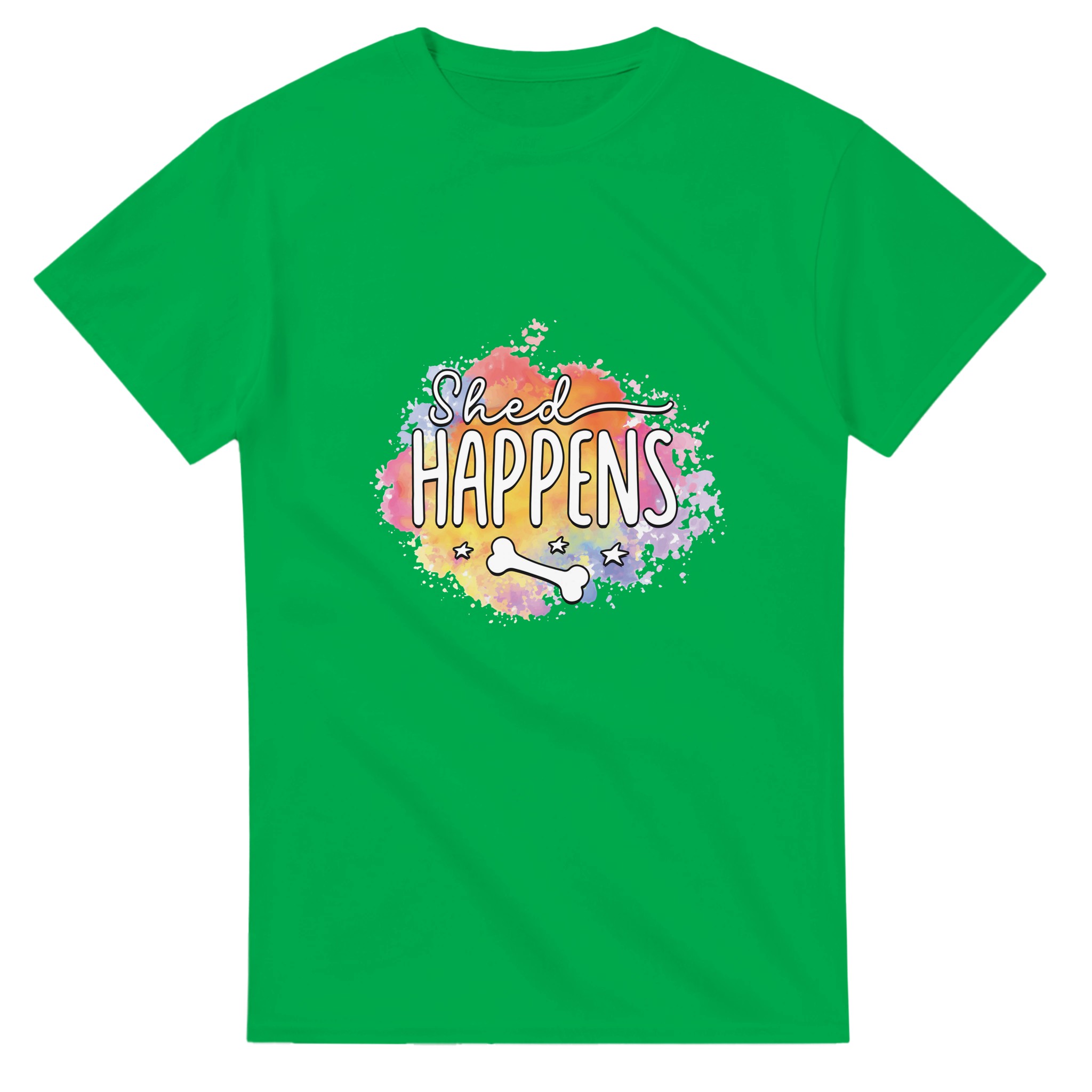 Humoristisk “Shed Happens” T-shirt – Lekfull Design med Akvarellbakgrund, Unisex och Tålig för Hundälskare