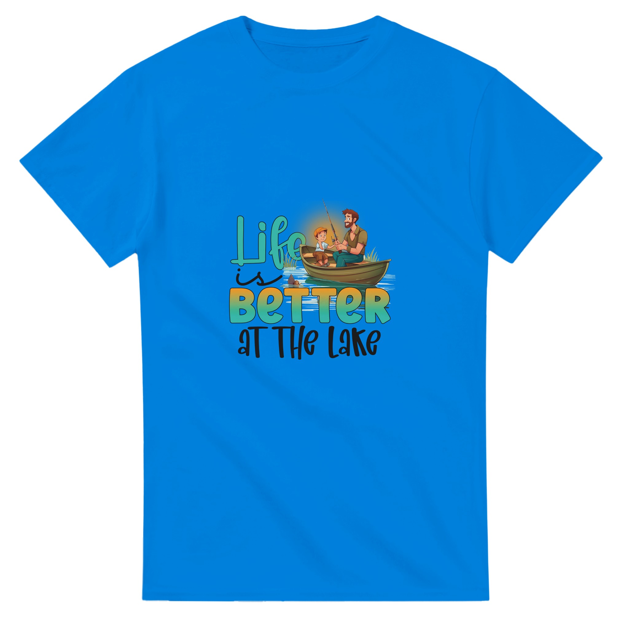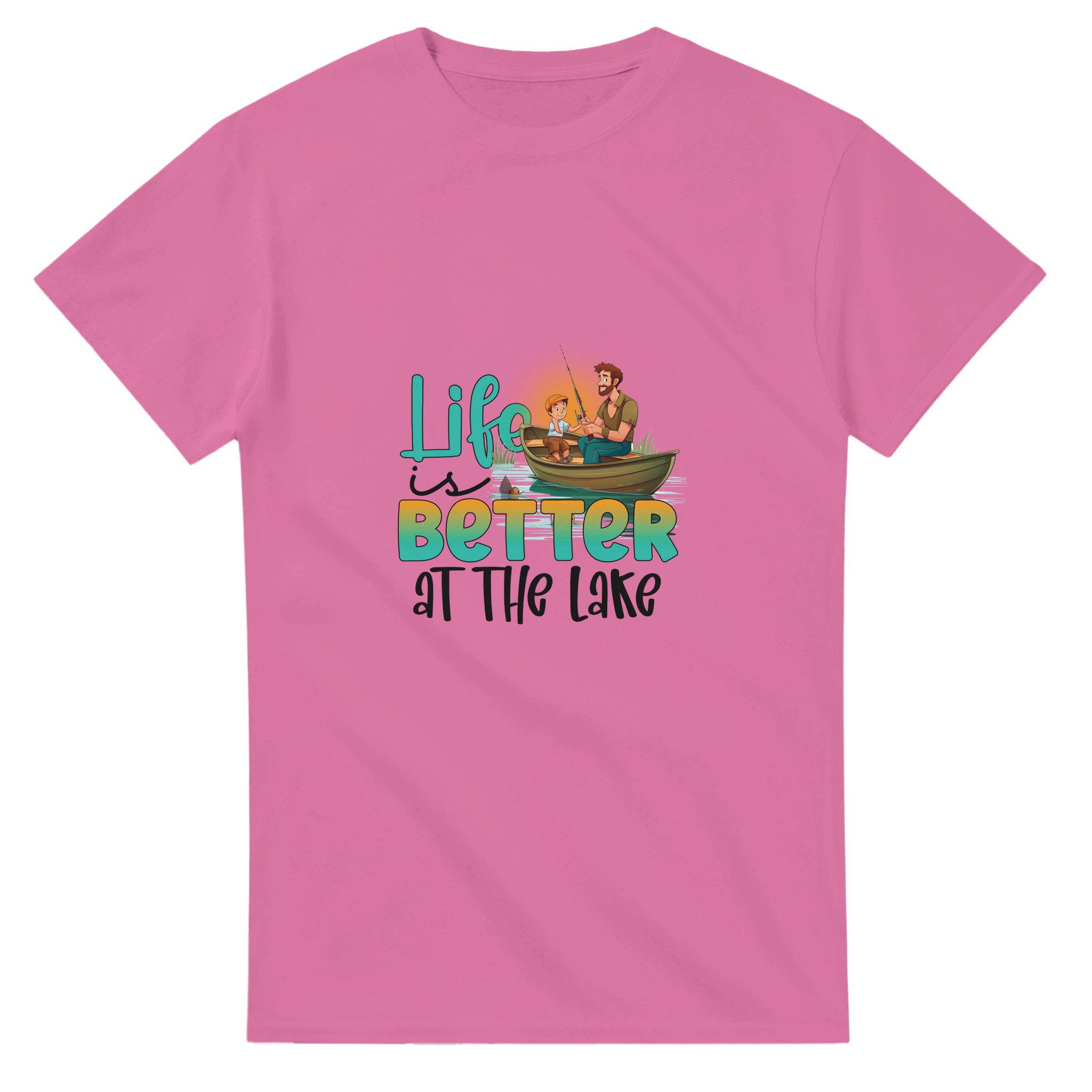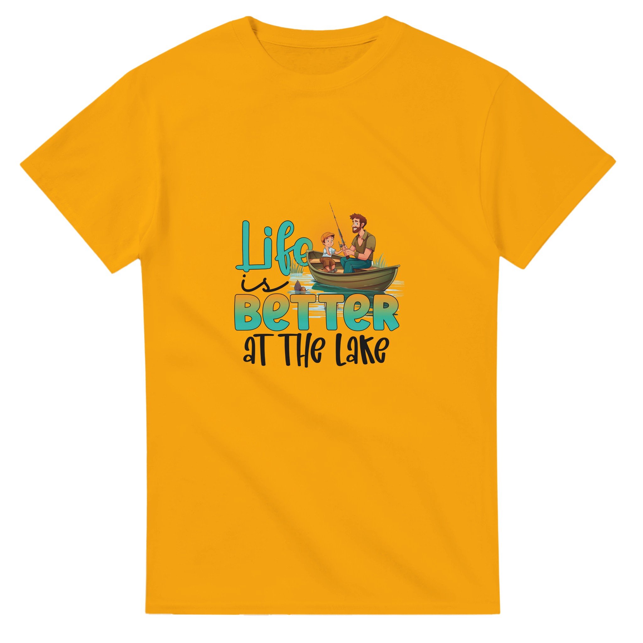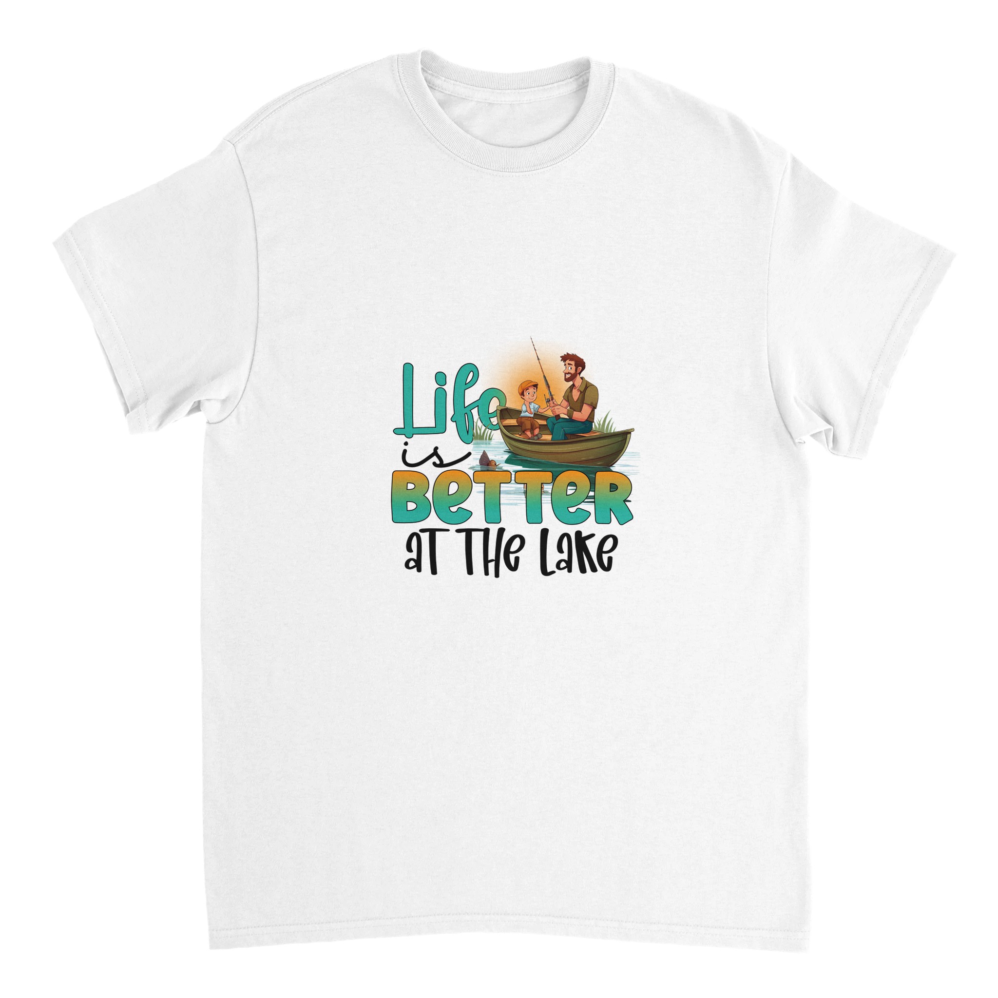 Life is Better at The Lake | Bekväm Unisex T-shirt i Tung Bomull med Fiske-motiv