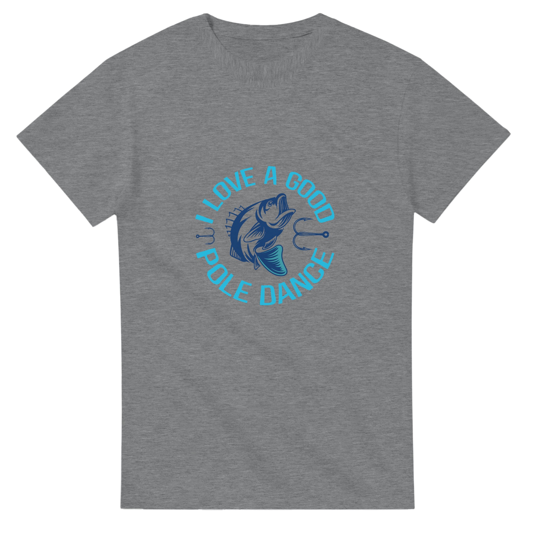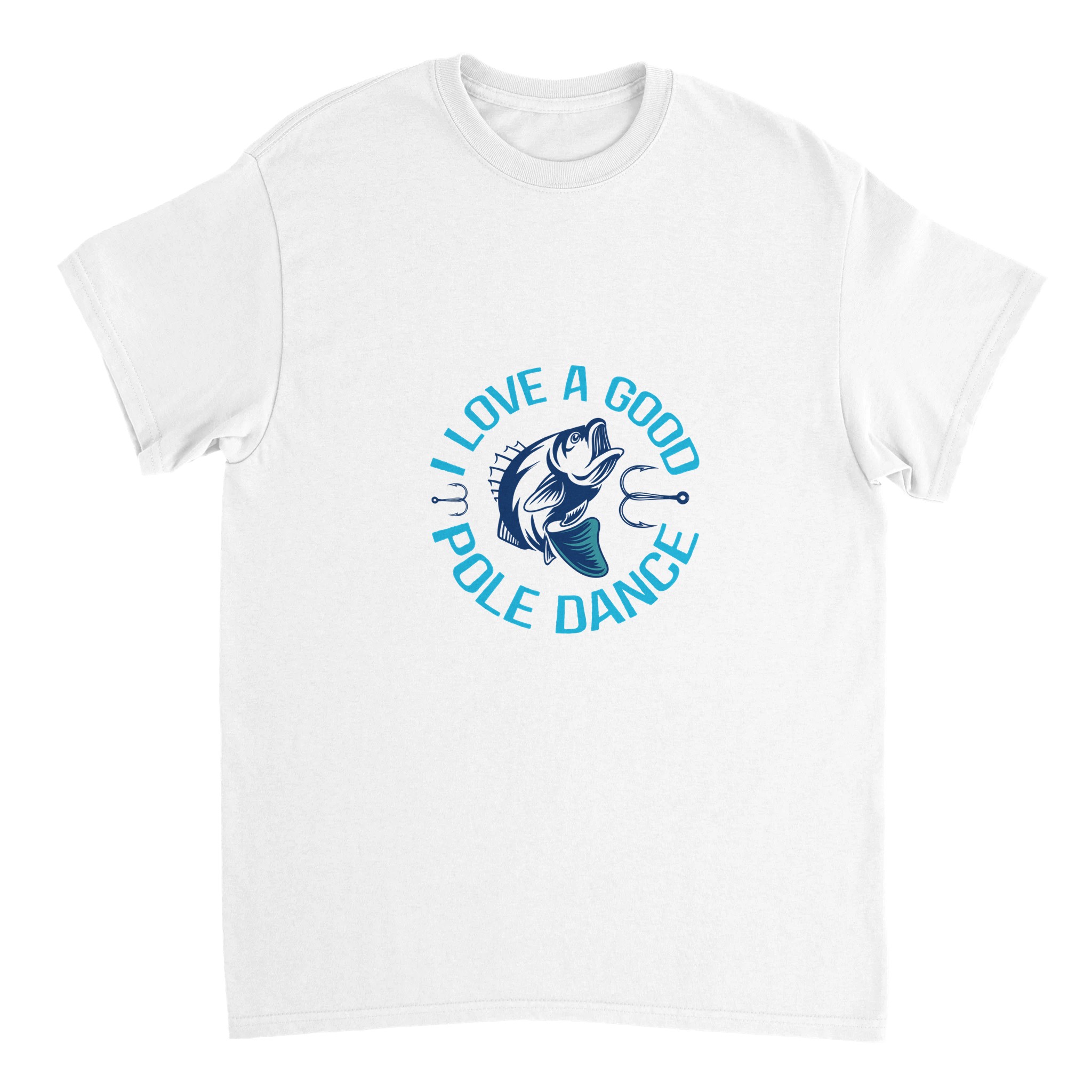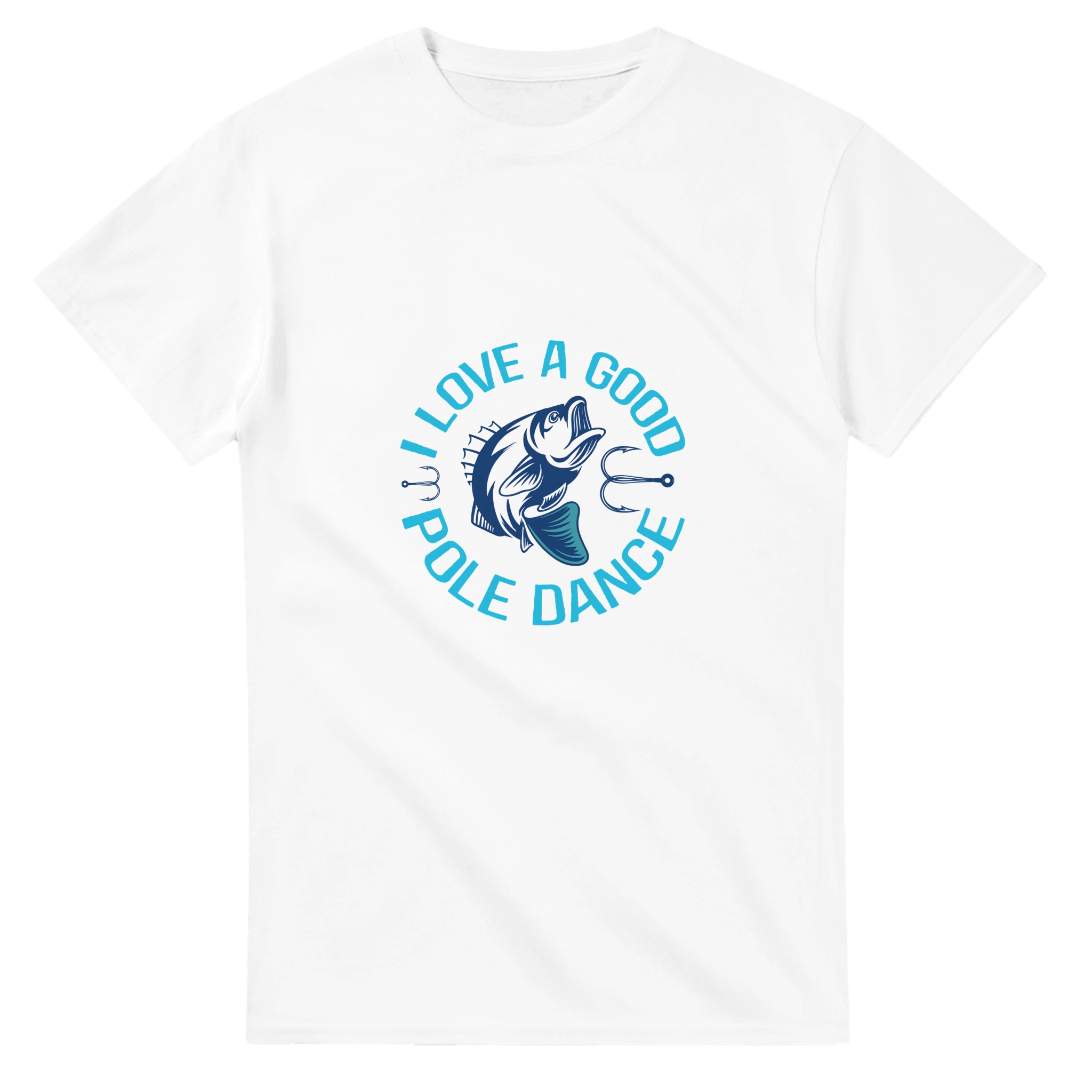 Humoristisk Fiskedesign T-shirt | ‘I Love A Good Pole Dance’ med Bass Fisk & Krokar