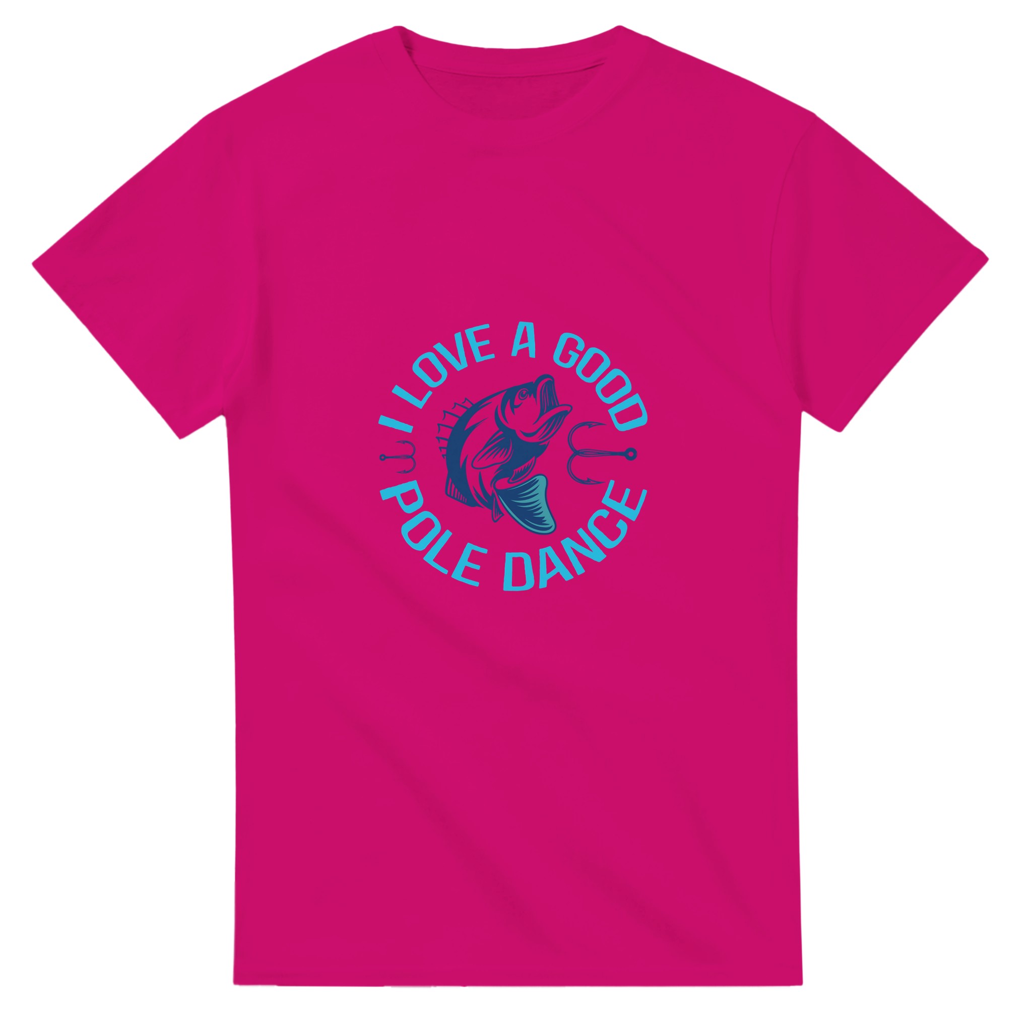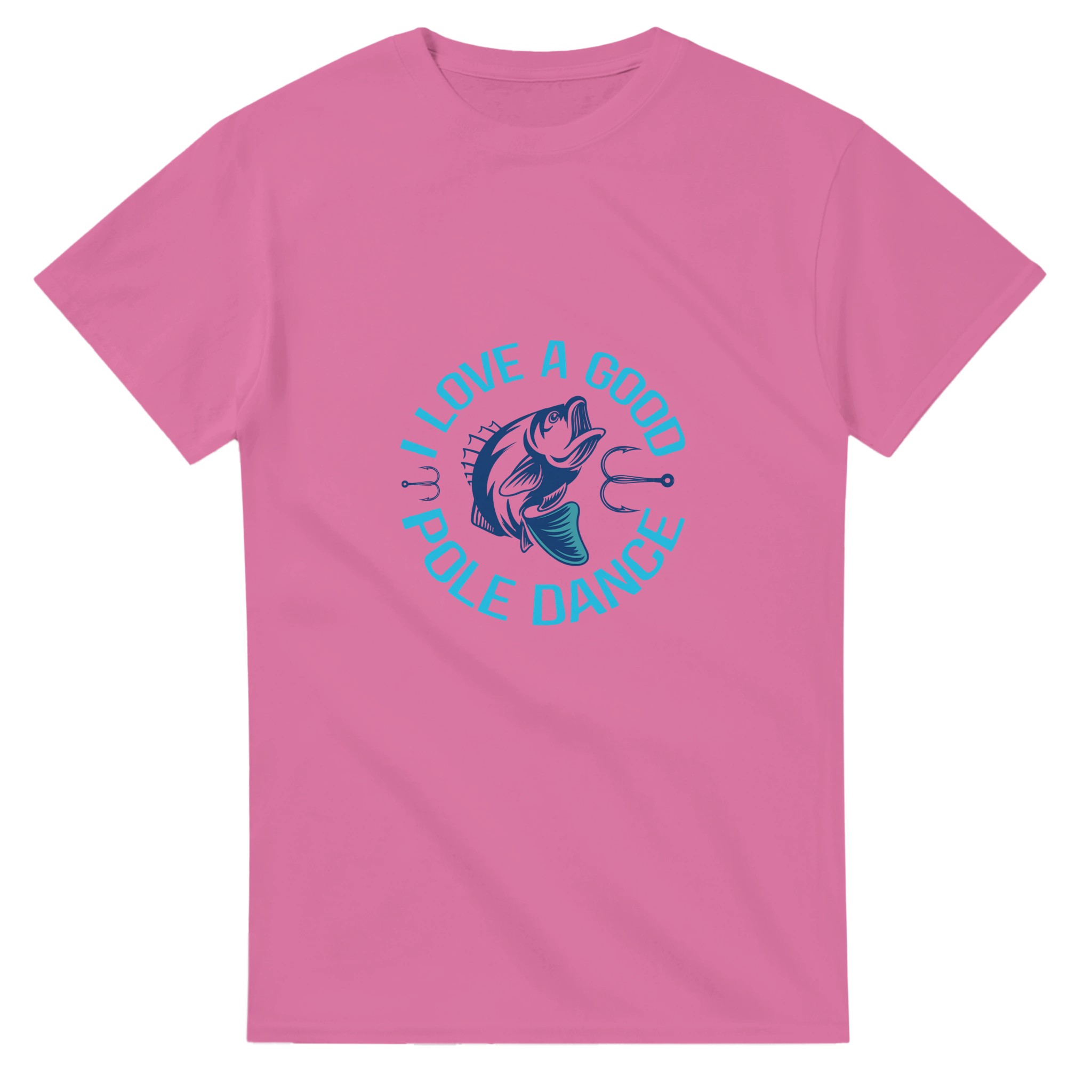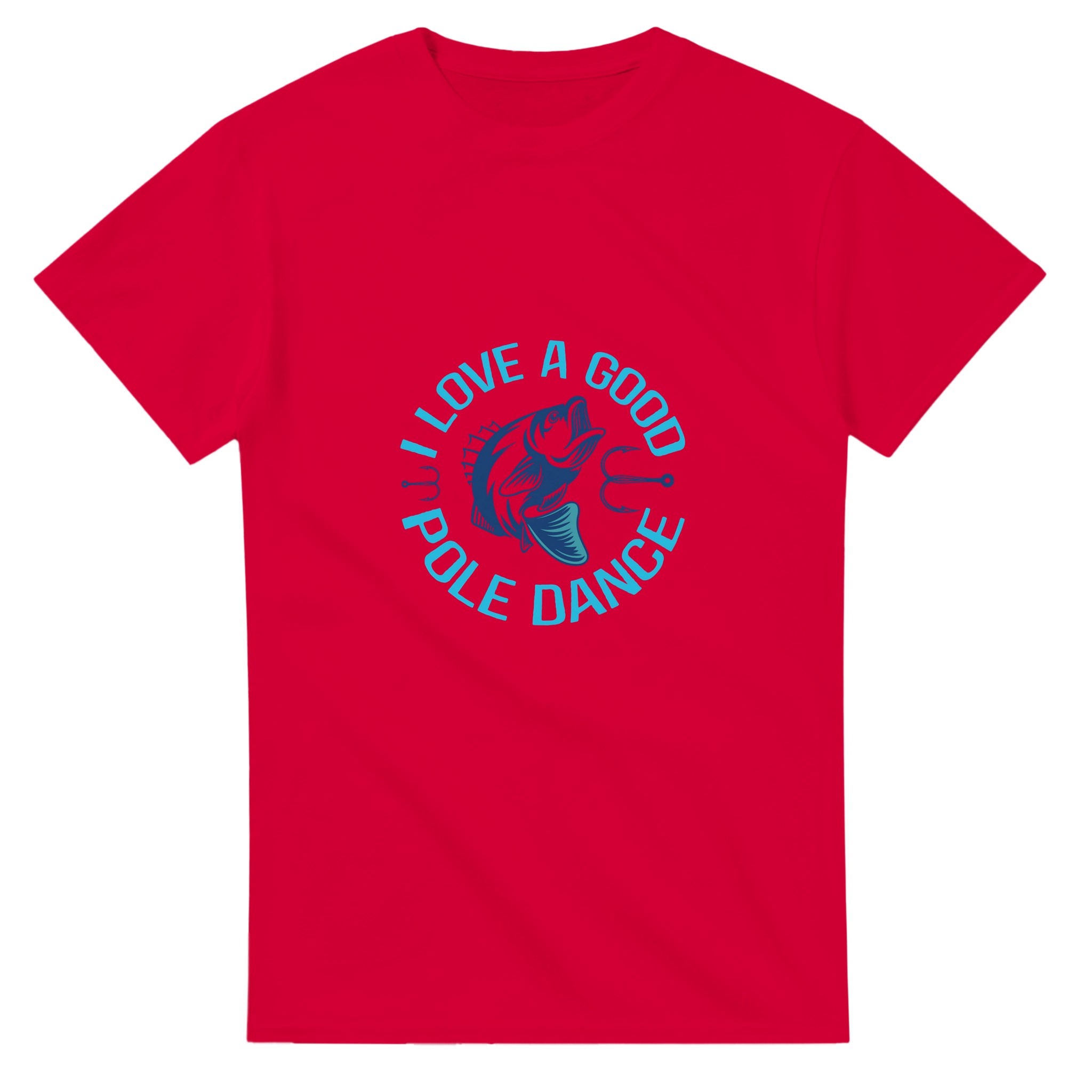 Humoristisk Fiskedesign T-shirt | ‘I Love A Good Pole Dance’ med Bass Fisk & Krokar