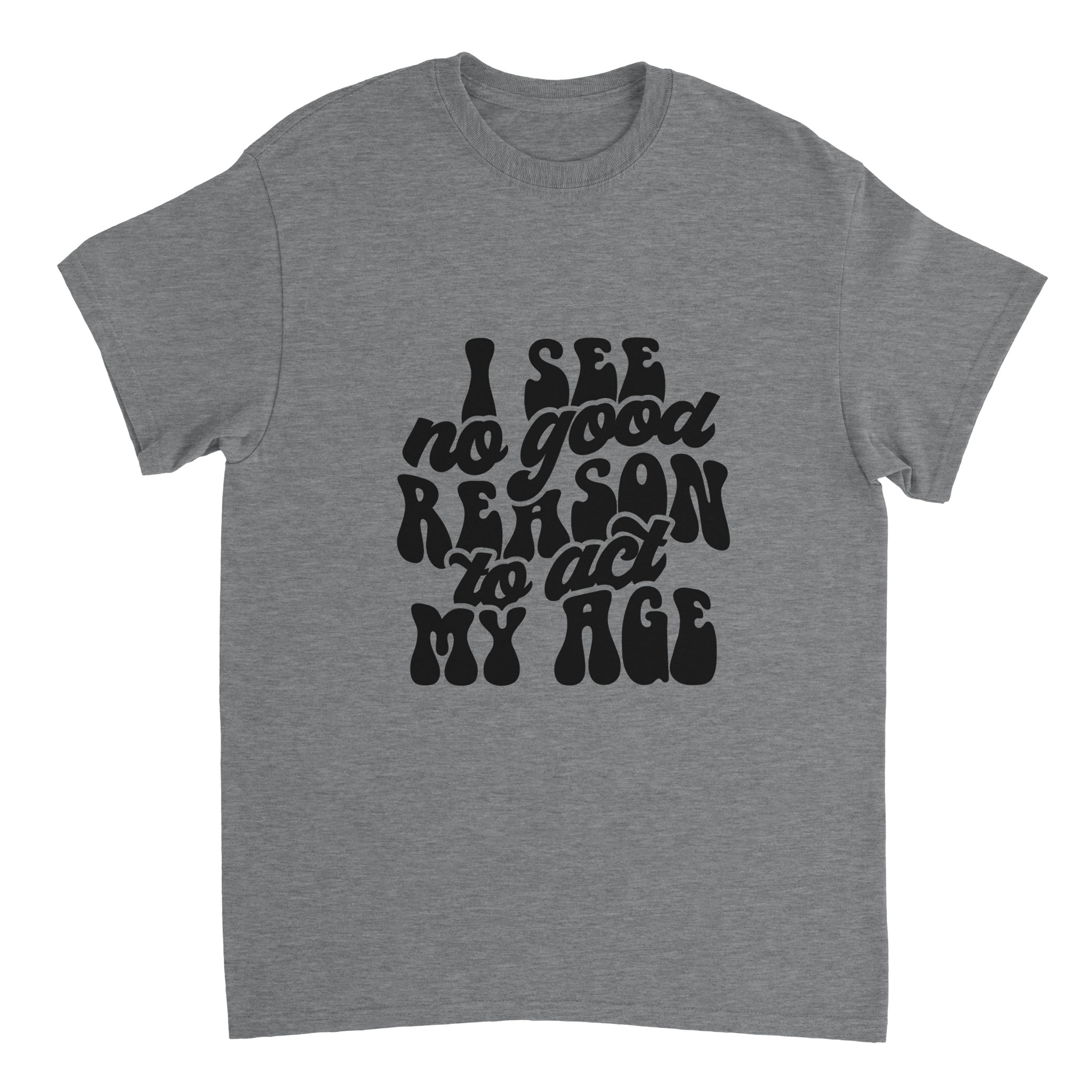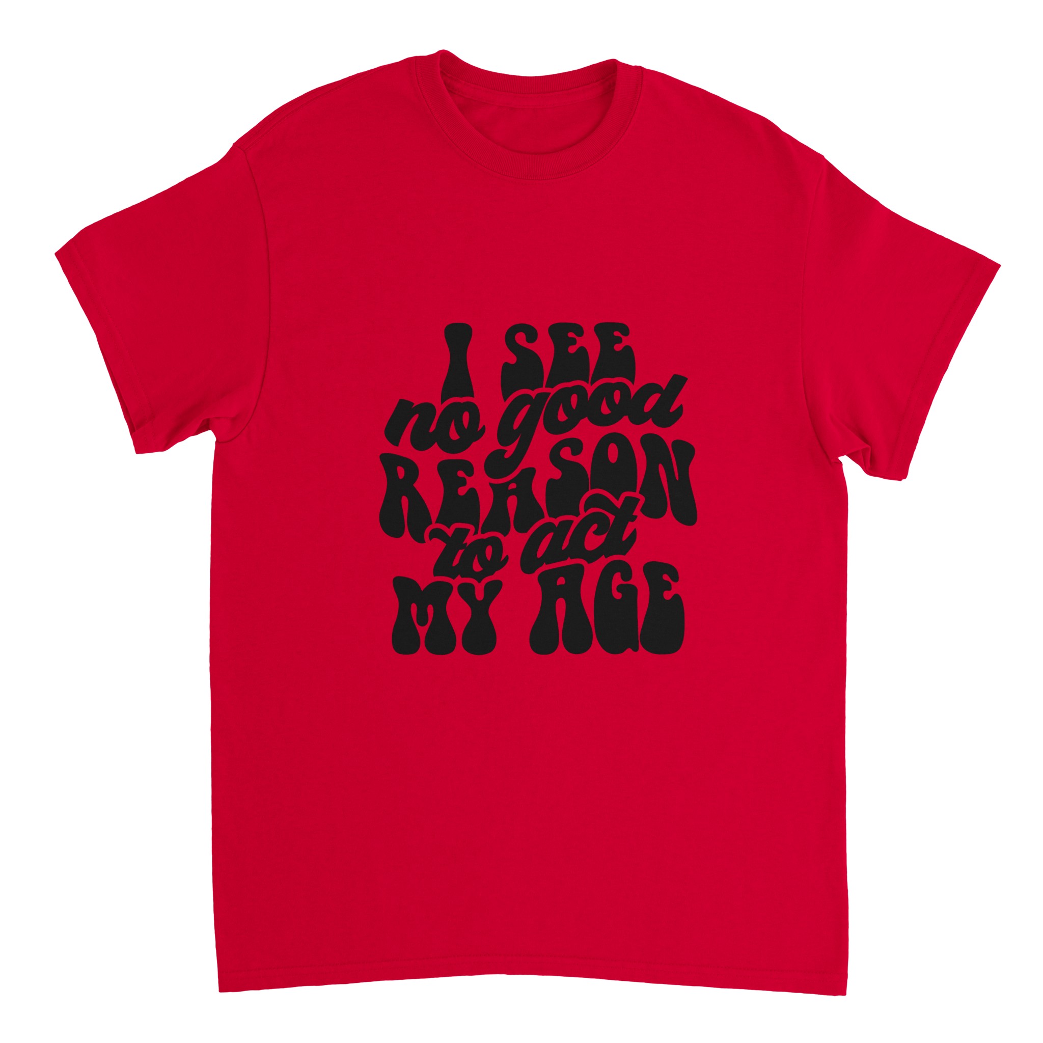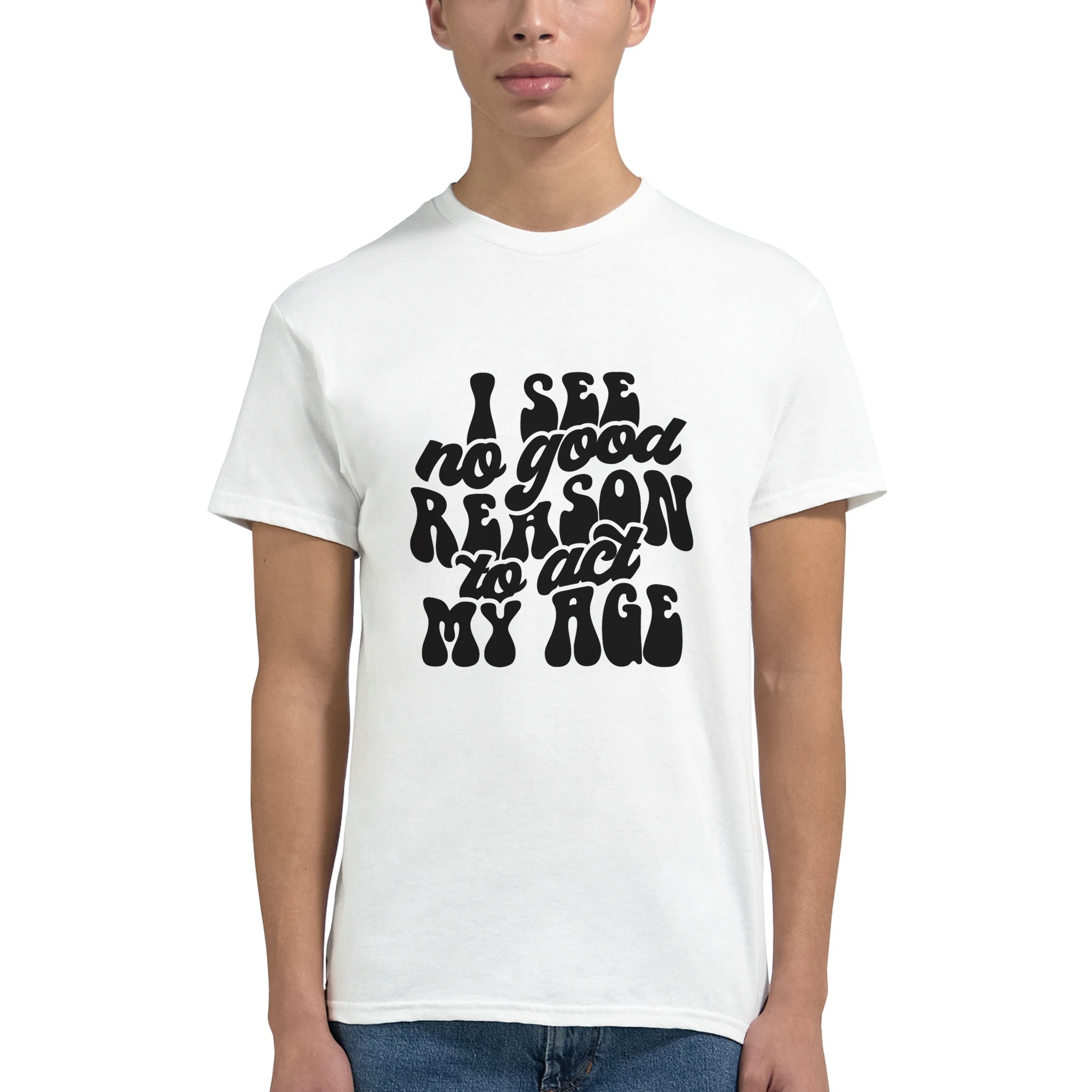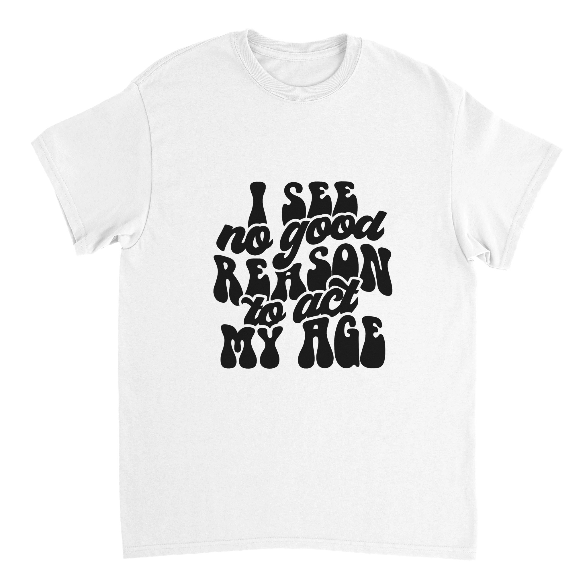 Retro Vibe T-shirt: “I See No Good Reason to Act My Age” – Unisex Bomulls-T-shirt med Uttrycksfullt Tryck