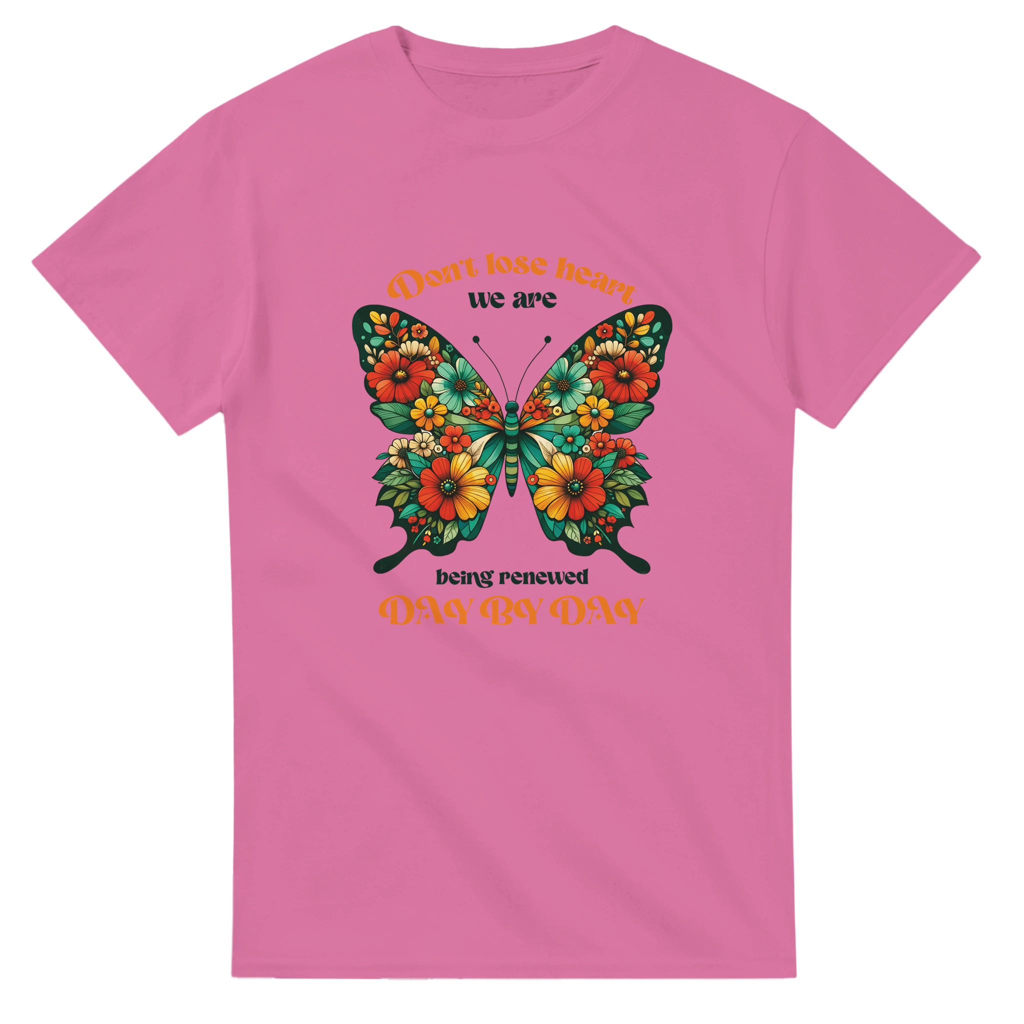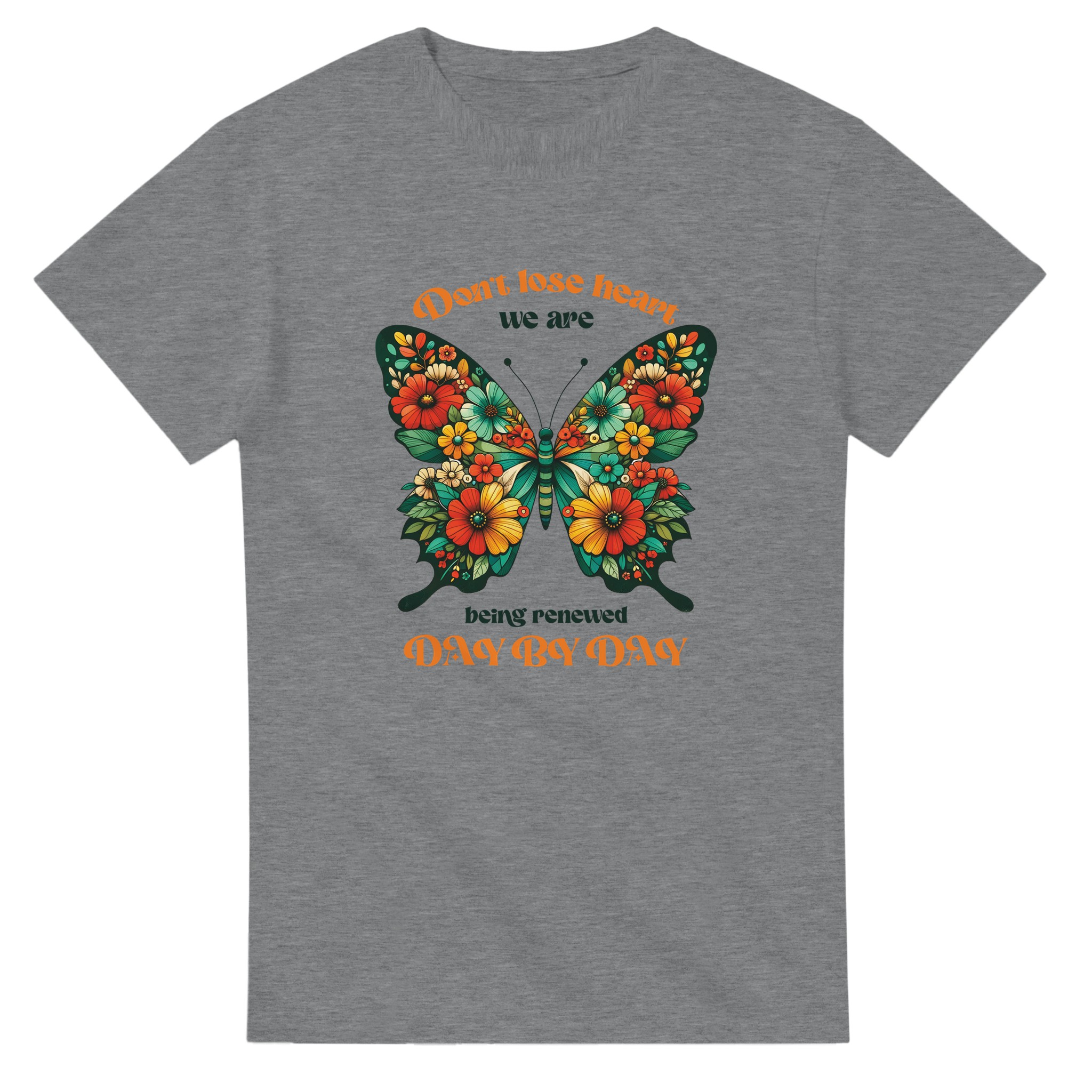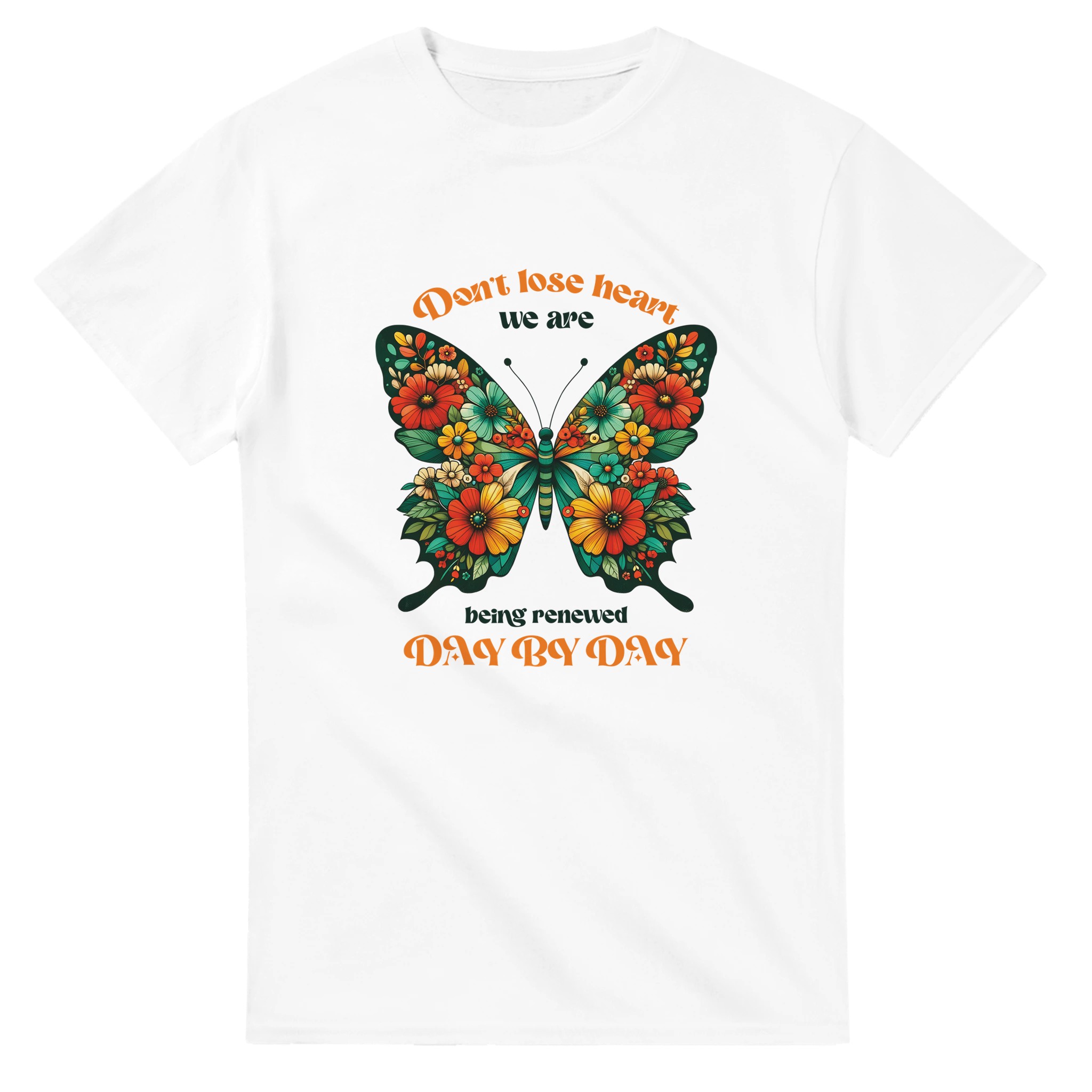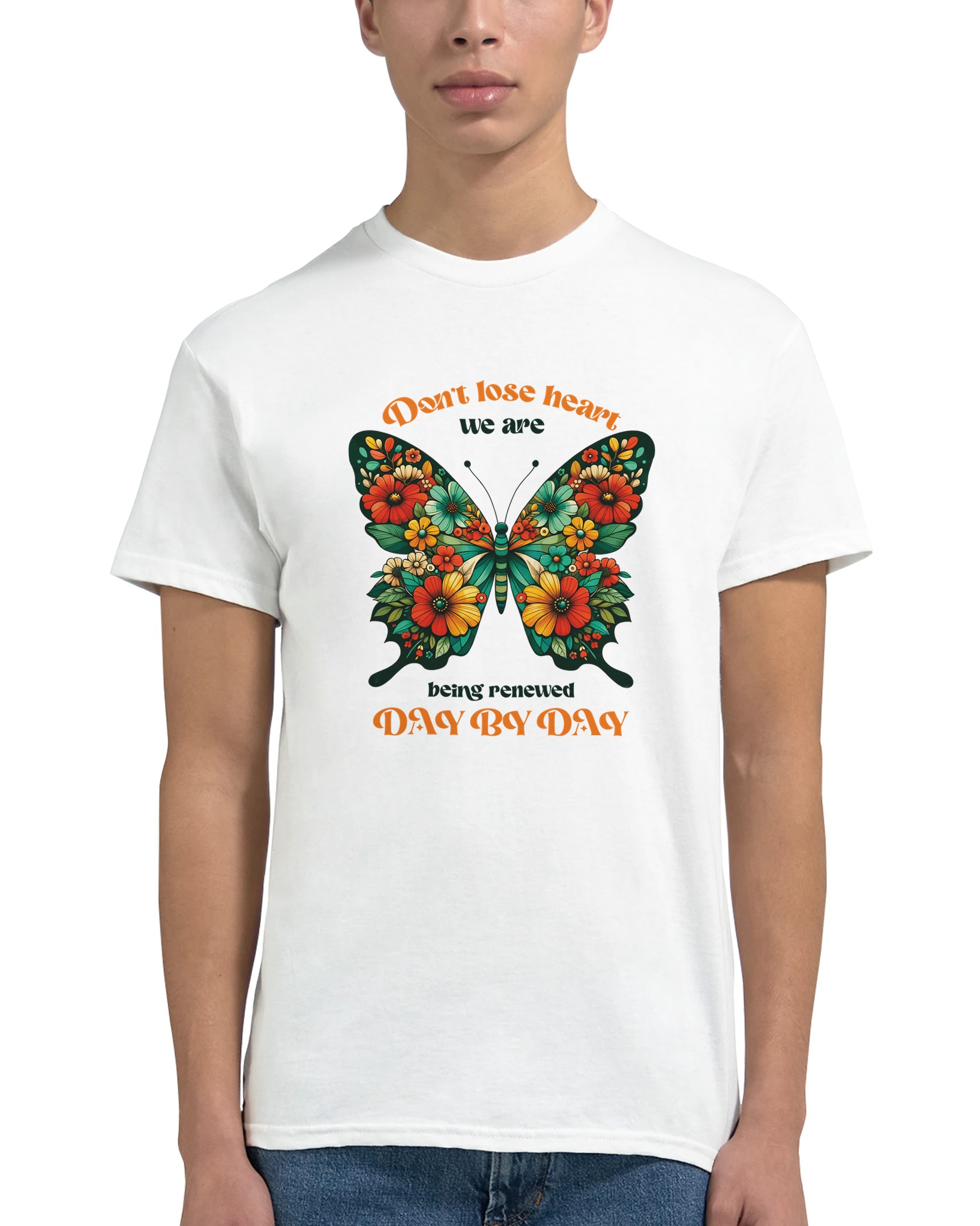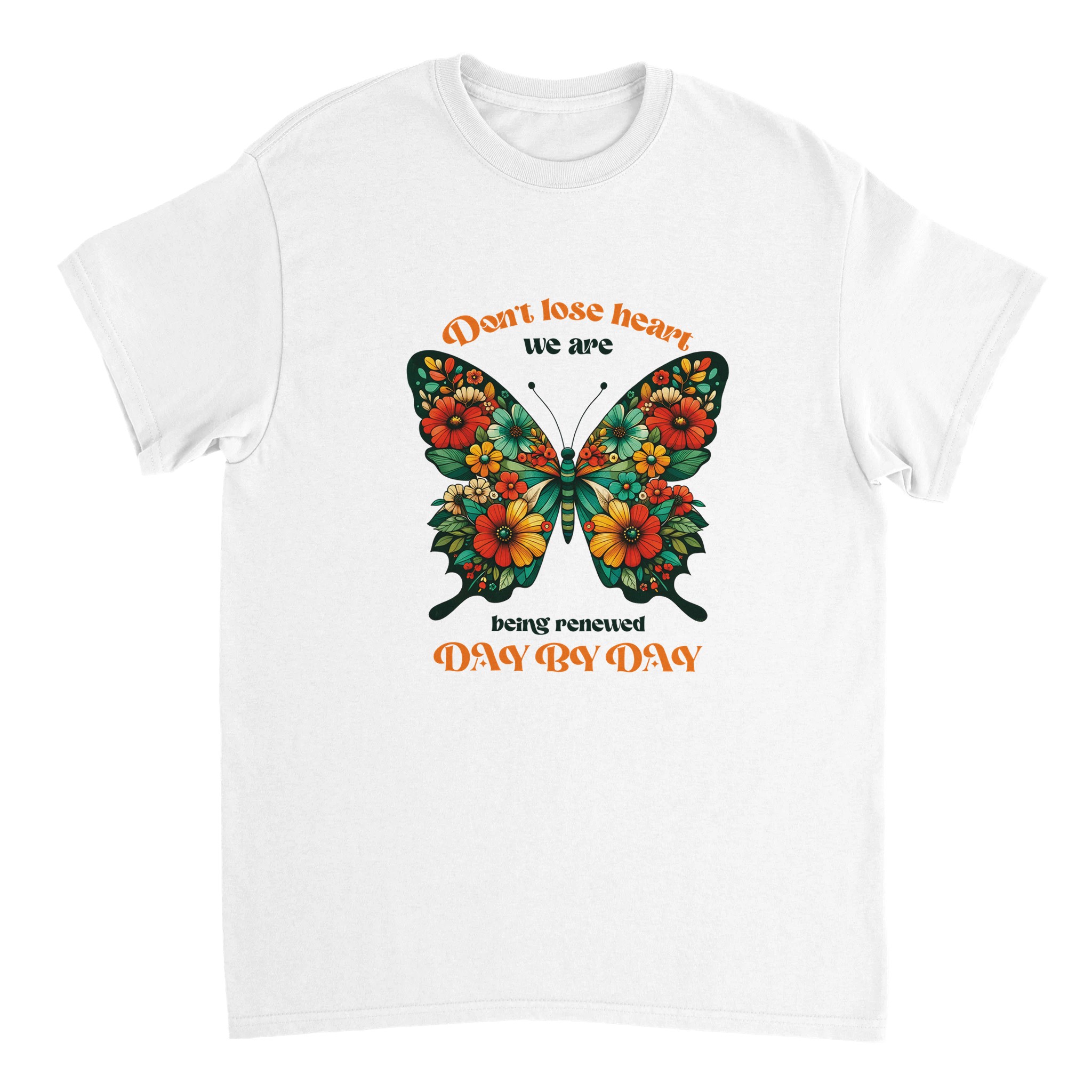 Fjäril ‘Don’t Lose Heart’ T-shirt – Vibrerande Blommig Design, Unisex Passform för Daglig Inspiration