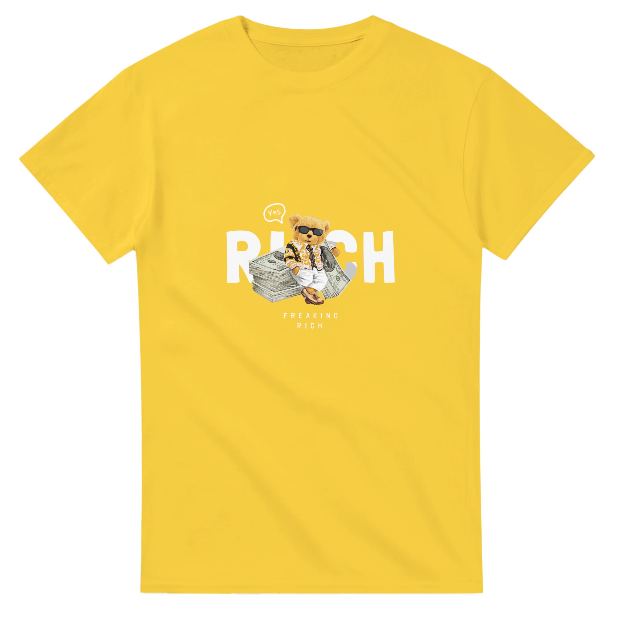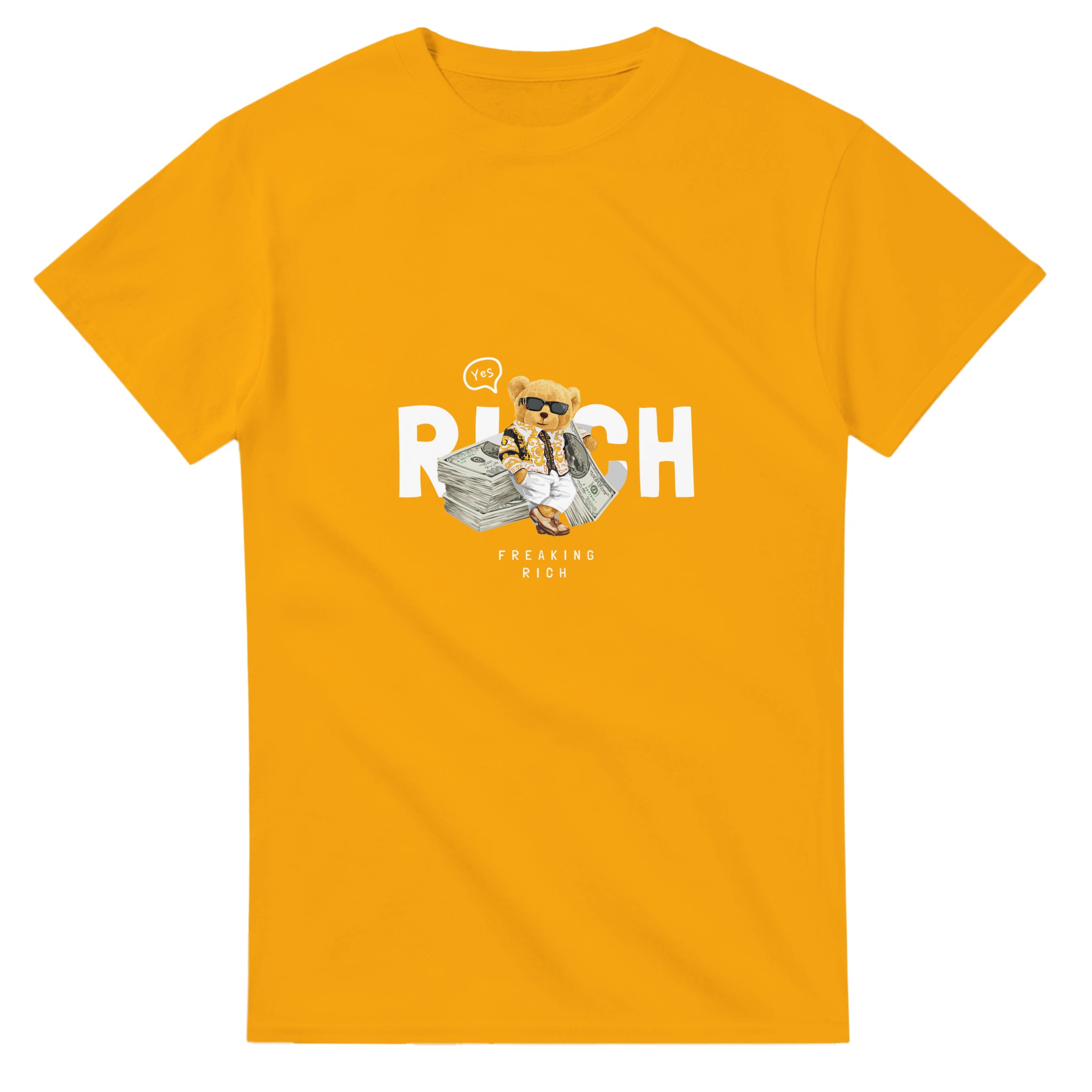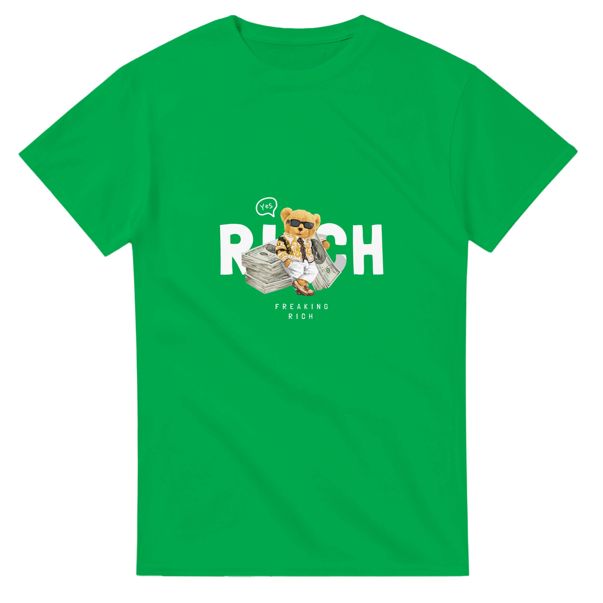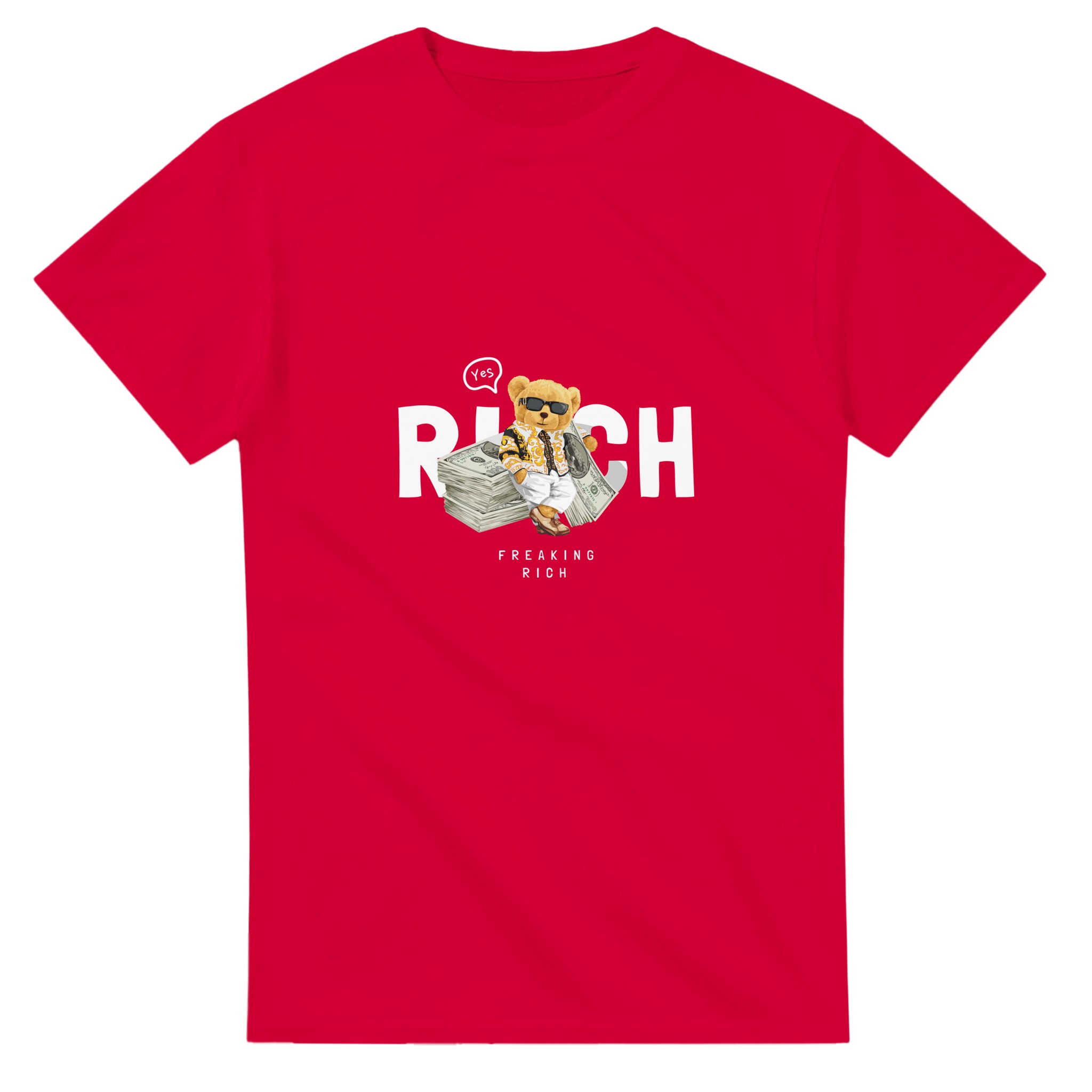 Lyxig “Freaking Rich” Teddybjörn T-shirt – Klassisk Bomull, Unisex Design för Stilmedvetna