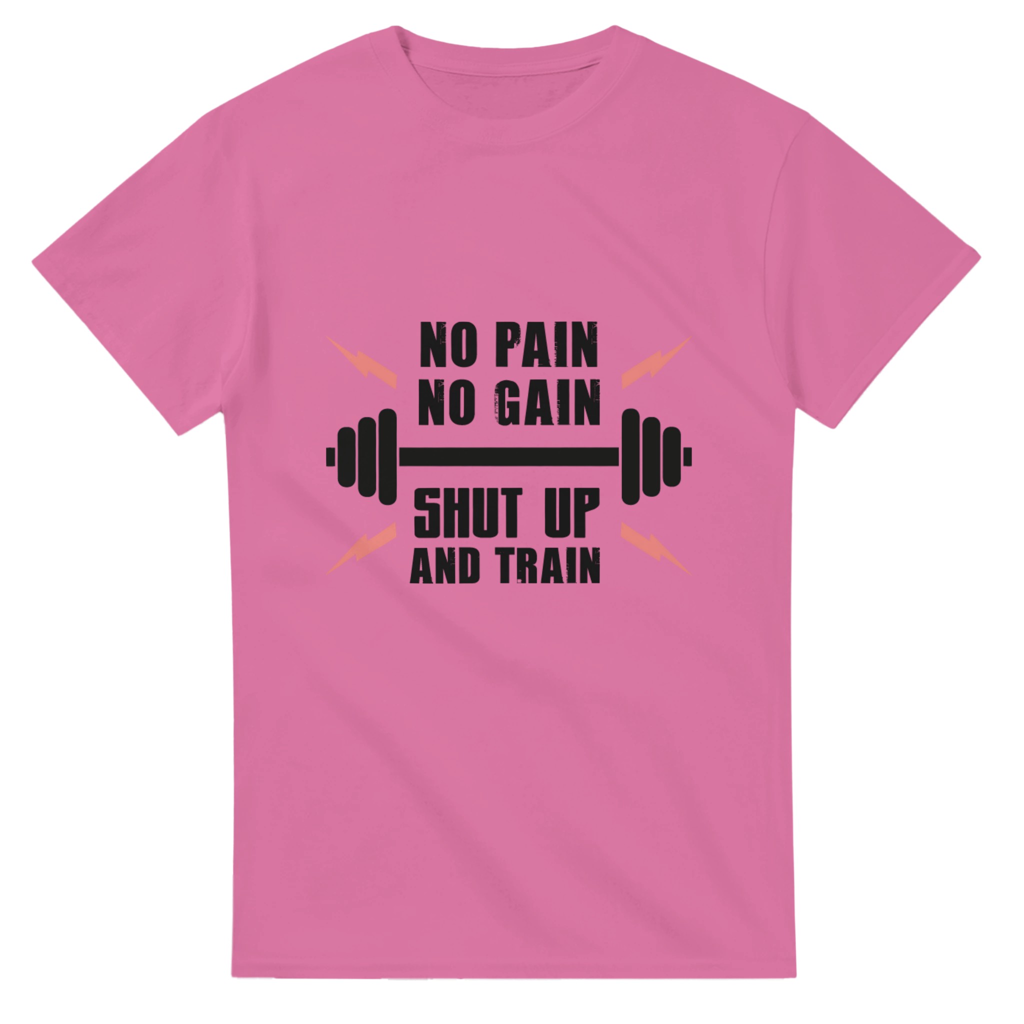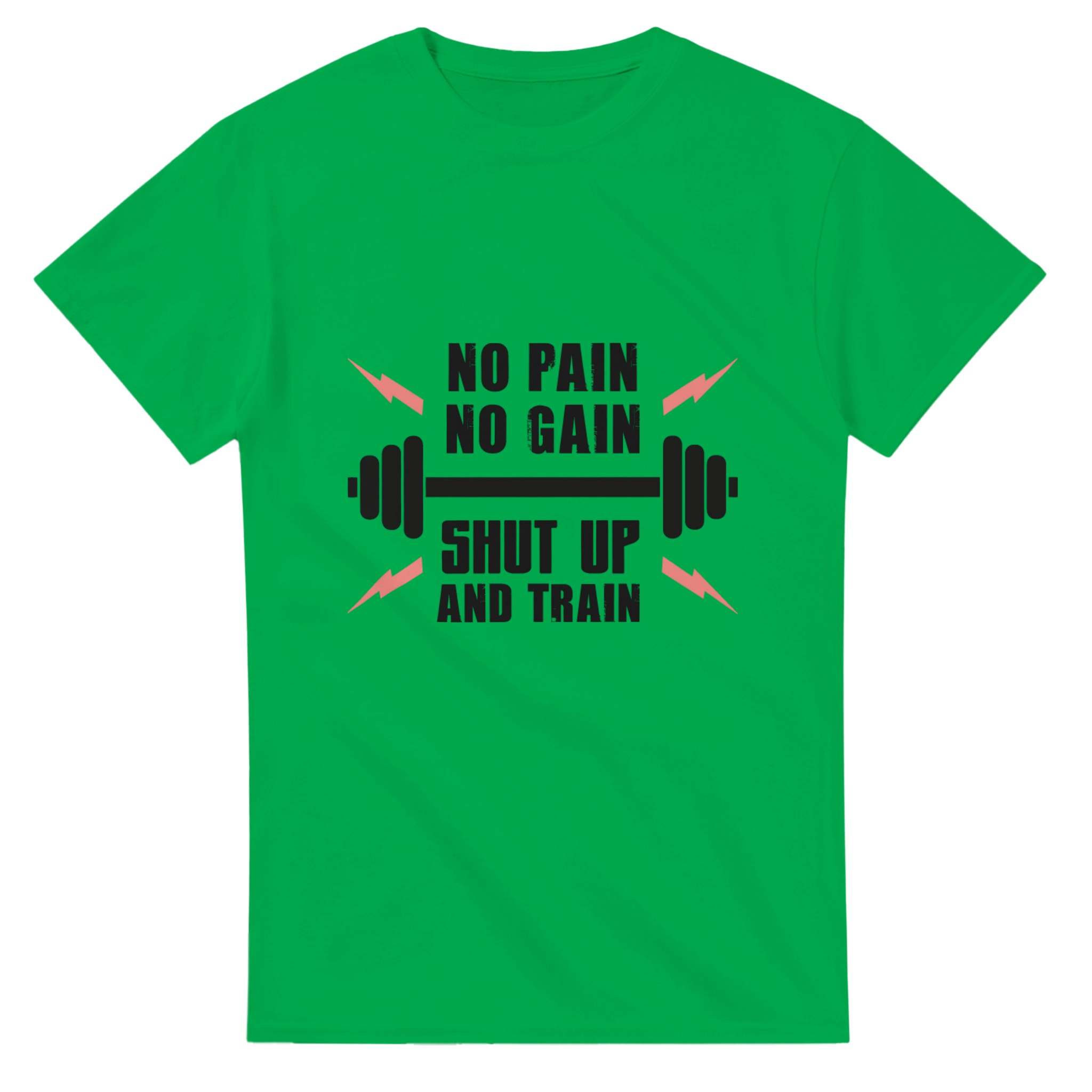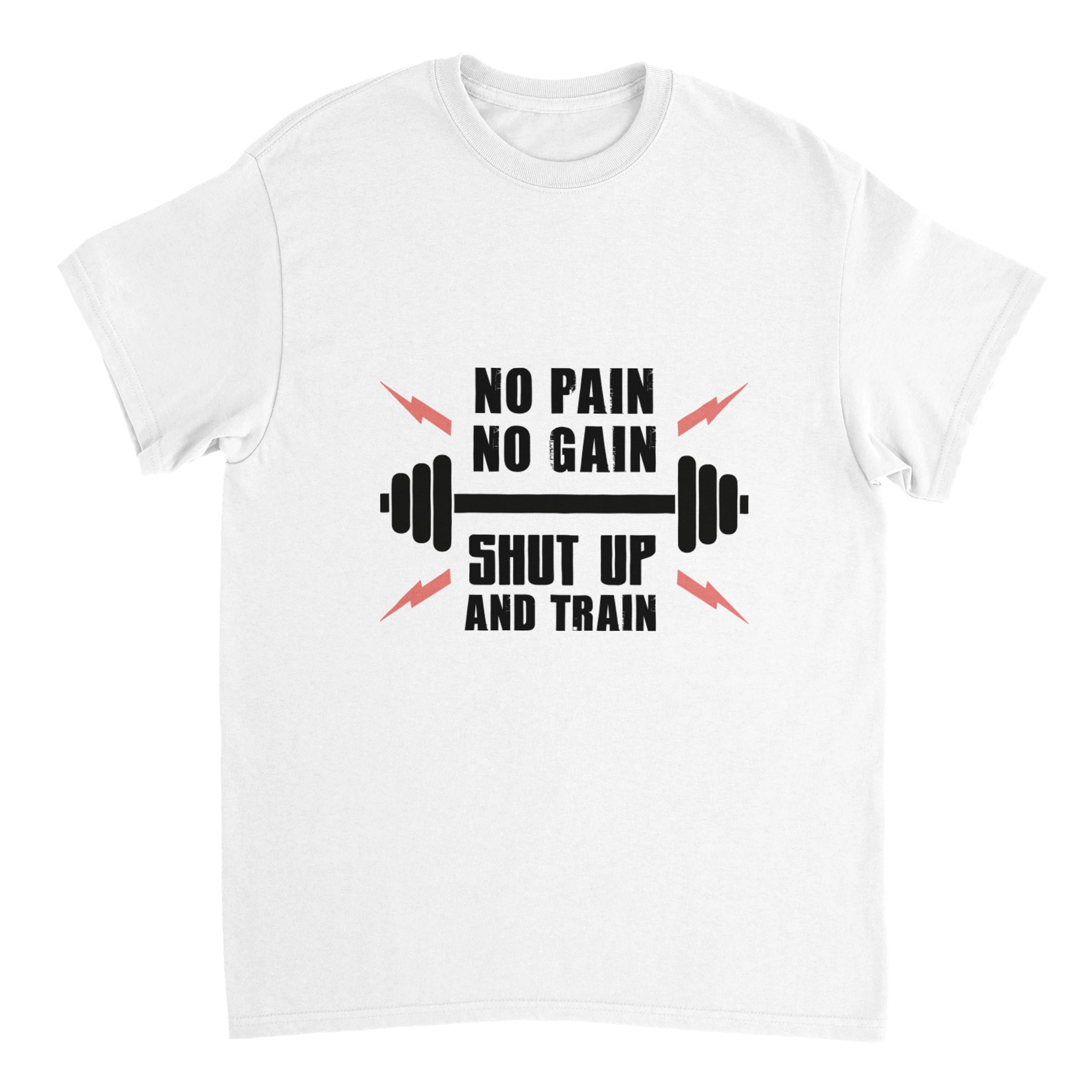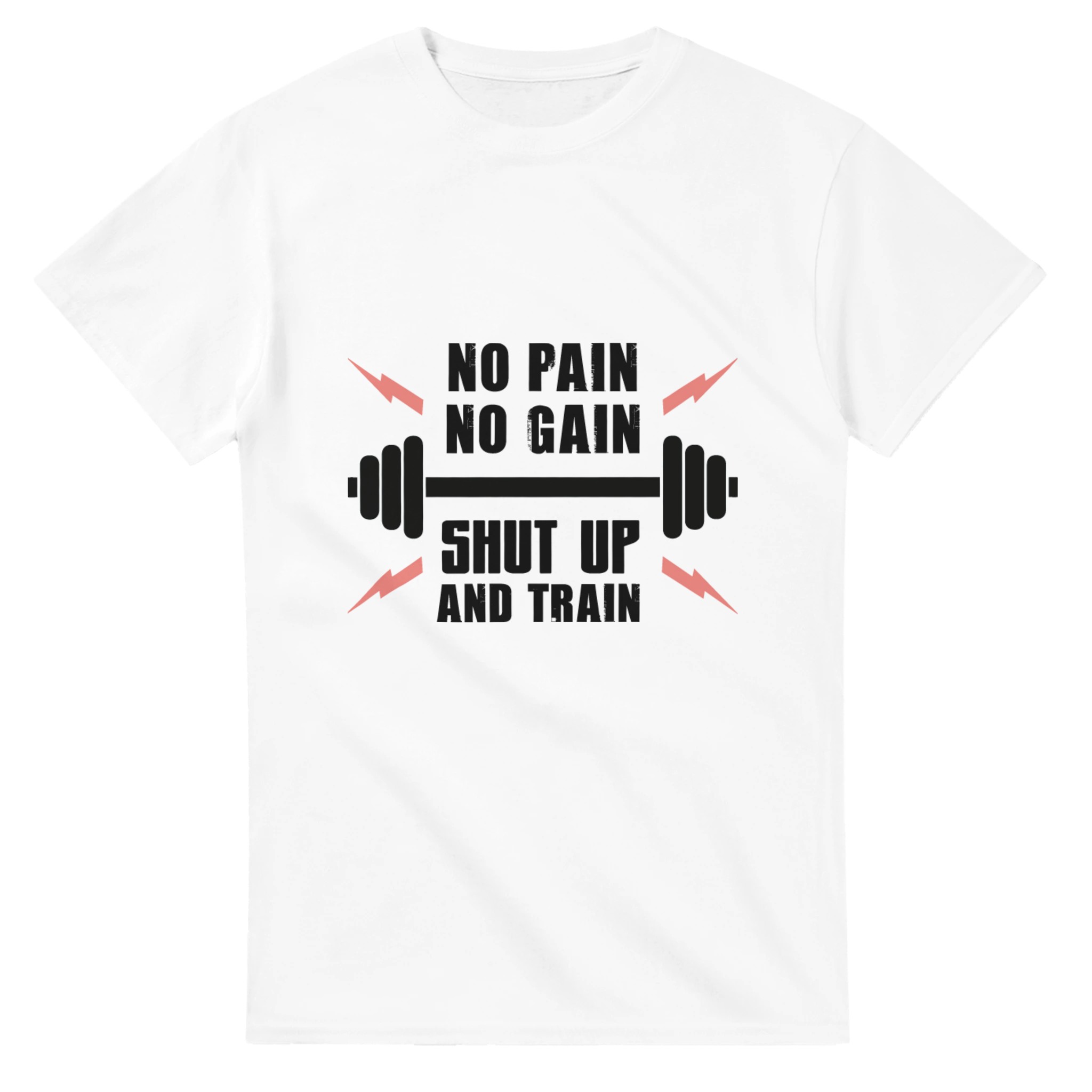 Tränings T-shirt – ‘No Pain No Gain’ med Hantel & Blixtar, Tålig Unisex Design för Gymmet & Vardags
