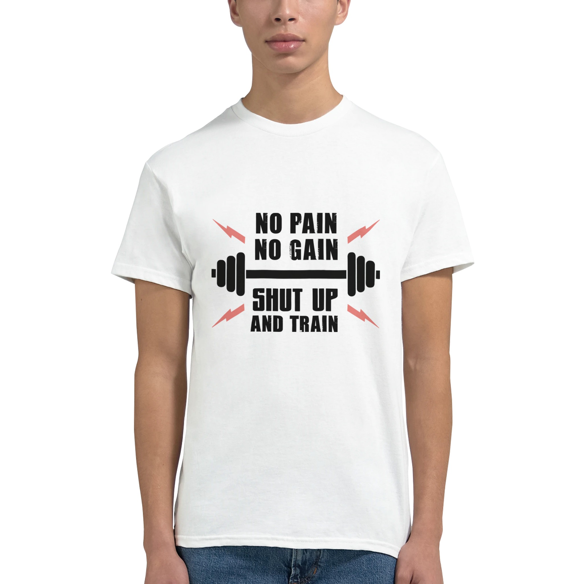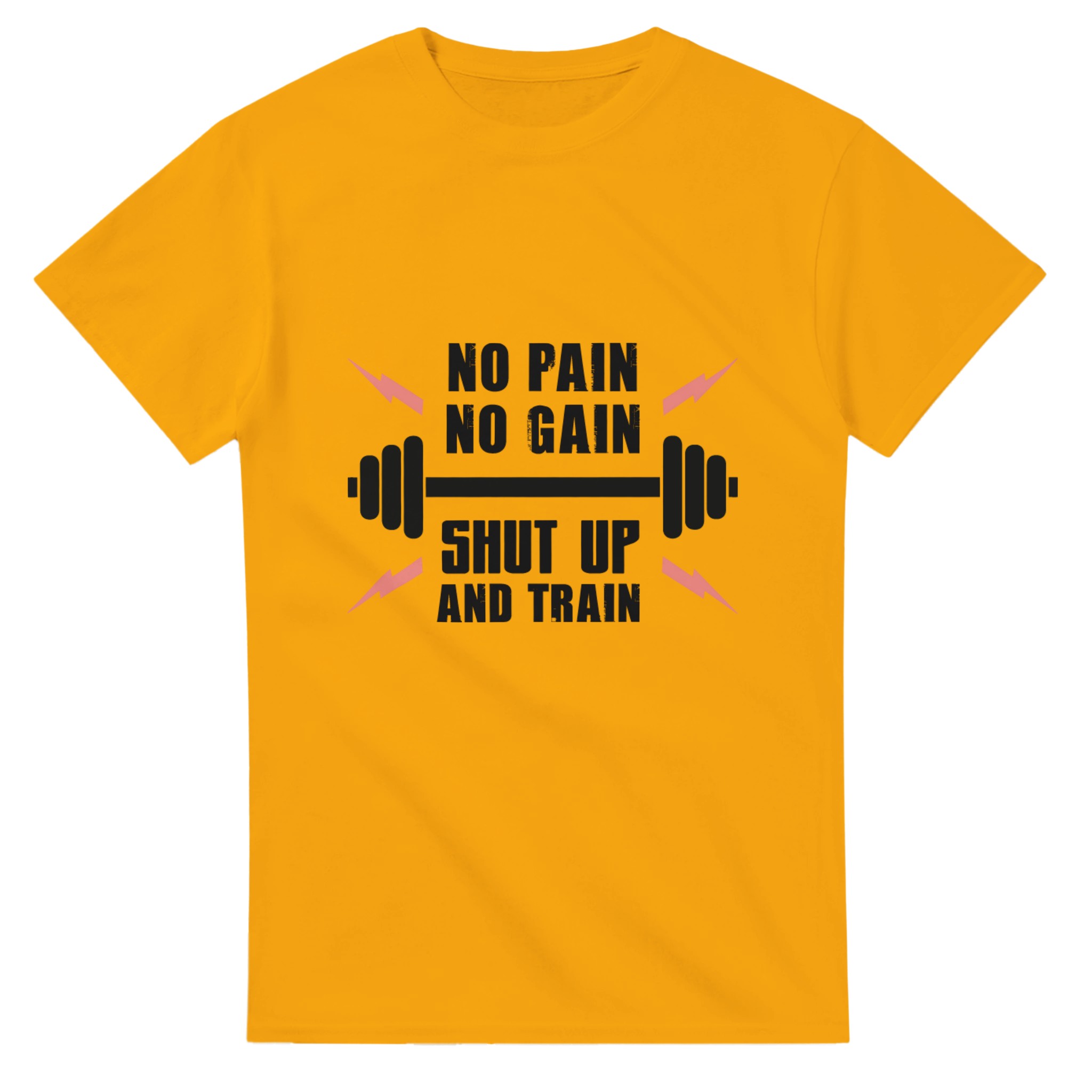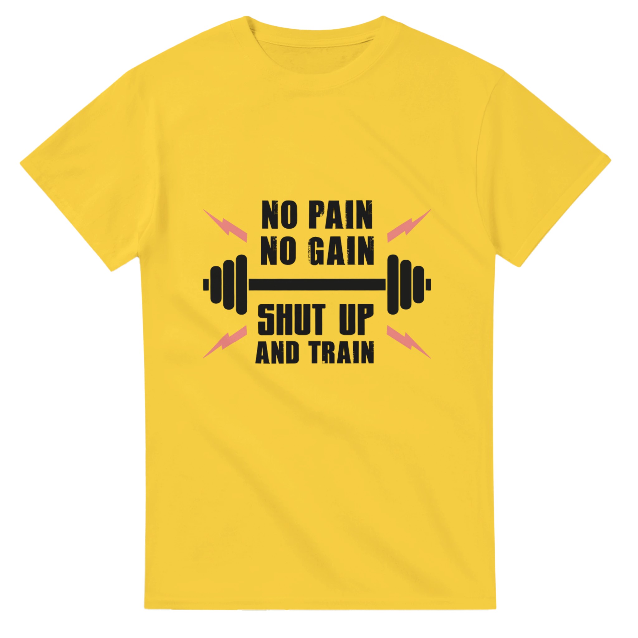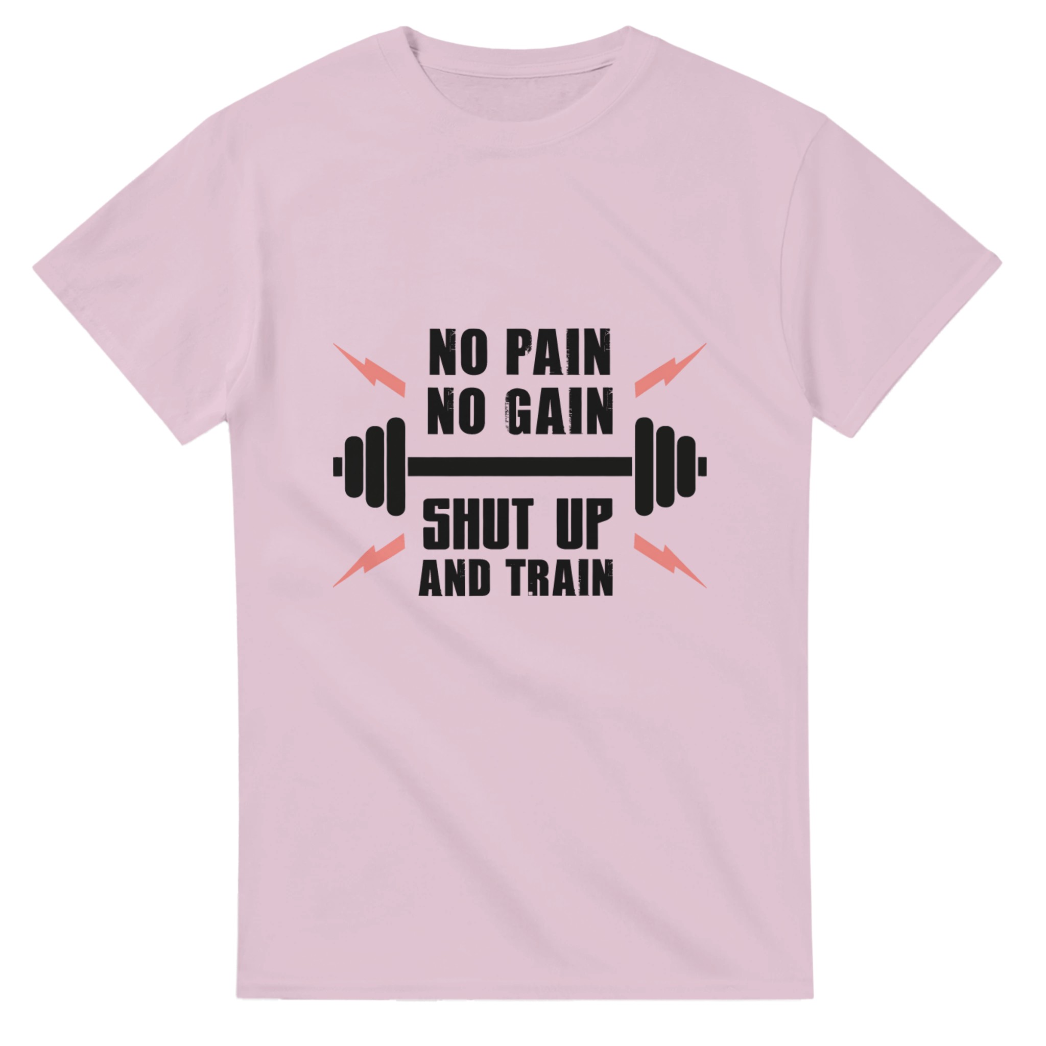 Tränings T-shirt – ‘No Pain No Gain’ med Hantel & Blixtar, Tålig Unisex Design för Gymmet & Vardags