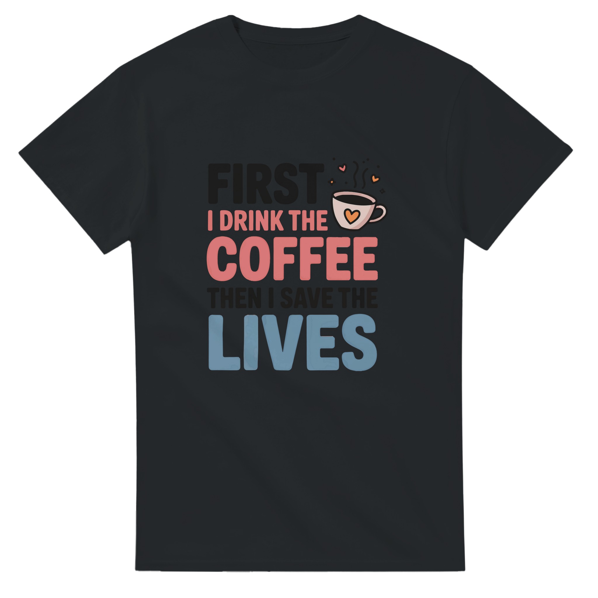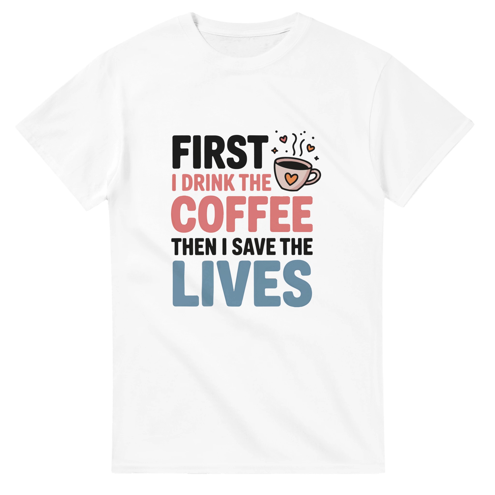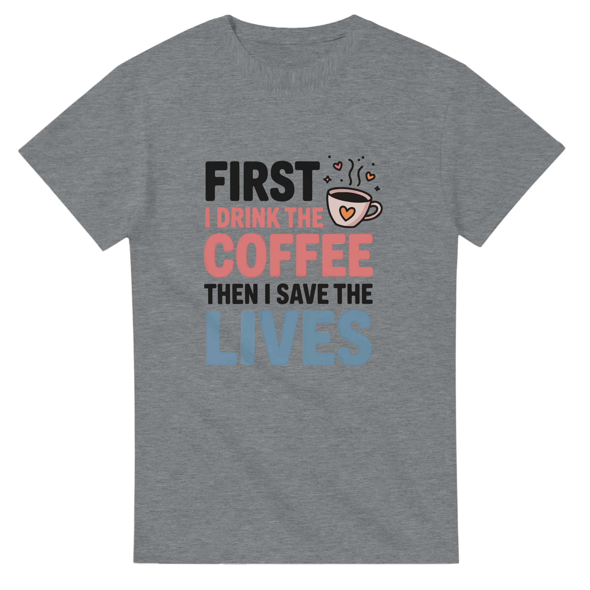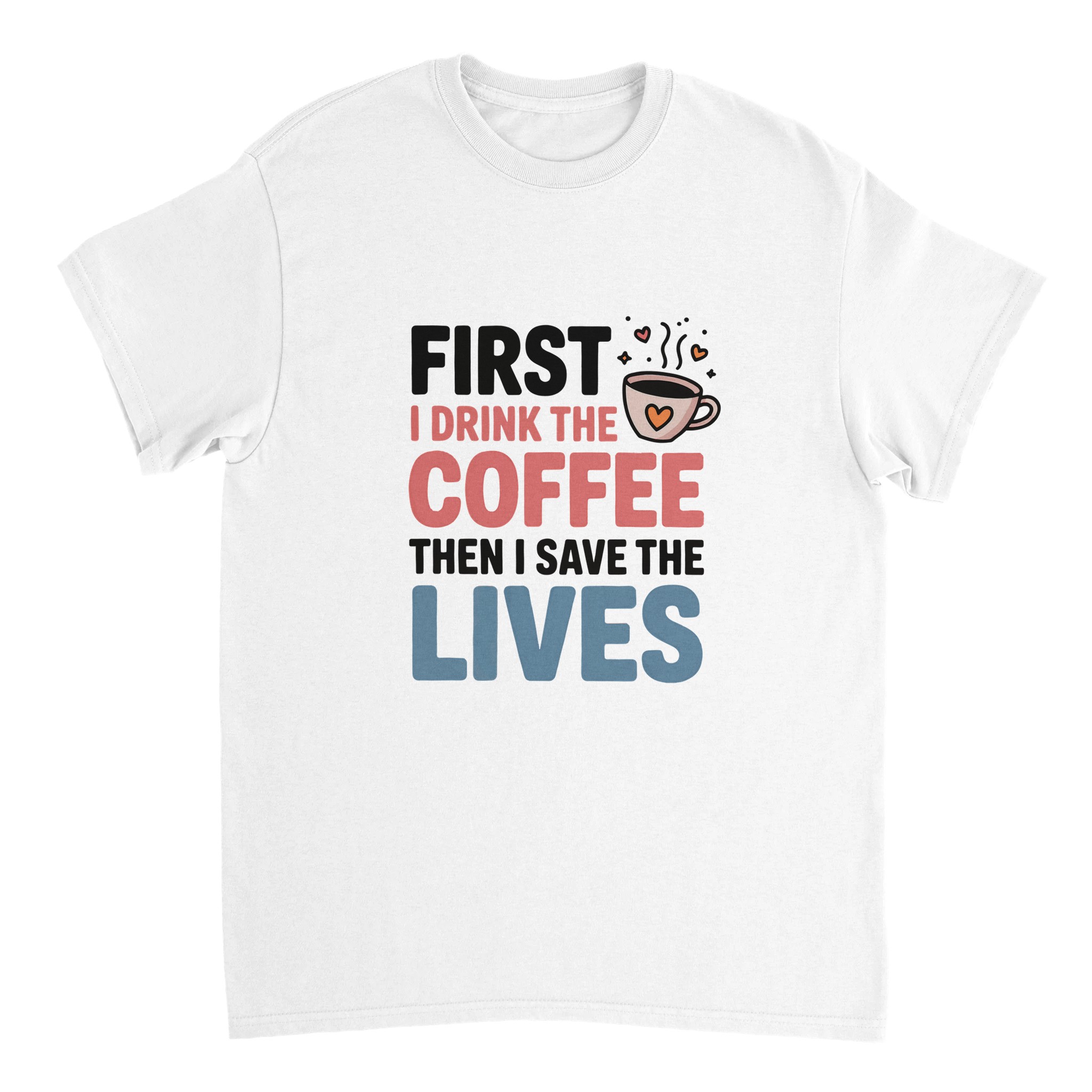 Klassisk Bomulls-T-shirt: “First I Drink the Coffee Then I Save the Lives” – Kärlek till kaffe & hjältar