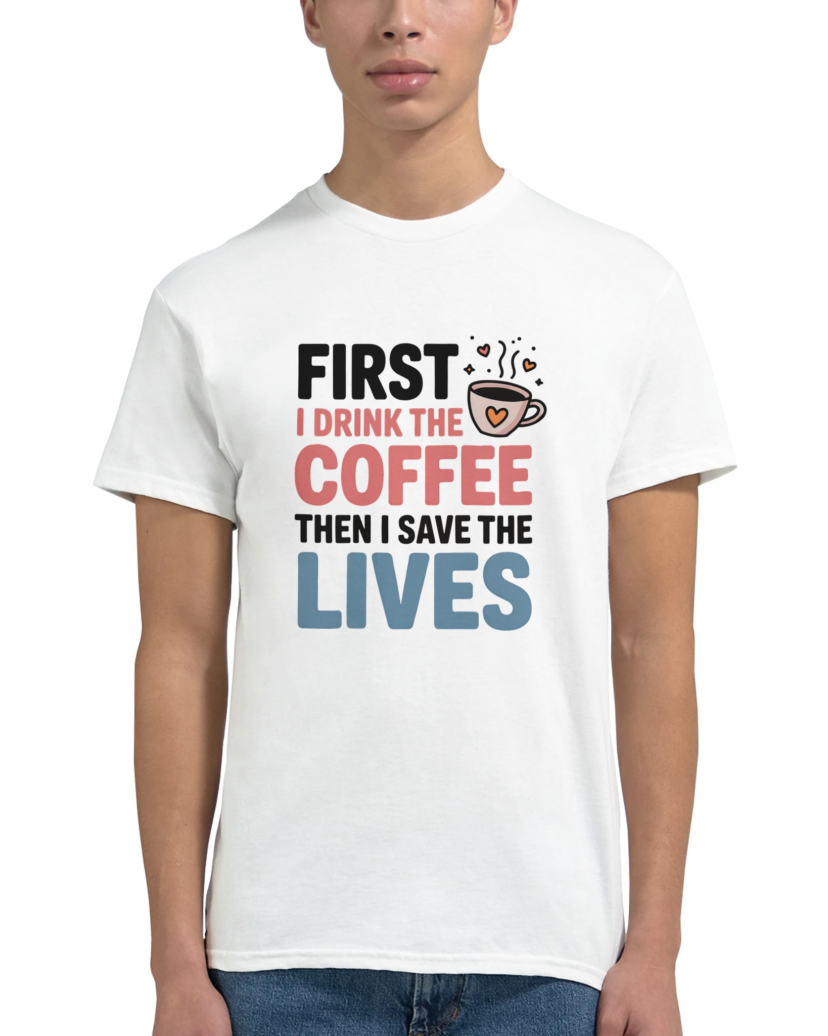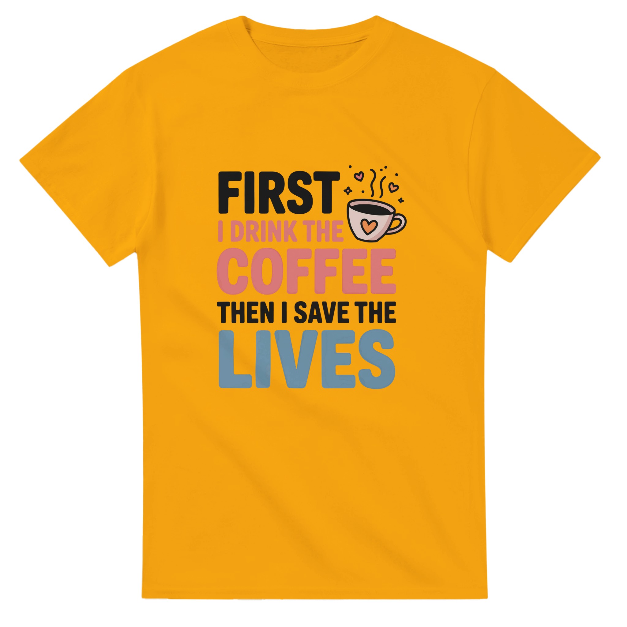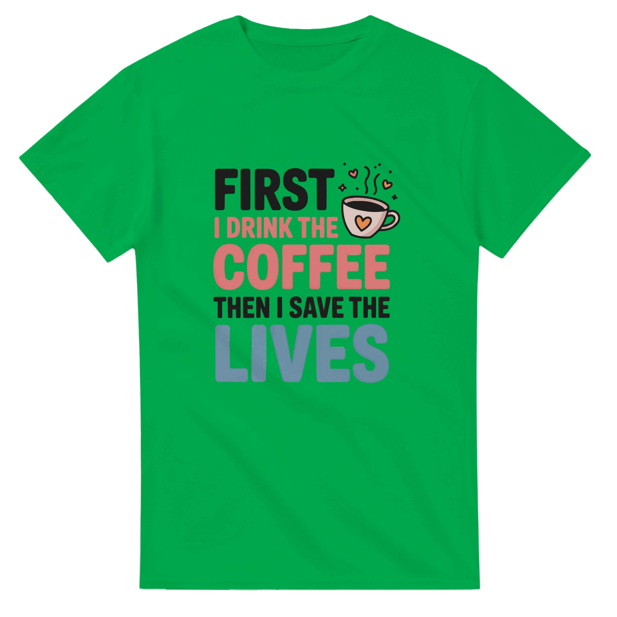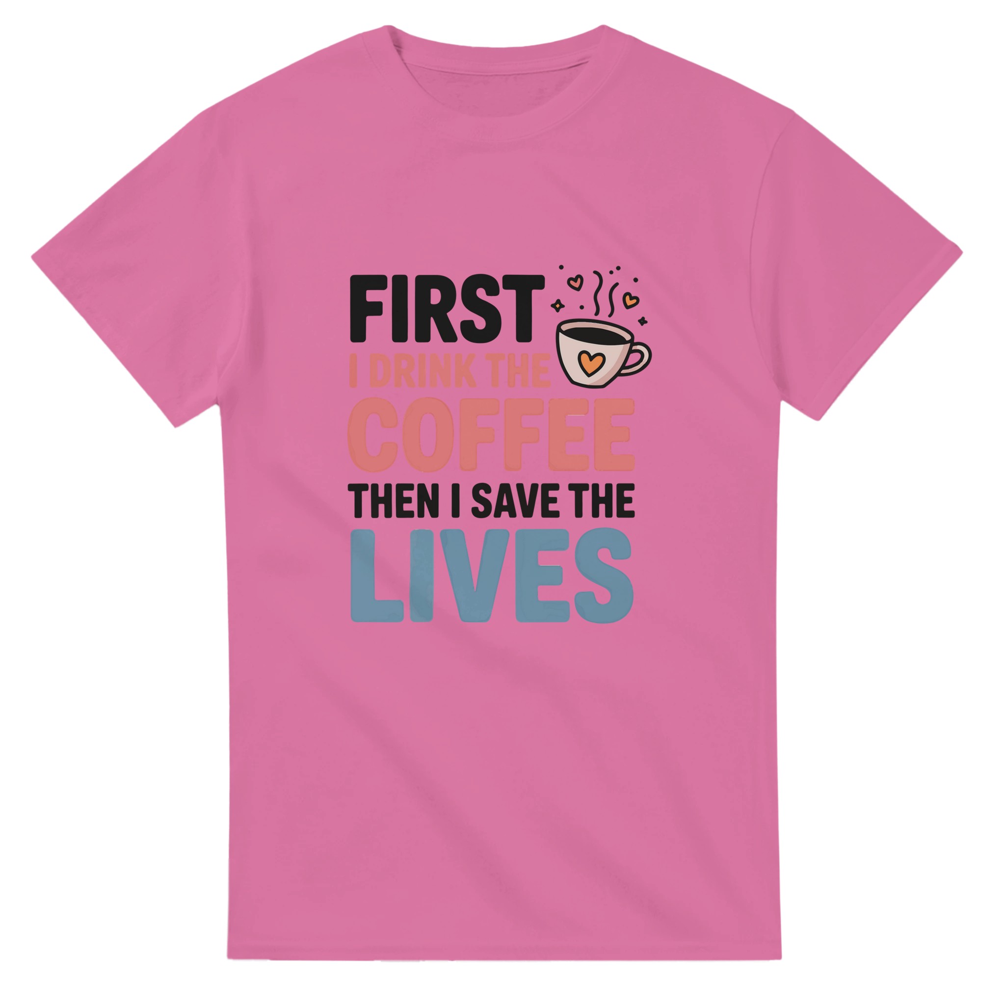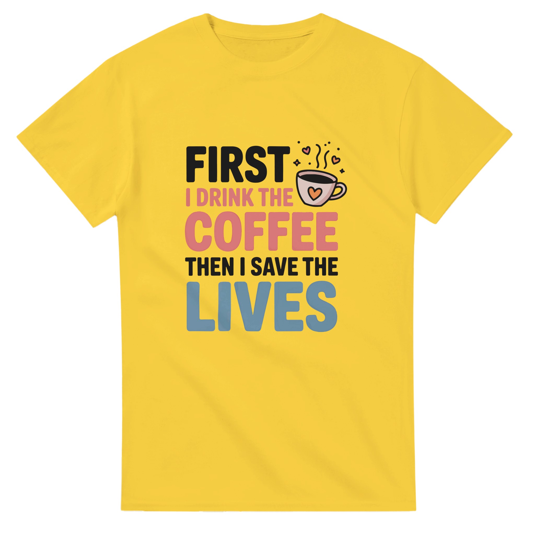 Klassisk Bomulls-T-shirt: “First I Drink the Coffee Then I Save the Lives” – Kärlek till kaffe & hjältar