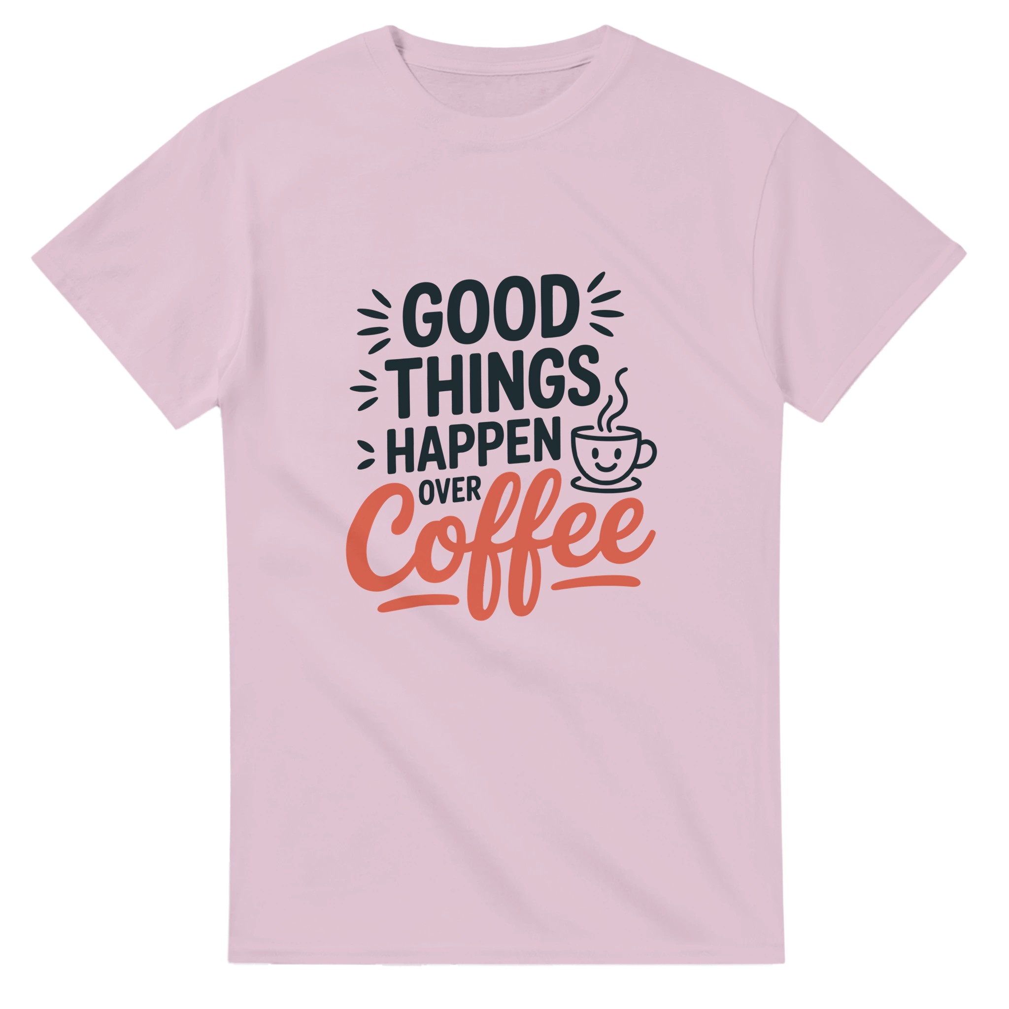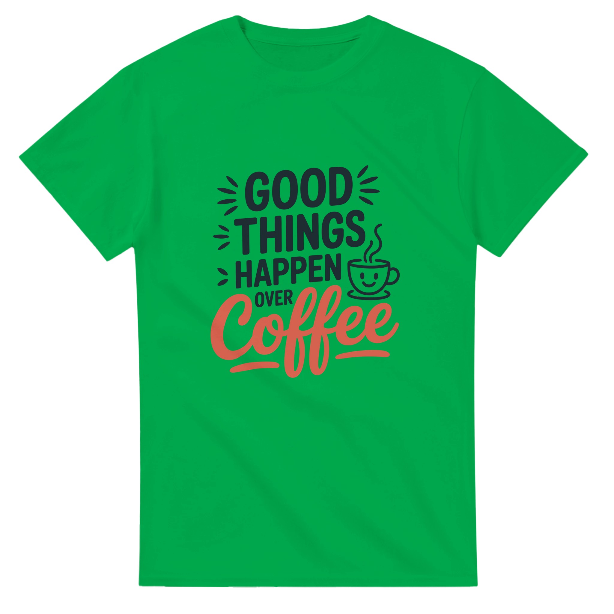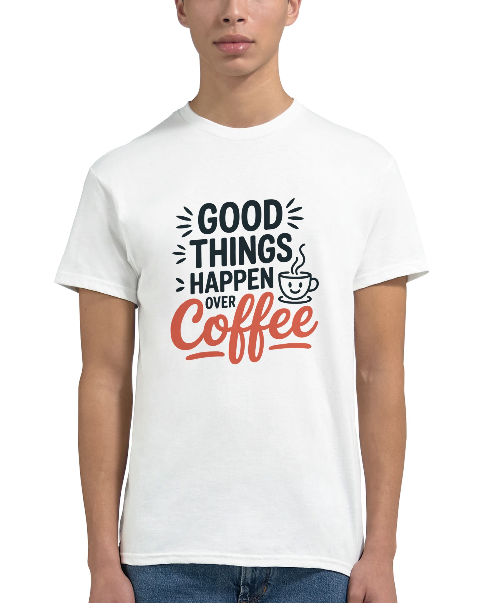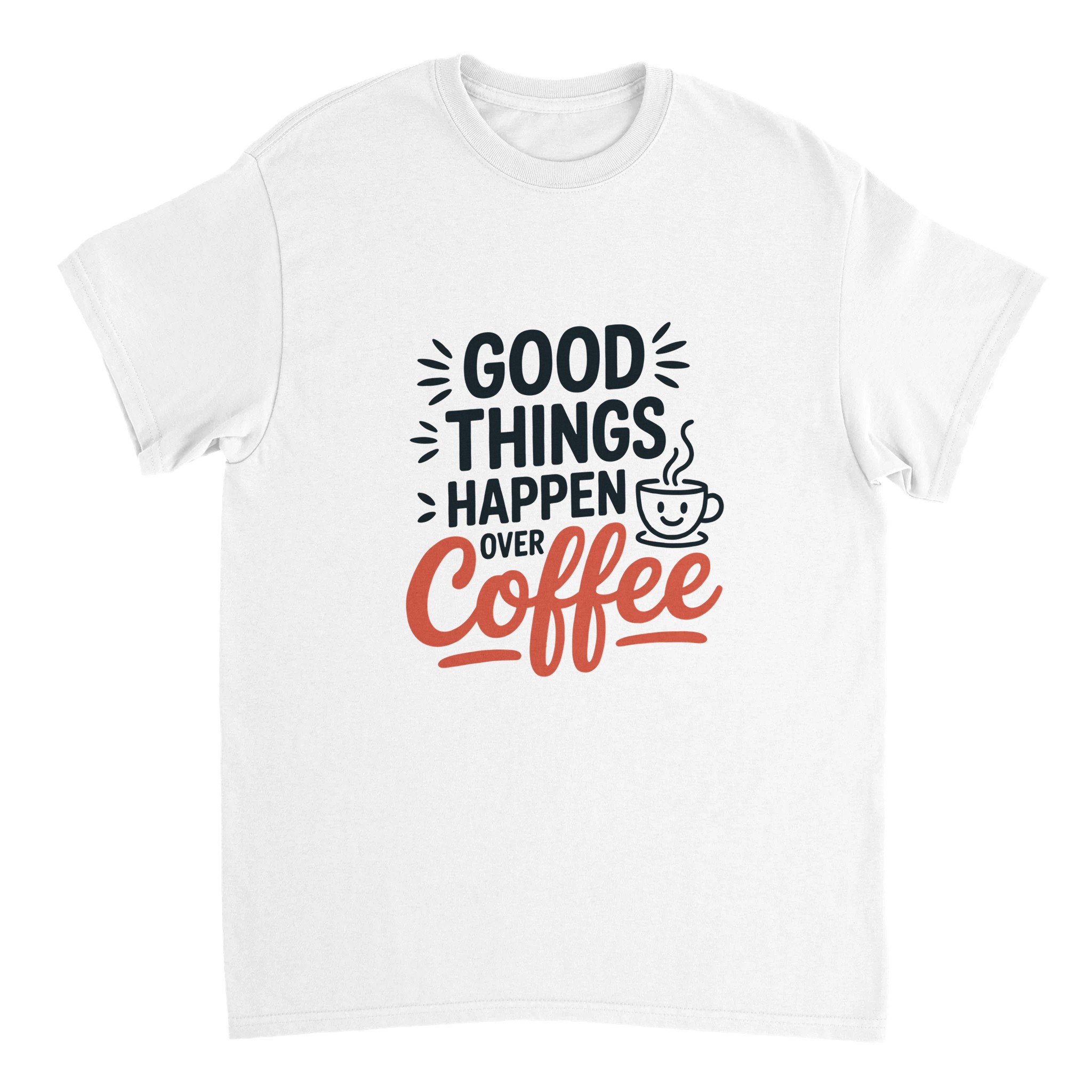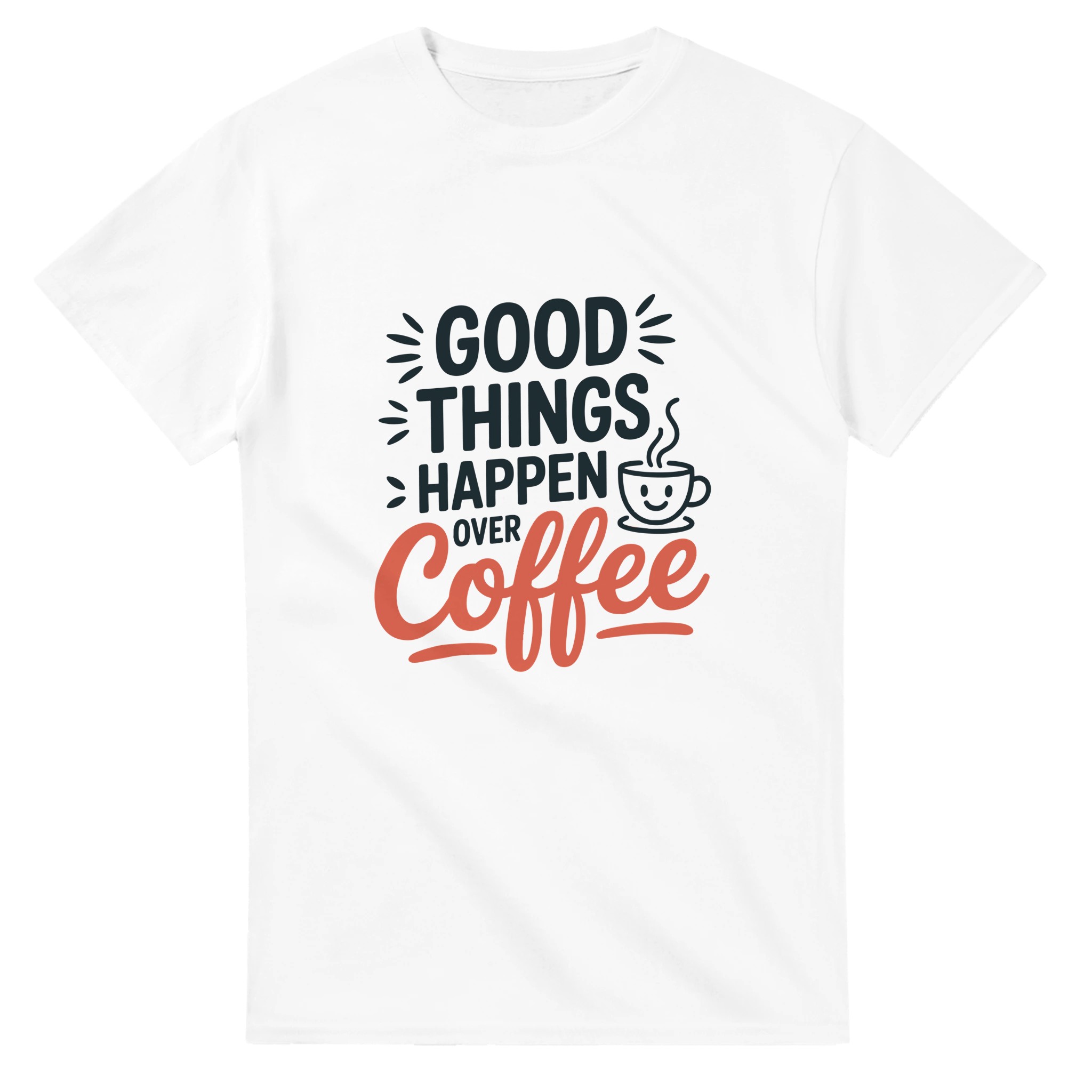 Klassisk Bomulls-T-shirt – ‘Good Things Happen Over Coffee’ Design, Unisex, Slitstark Vardagsstil