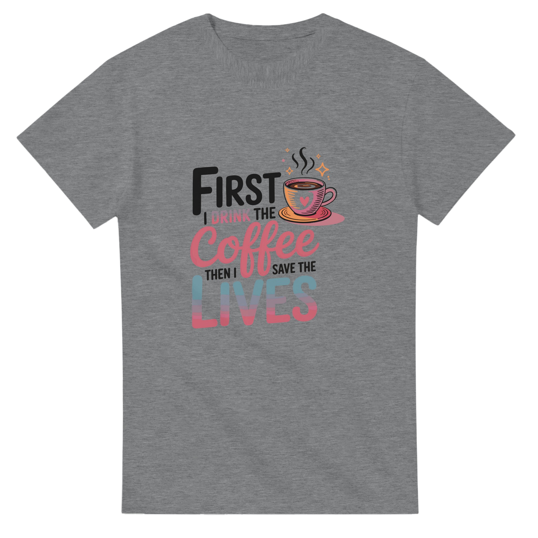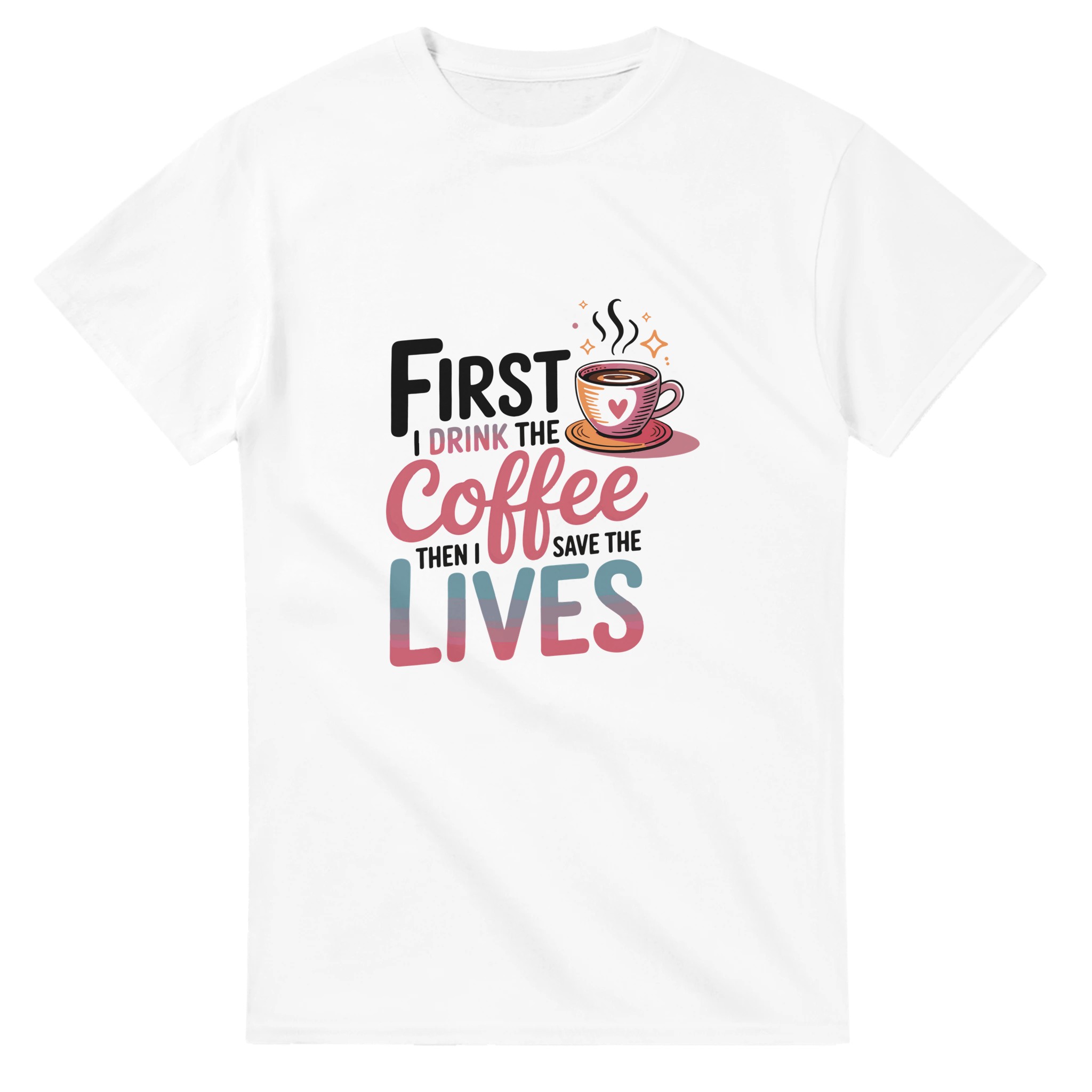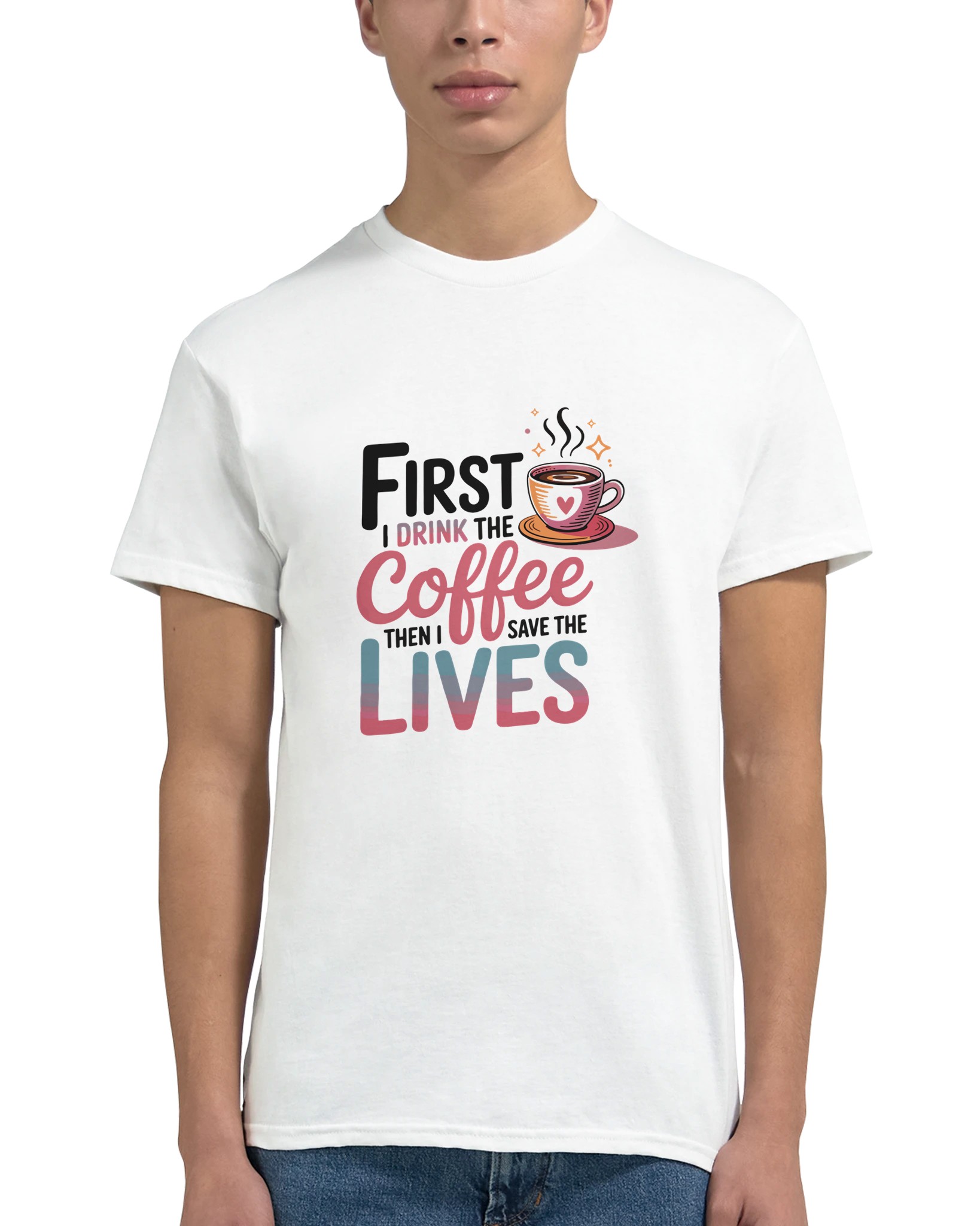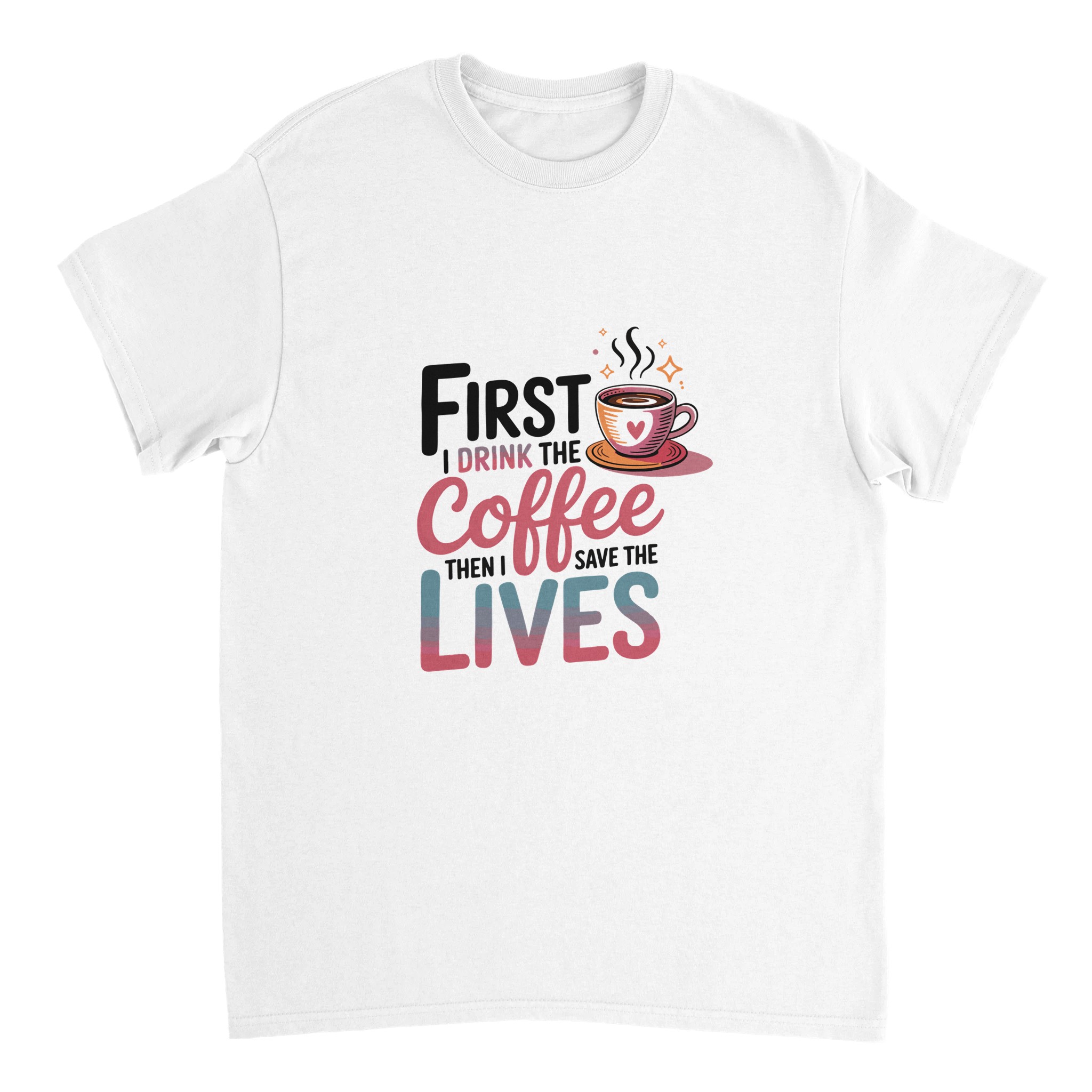 Klassisk Bomulls-T-shirt med ‘Coffee First, Then Lives’ Tryck – Tålig & Unisex Design för Vardags Hjältar