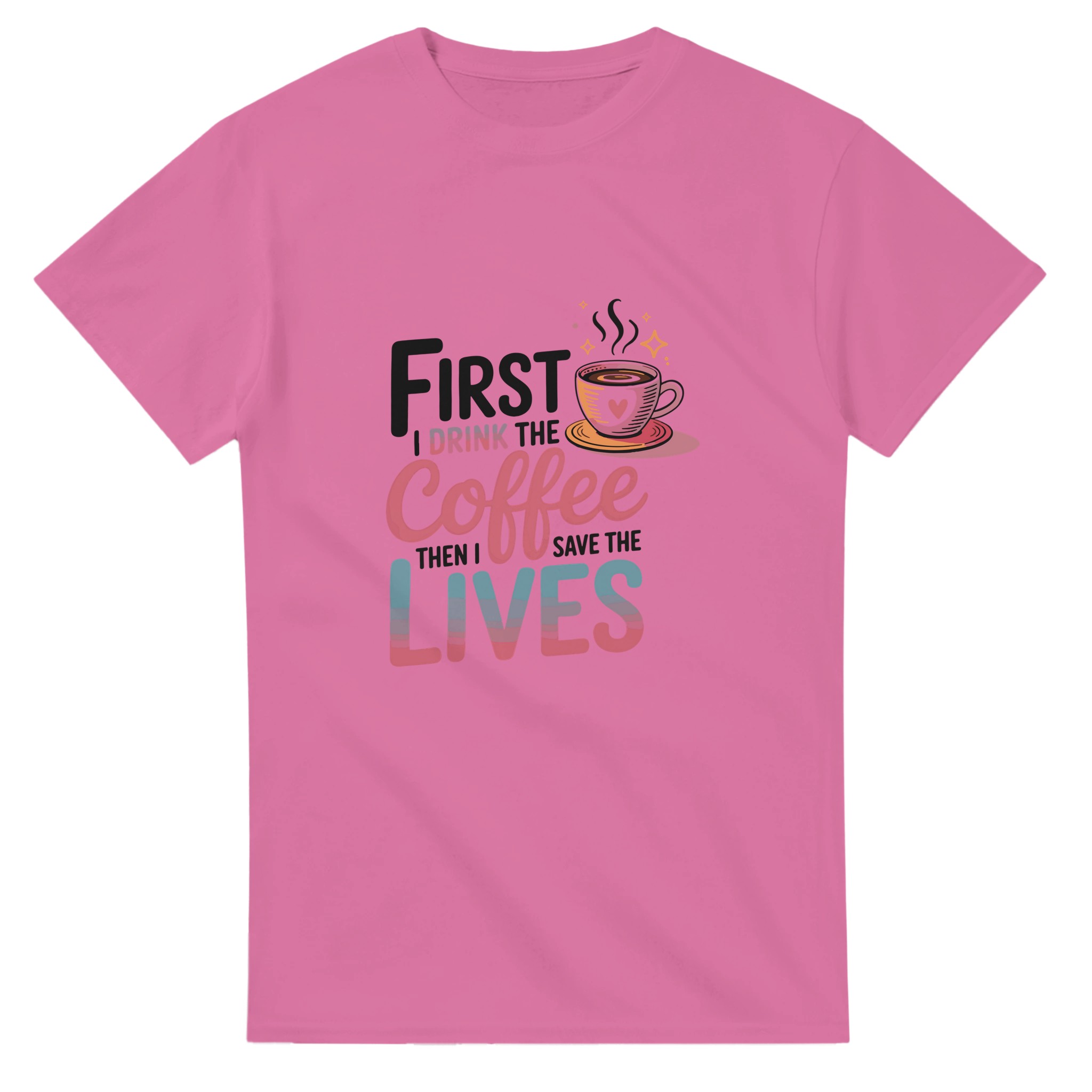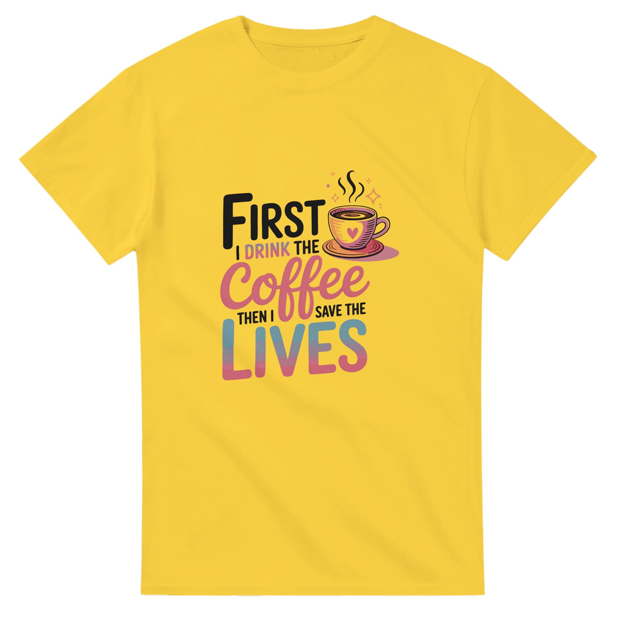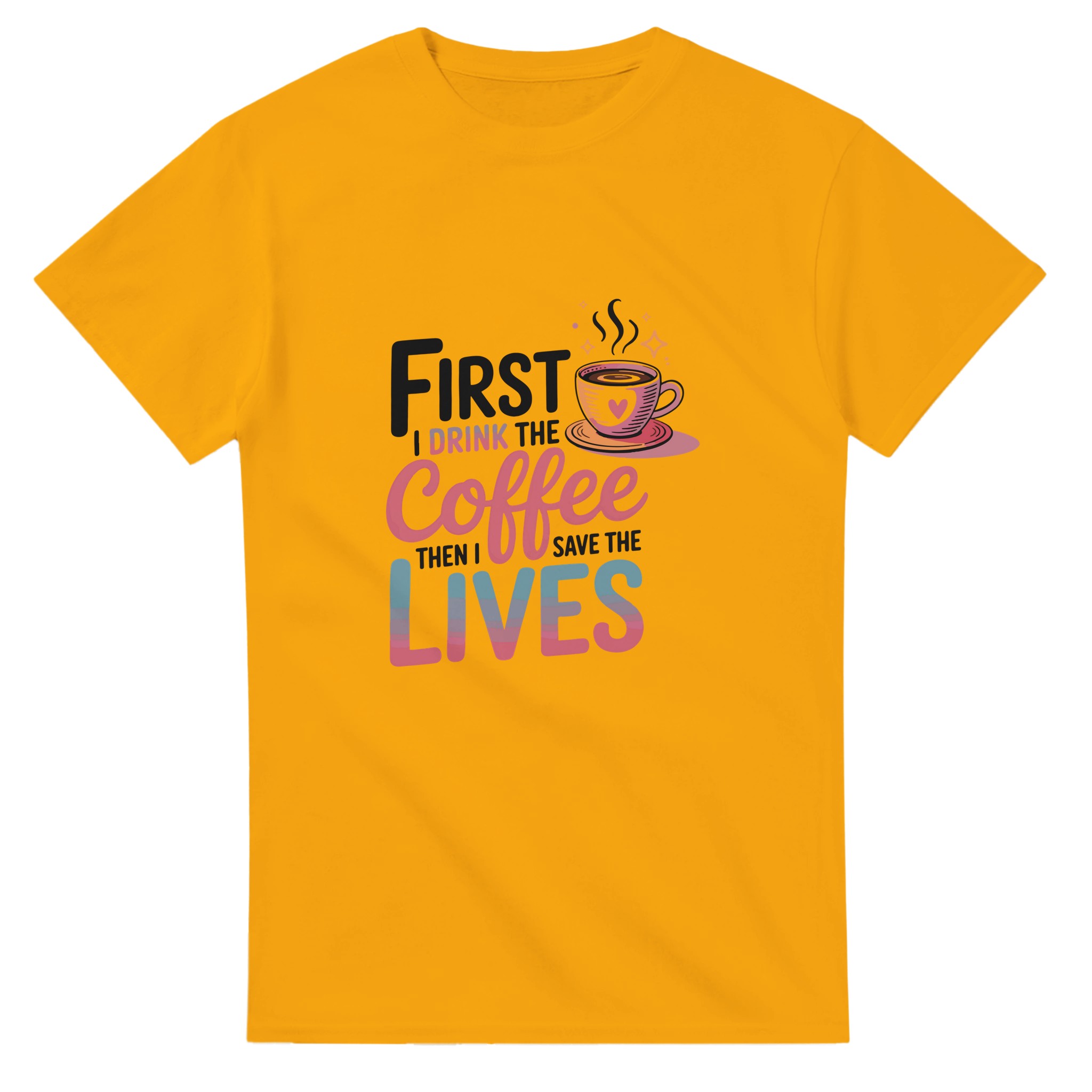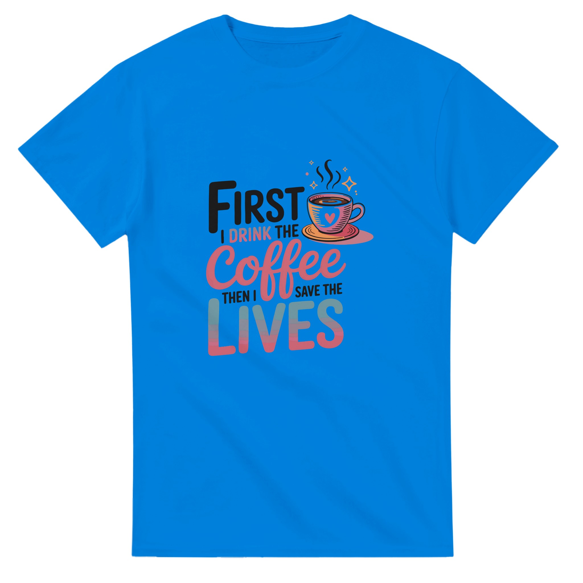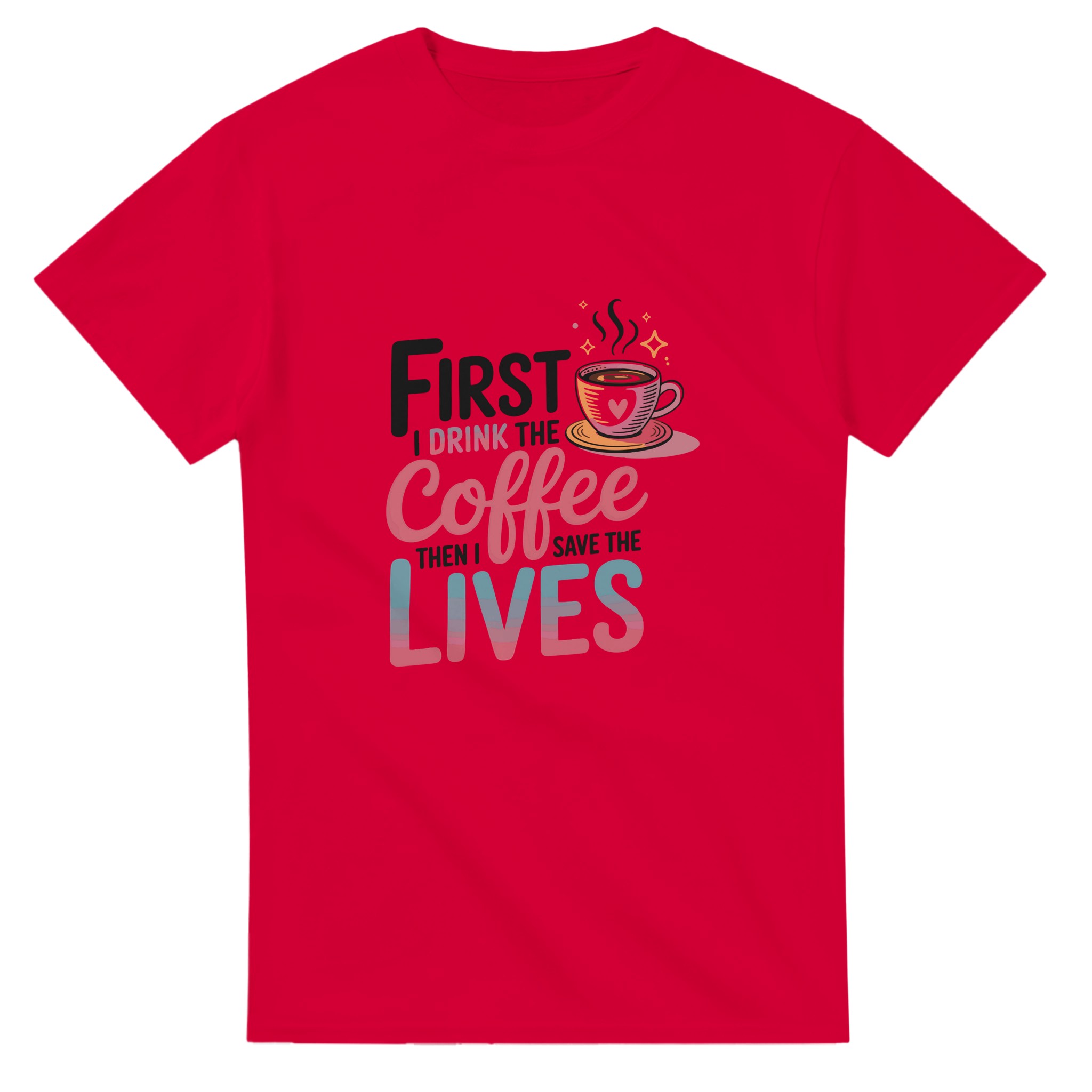 Klassisk Bomulls-T-shirt med ‘Coffee First, Then Lives’ Tryck – Tålig & Unisex Design för Vardags Hjältar
