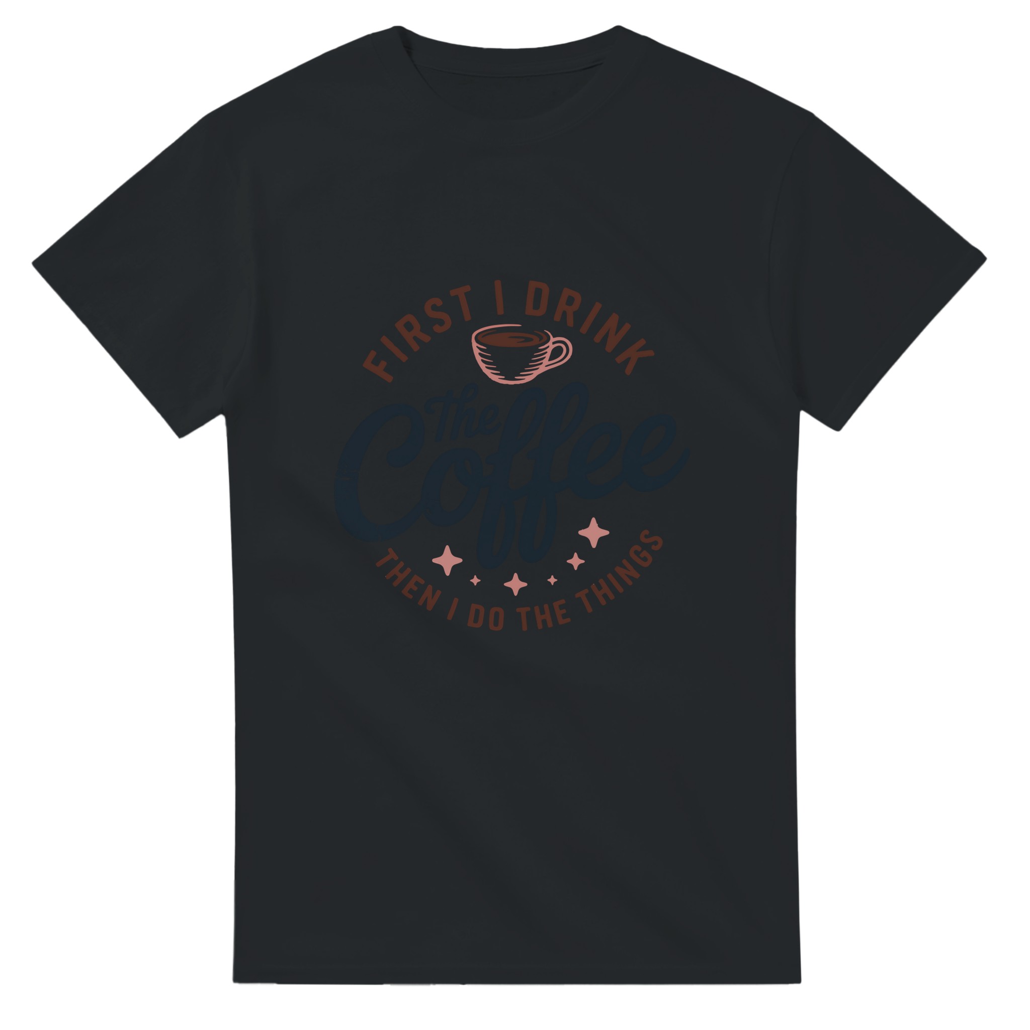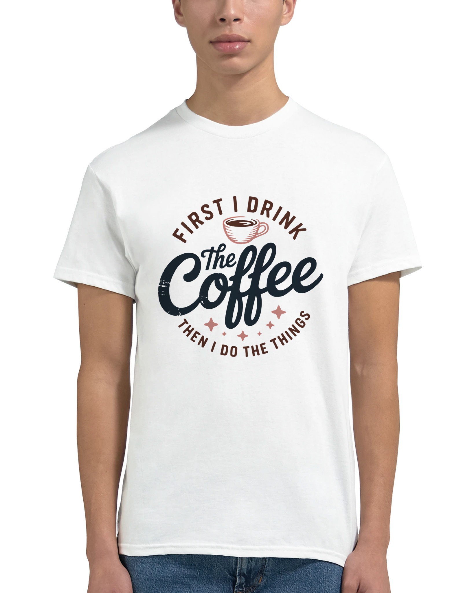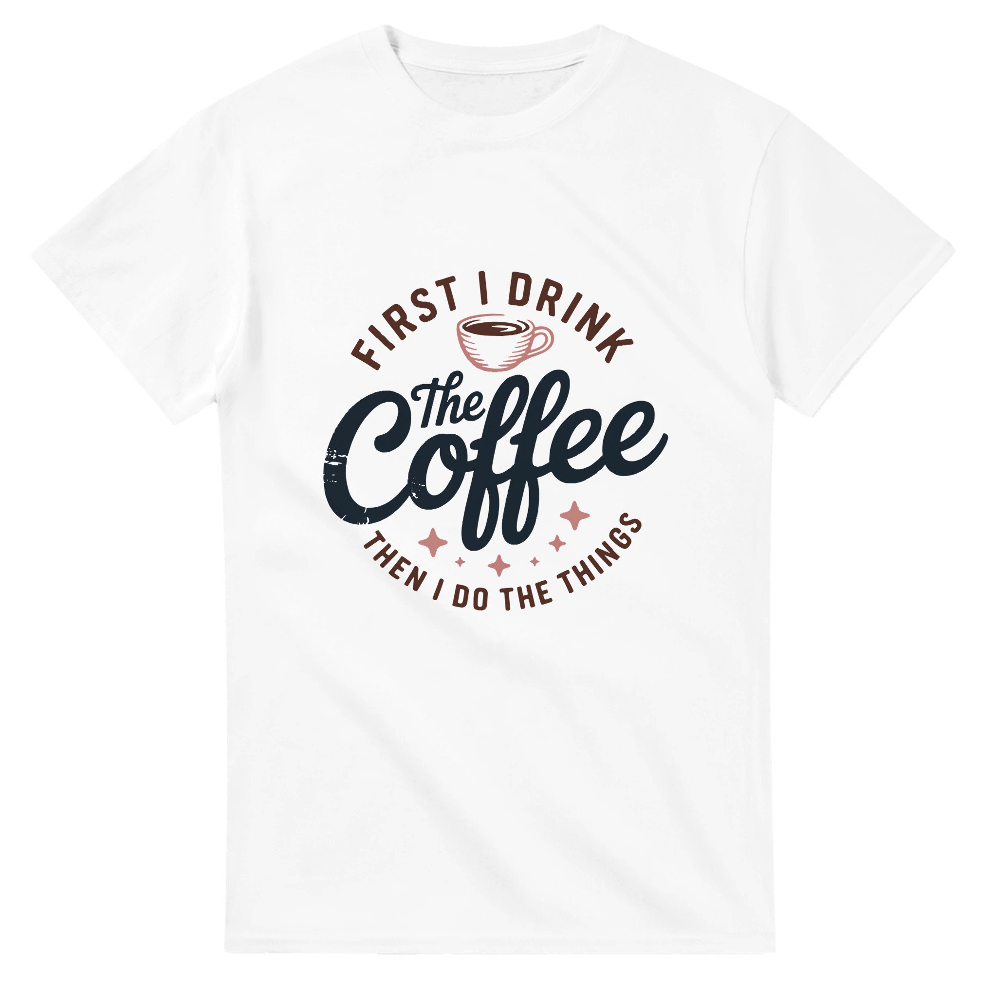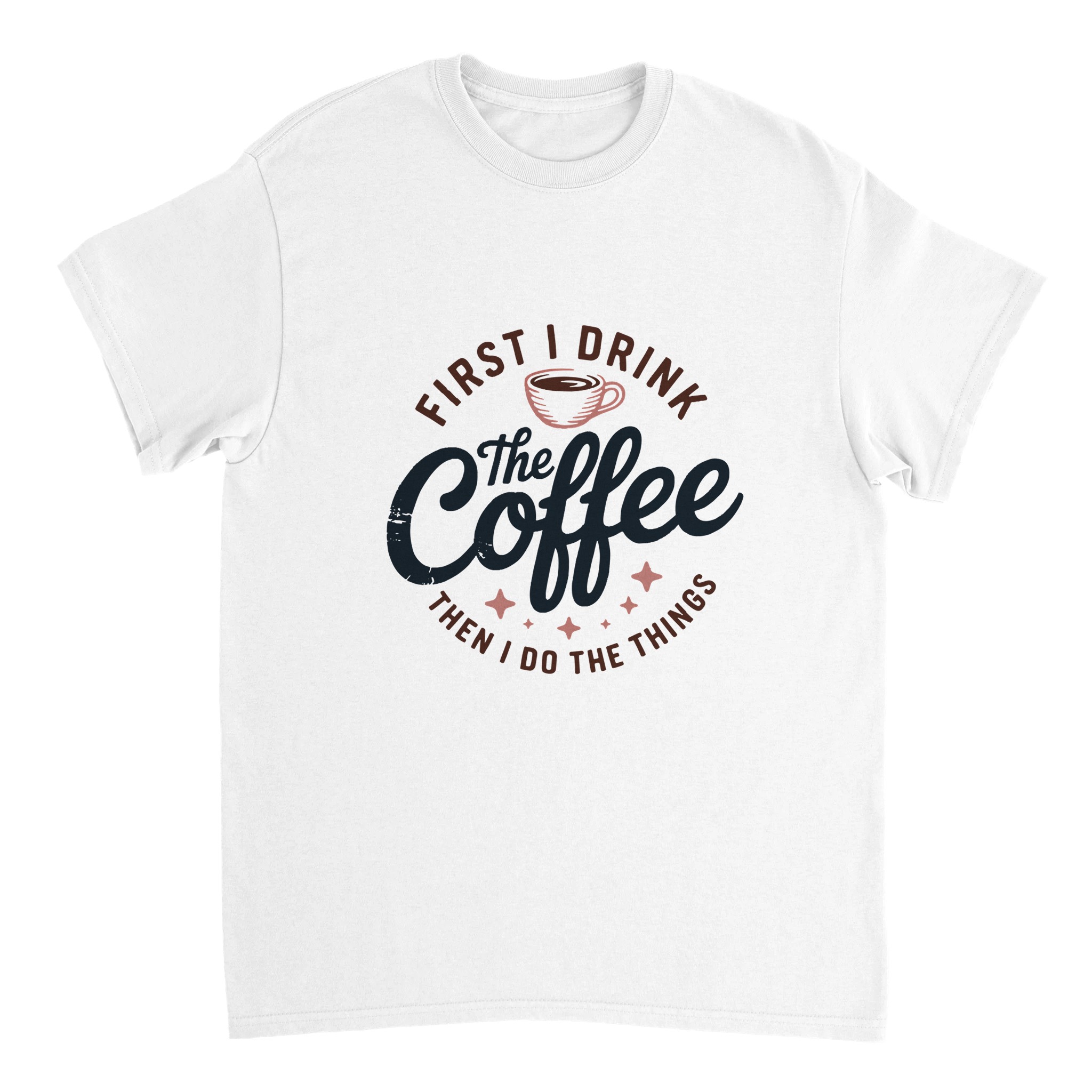 Klassisk Bomulls-T-shirt – ‘First I Drink Coffee Then I Do The Things’ – Unisex, Slitstark Design för Vardags och Tryck