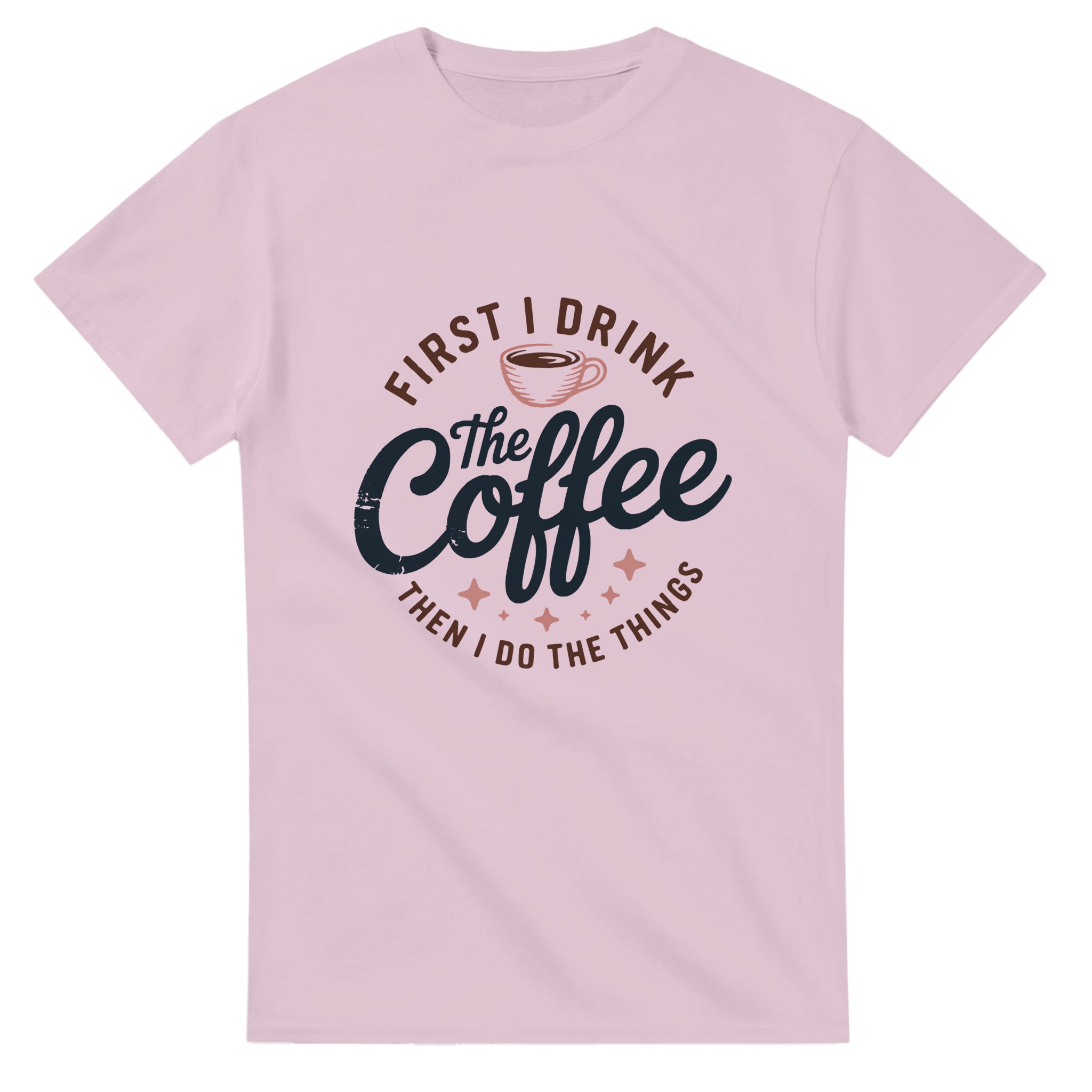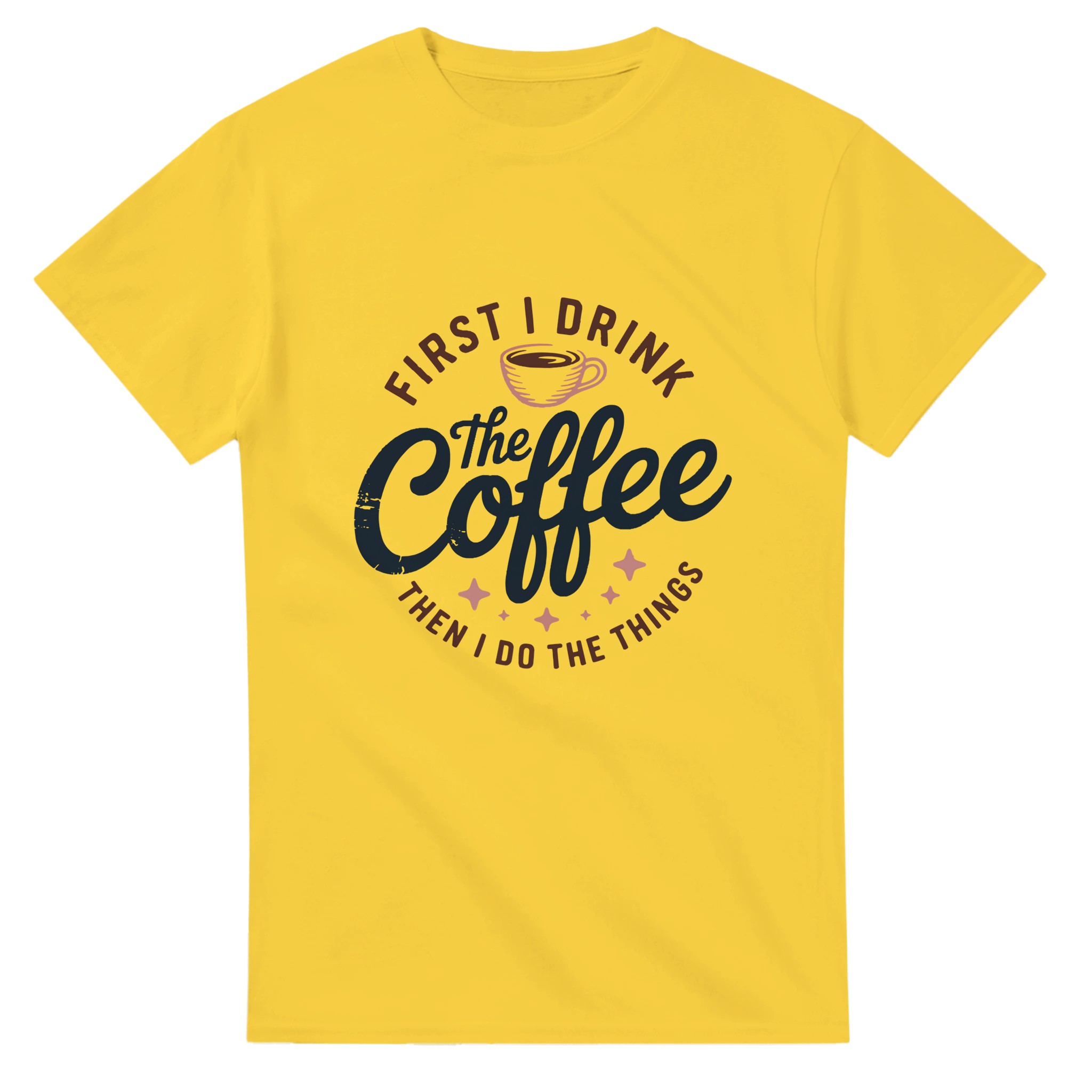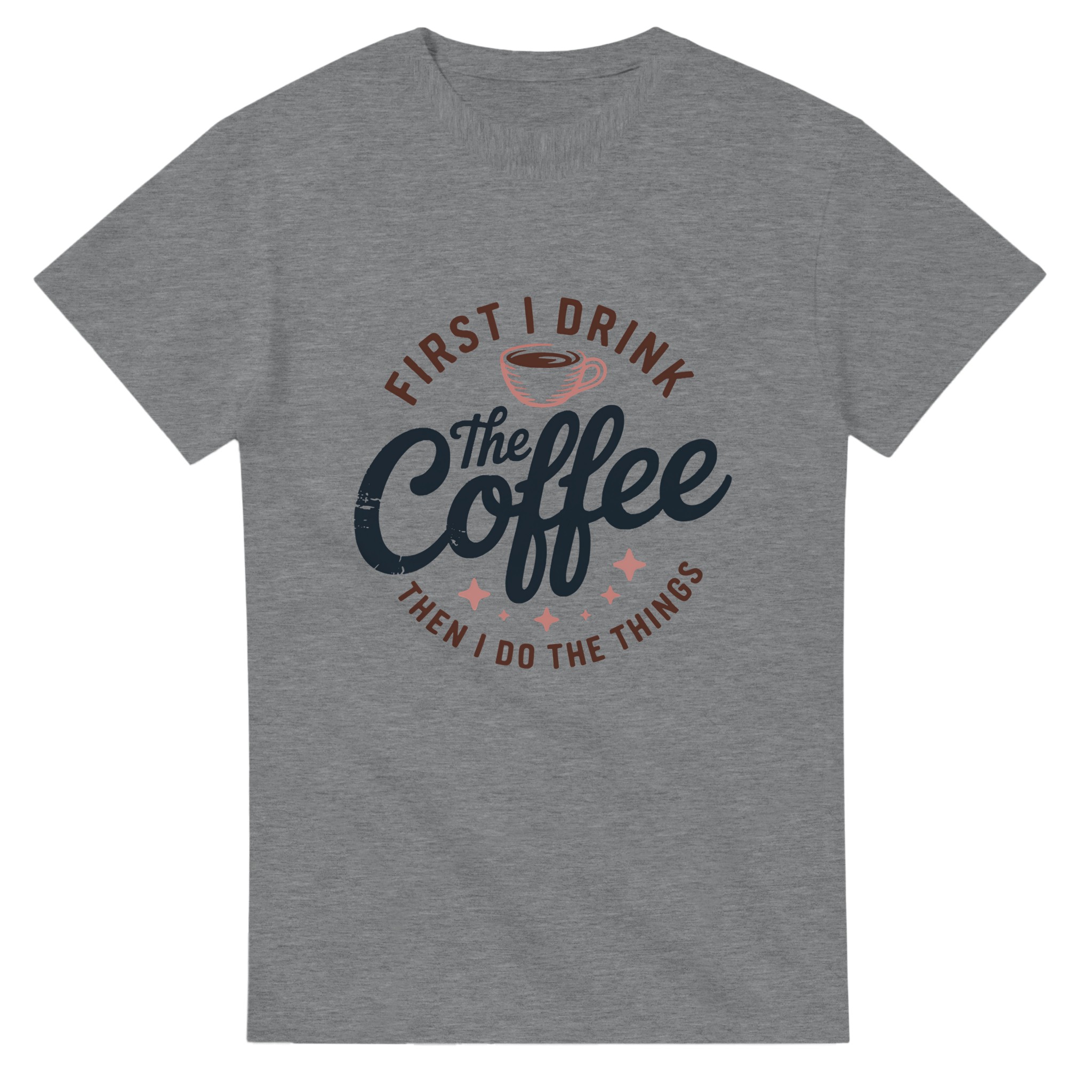 Klassisk Bomulls-T-shirt – ‘First I Drink Coffee Then I Do The Things’ – Unisex, Slitstark Design för Vardags och Tryck