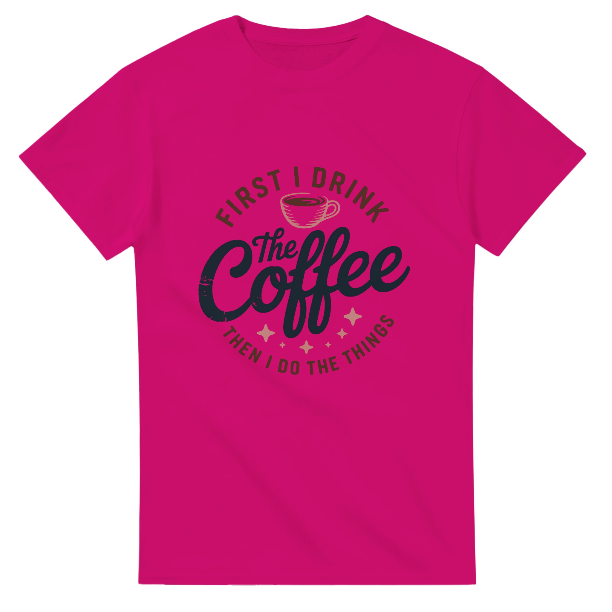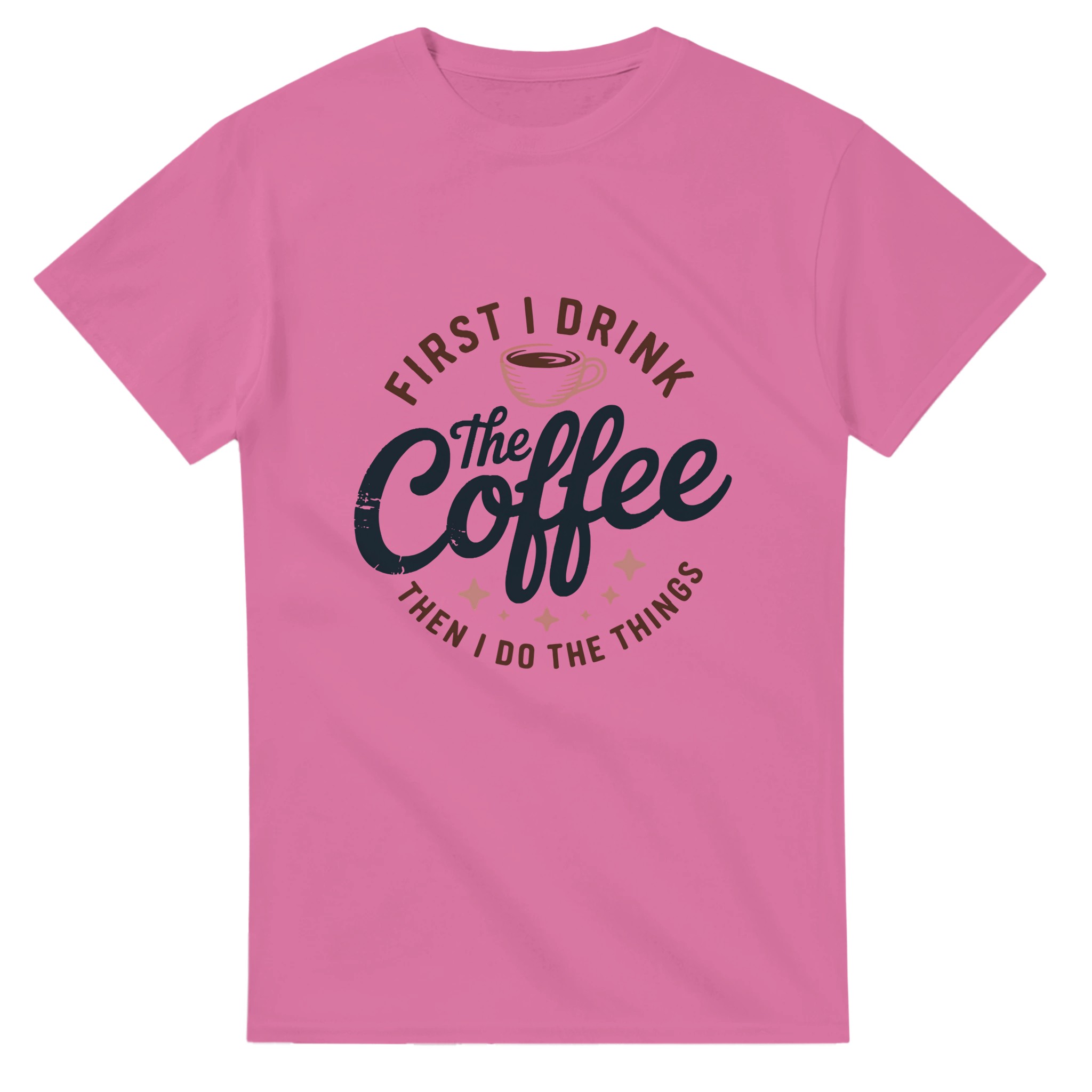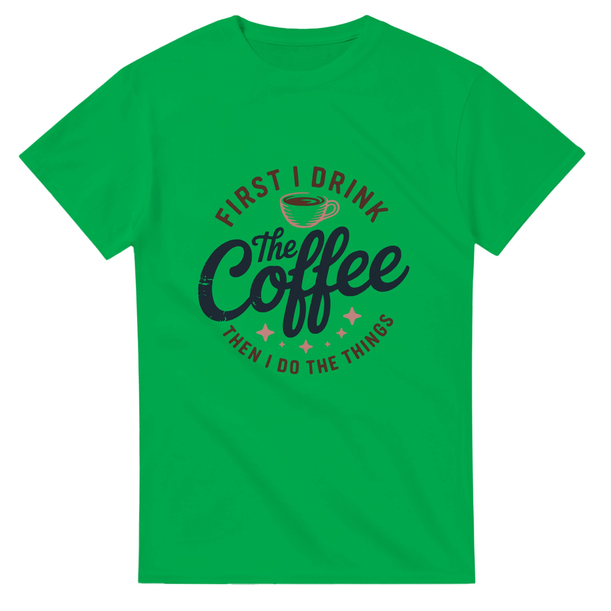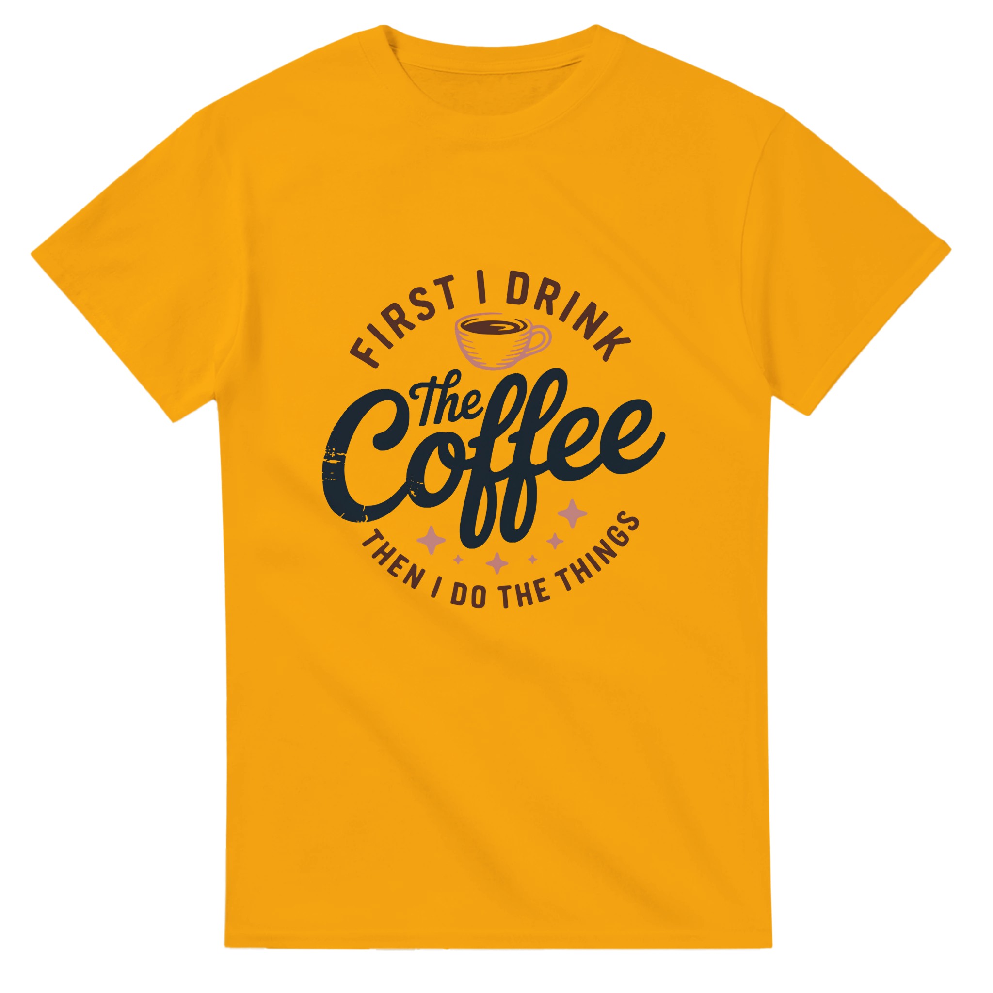 Klassisk Bomulls-T-shirt – ‘First I Drink Coffee Then I Do The Things’ – Unisex, Slitstark Design för Vardags och Tryck